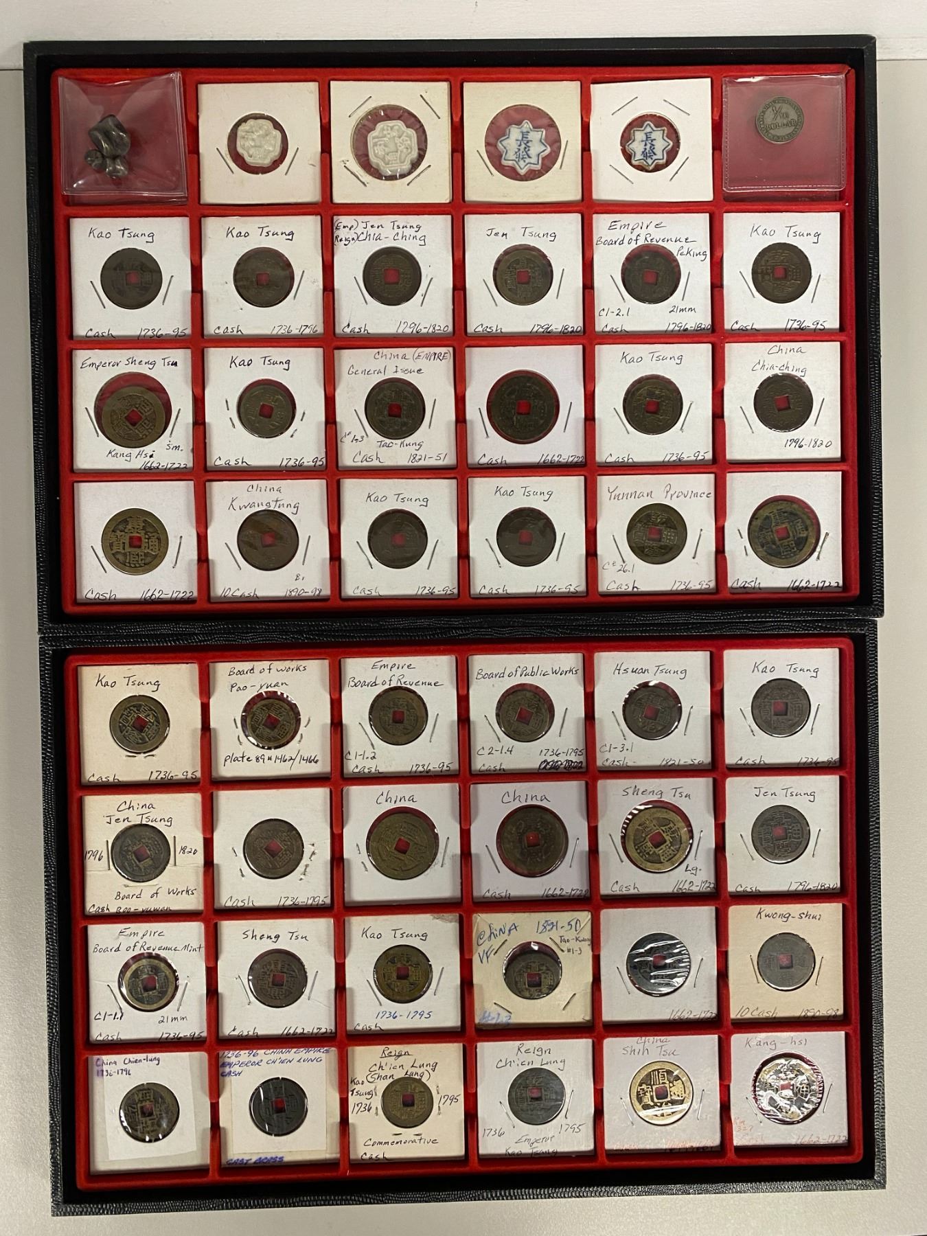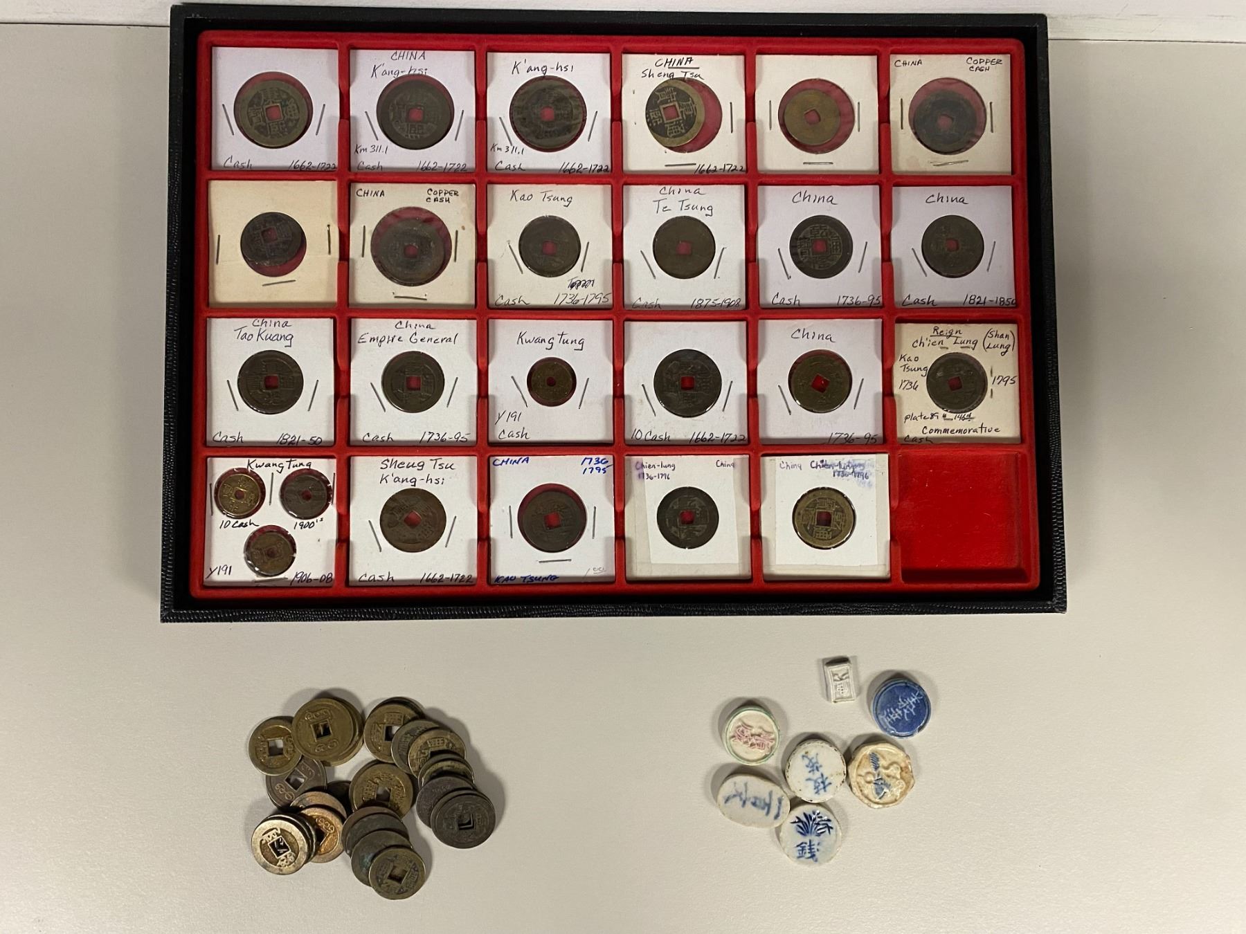 ASIA: LOT of 101 items, including Thailand (14, including eleven porcelain gambling tokens of various colors and designs, and three silver bullet money, incl. Rama IV baht with pra tao stamp and two pre-Rattanakosin fractions), Netherland East Indies (Asahan Tabak Maatschappij "Silau" 1/10 dollar token, L&W-25), East Asia (84 cash coins, almost all from various emperors of Qing China), Tibet (2 AE sho coins); retail value $350, lot of 101 pieces.