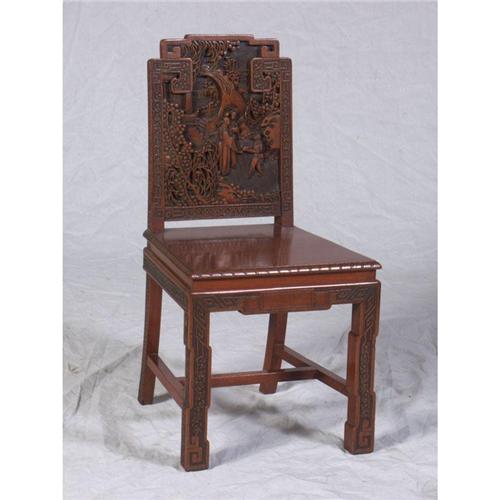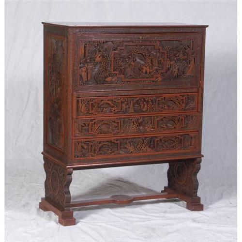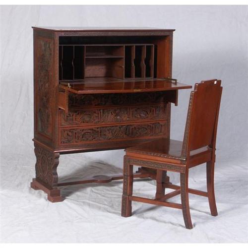 DESK AND CHAIR: Asian carved desk on stand and side chair, desk with drop front enclosing fitted interior. 45''h x 26''d x 36''w