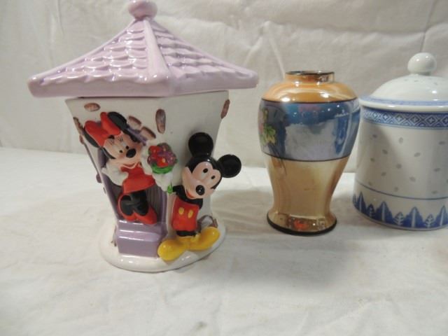 GREAT LOT OF ASIAN INSPIRED JAPAN CHINESE PIECES WITH COVERED TEA CUPS, SMALL ASIAN VASE, AND MICKEY MOUSE ASIAN PIECE AS WELL. AS SHOWN.