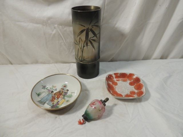 NICE BAMBOO ASIAN VASE, TWO CHINESE PLATES OR DISHES, AND COOL ASIAN INSPIRED LIGHT BULB! AS SHOWN.