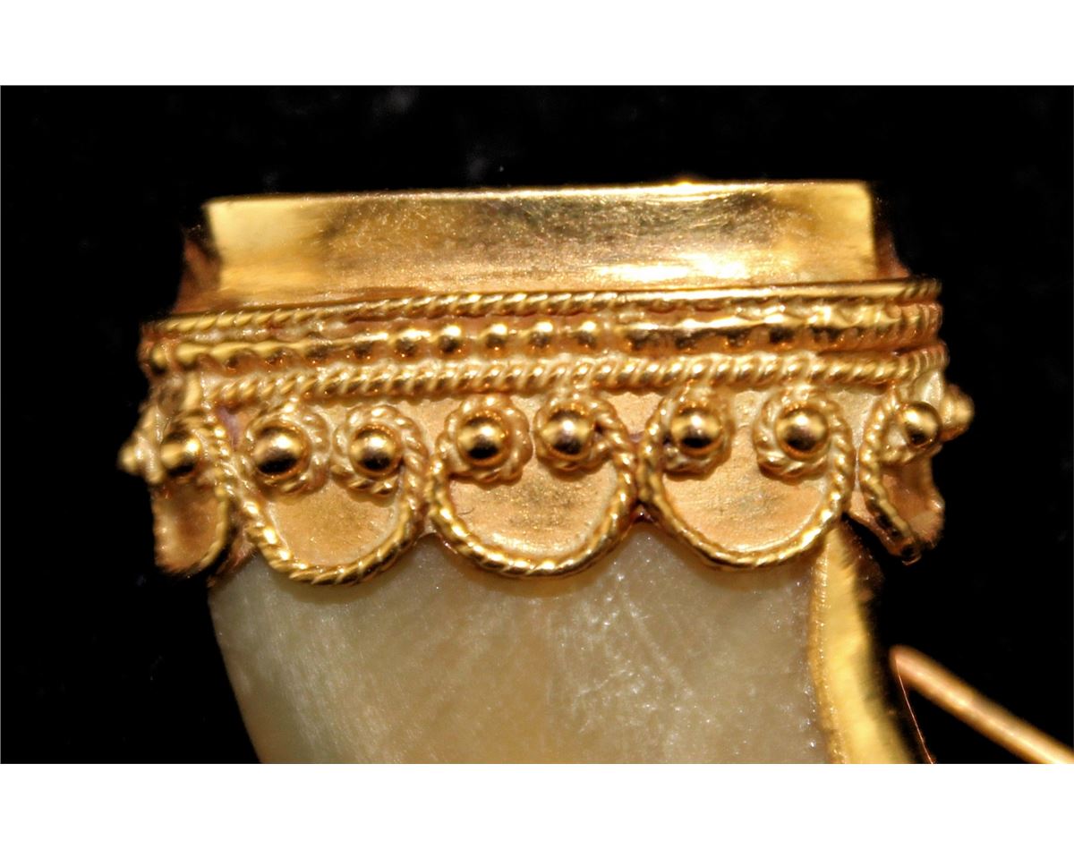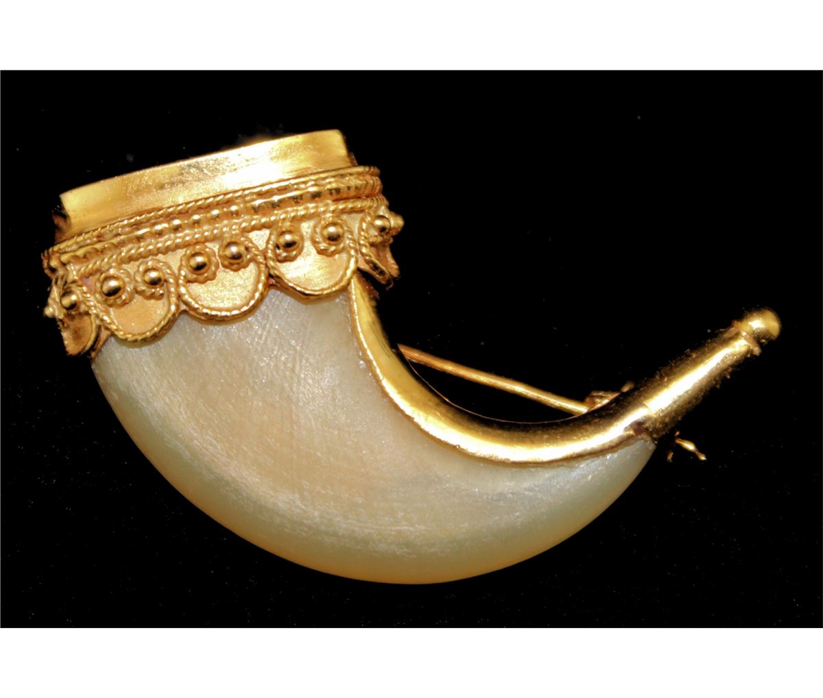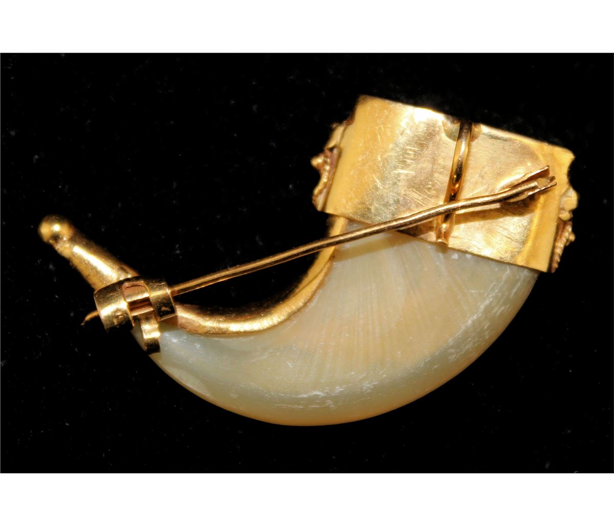 probably Indian, mid 20th century. The natural claw with filigree gold mount set with both suspension ring and pin back. Length, 1.75 inches Total weight, 9.5 grams