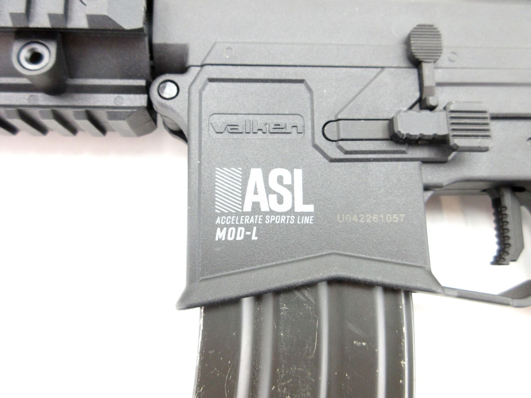 (1) 6MM BB, BATTERY POWERED ACTION, MAG, POLYMER & ALLOY CONSTRUCTION, MARKED "ASL", "MOD L", "VALKEN", ETC., NOT FULLY TESTED, SHOWS SOME WEAR / TEAR, WITH ADJUSTABLE FOLDING FRONT & REAR SIGHTS, COLLAPSIBLE STOCK, VARIOUS RAILS ATTACHED. SEE PHOTOS.