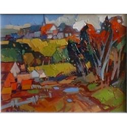 ASLANIAN, Bedros, 1937- . "Laurentian Village in Autumn". Huile sur panneau, signée. Oil on board, signed. 8" x 10" - 20.2cm x 25.4cm. $350/450