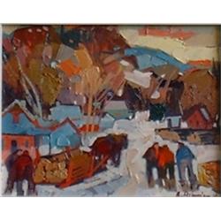 ASLANIAN, Bedros, 1937- . "The Logging Team". Huile sur panneau, signée. Oil on board, signed. 8" x 10" - 20.2cm x 25.4cm. $350/450