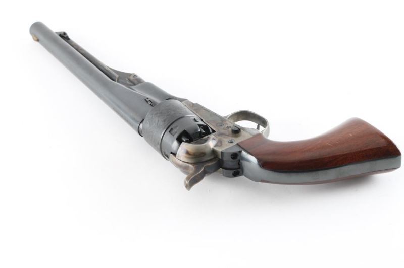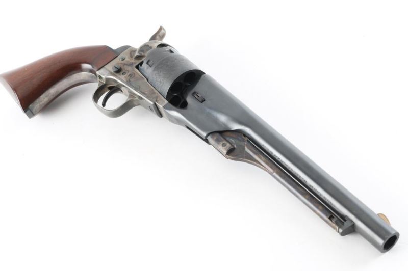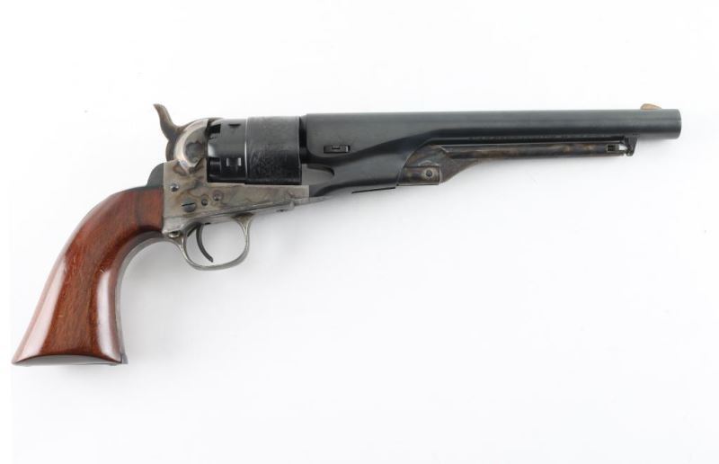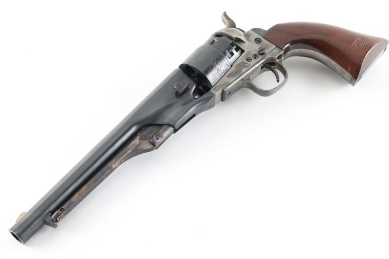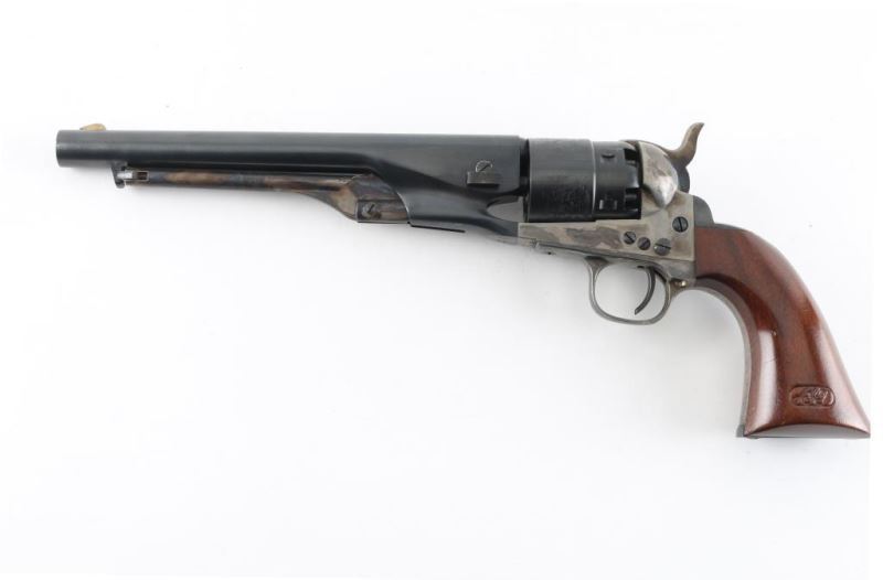 Italian made copy of 1860 Army in .44 caliber and not in 36. Single action. Blued finish, smooth wood grips, open top frame, case colored frame, hammer and ejector rod, with engraved cylinder of Naval battle scene. The 8" round barrel has a brass blade front sight. Case colors are faded. The wood grips are fine with initials on the left side. Metal finish looks good but does show some signs of use but little wear. Bore looks good but dusty. Condition is NRA Very Good. Antique Firearm