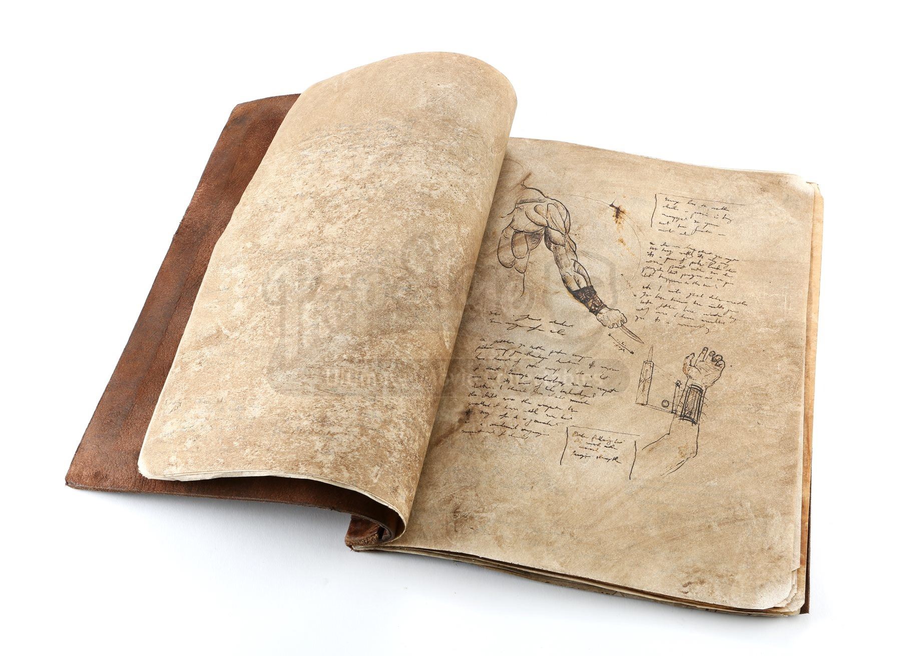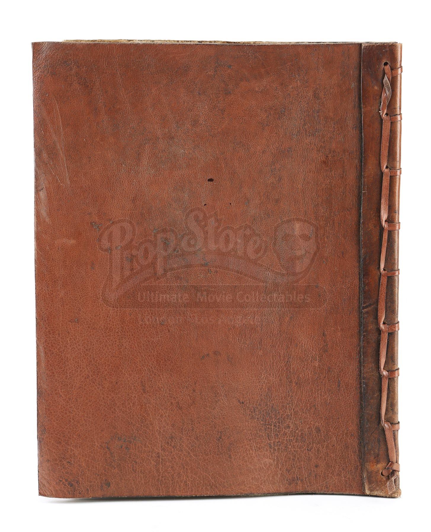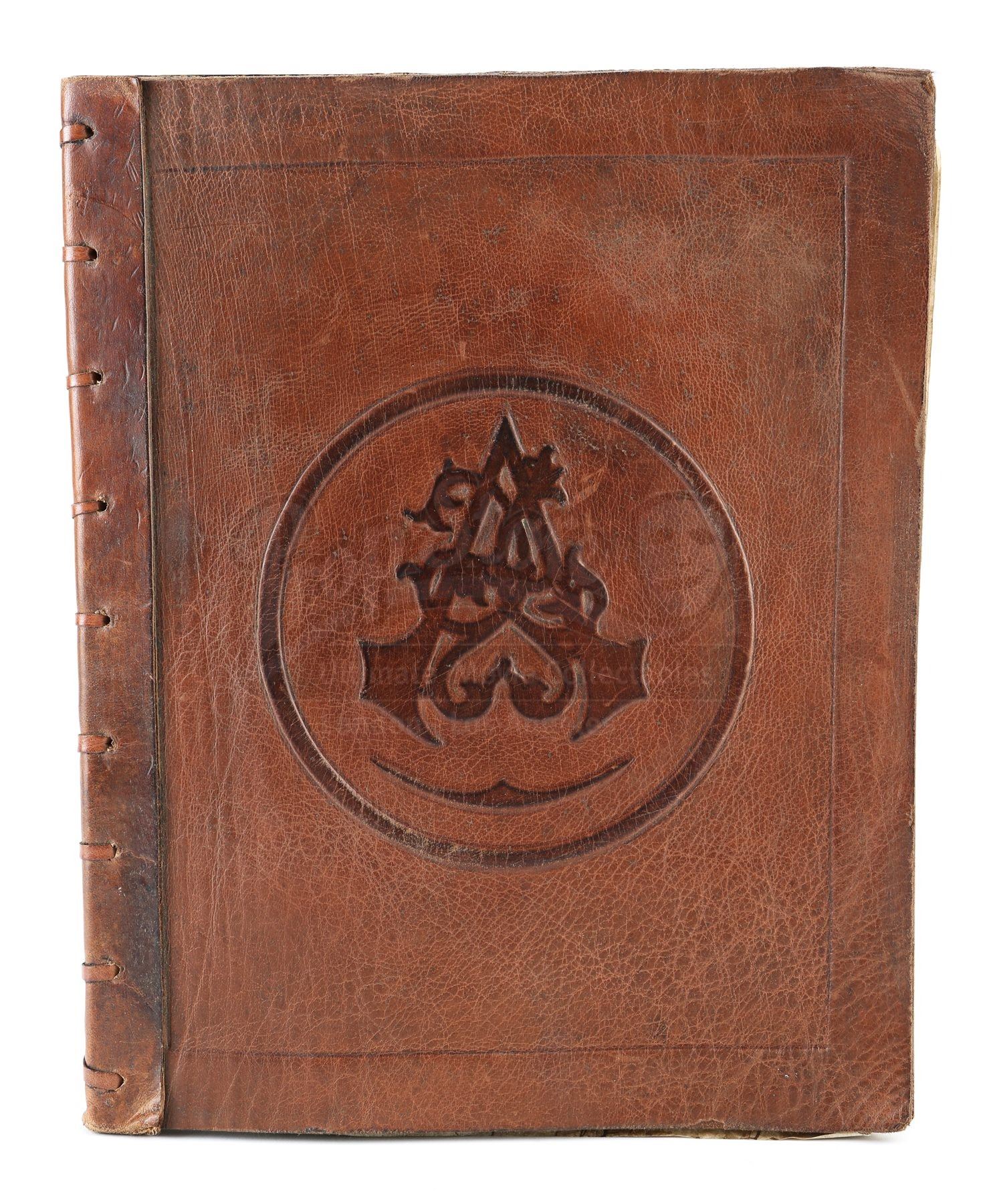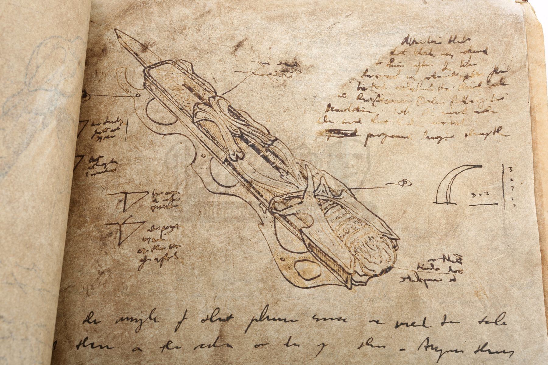 The book is made of leather and parchment paper, with the front cover stamped with the Assassin’s Brotherhood insignia. Thirty-one parchment pages are bound inside, featuring alternating printed pages that present hand-drawn illustrations of the assassins’ hidden-blade weapon. The book is distressed to appear old and worn, but remains in very fine condition. Dimensions: 27 cm x 2 cm x 34 cm (10 ¾” x ¾” x 13 ¼”).