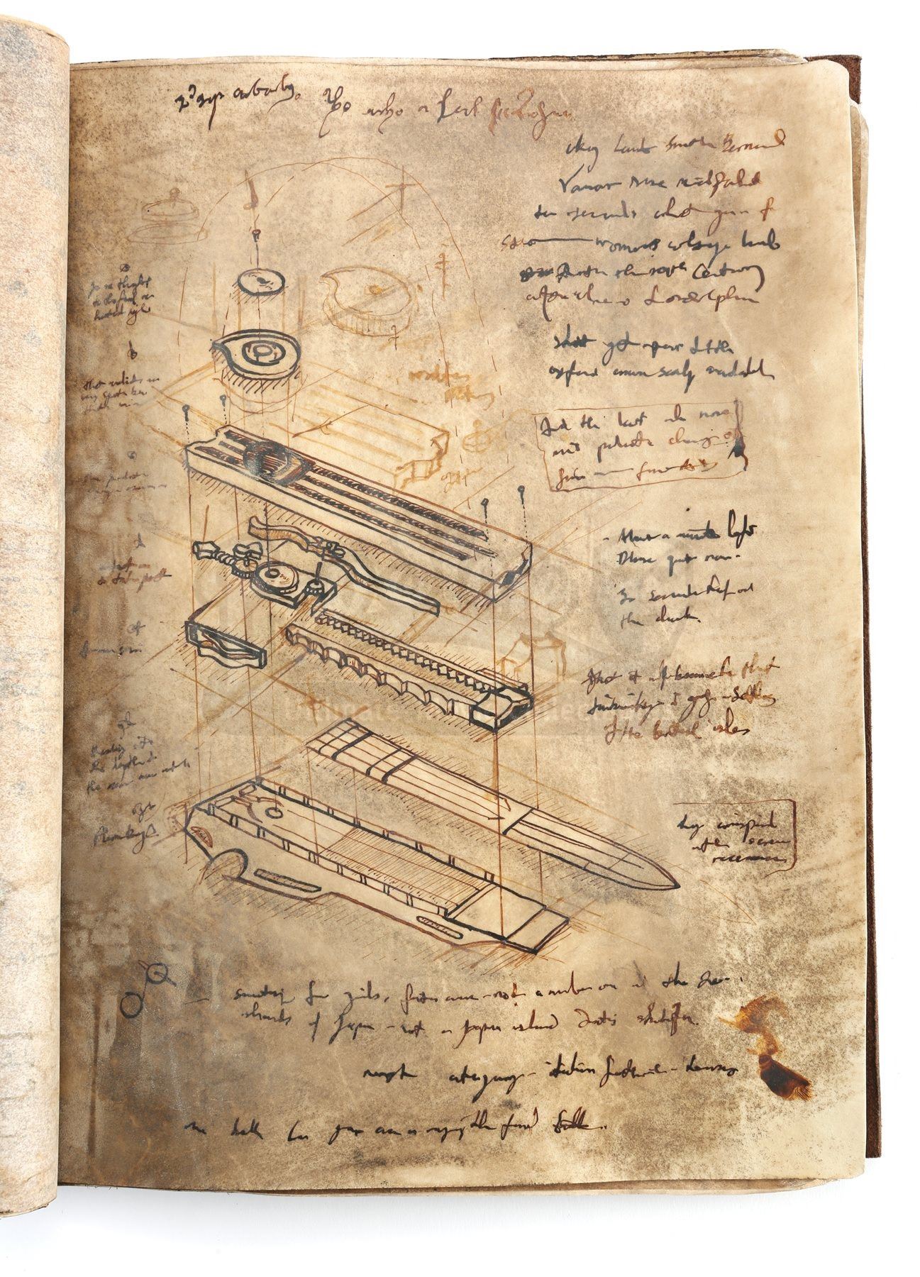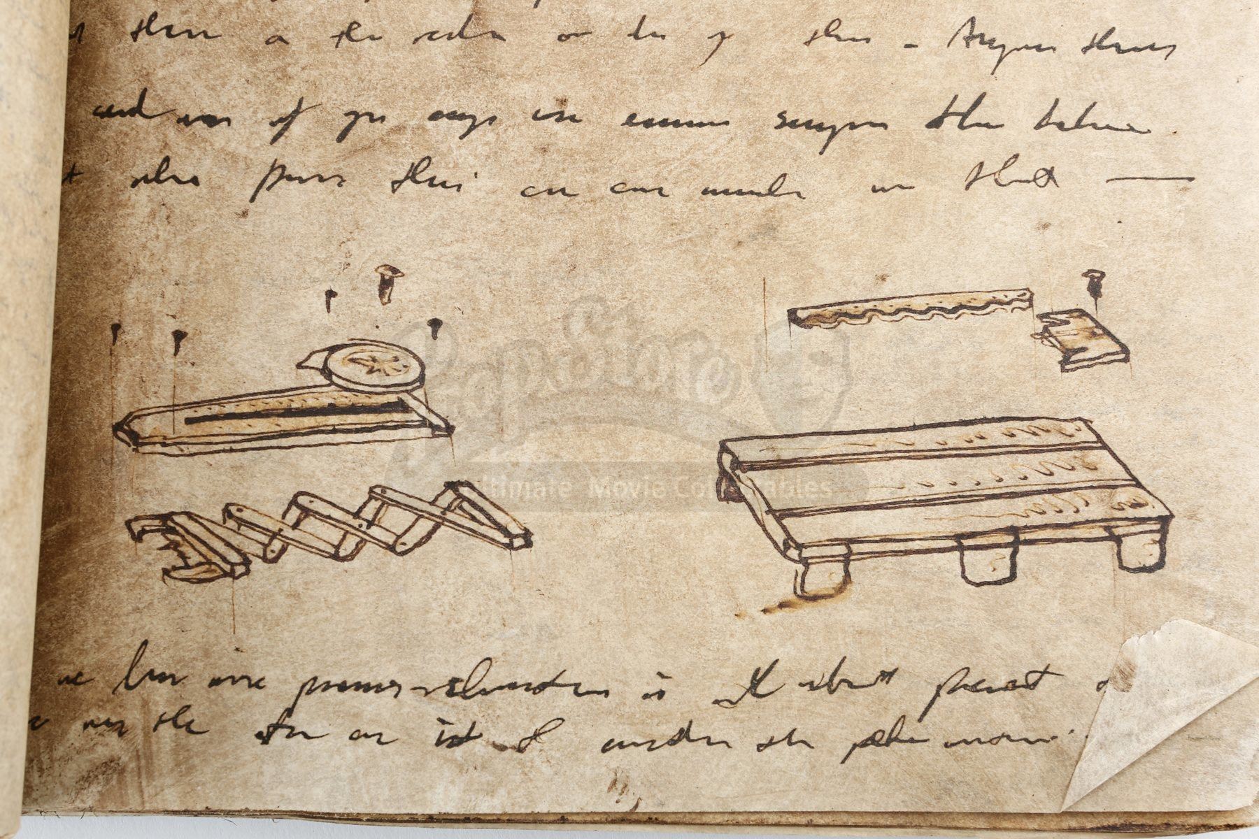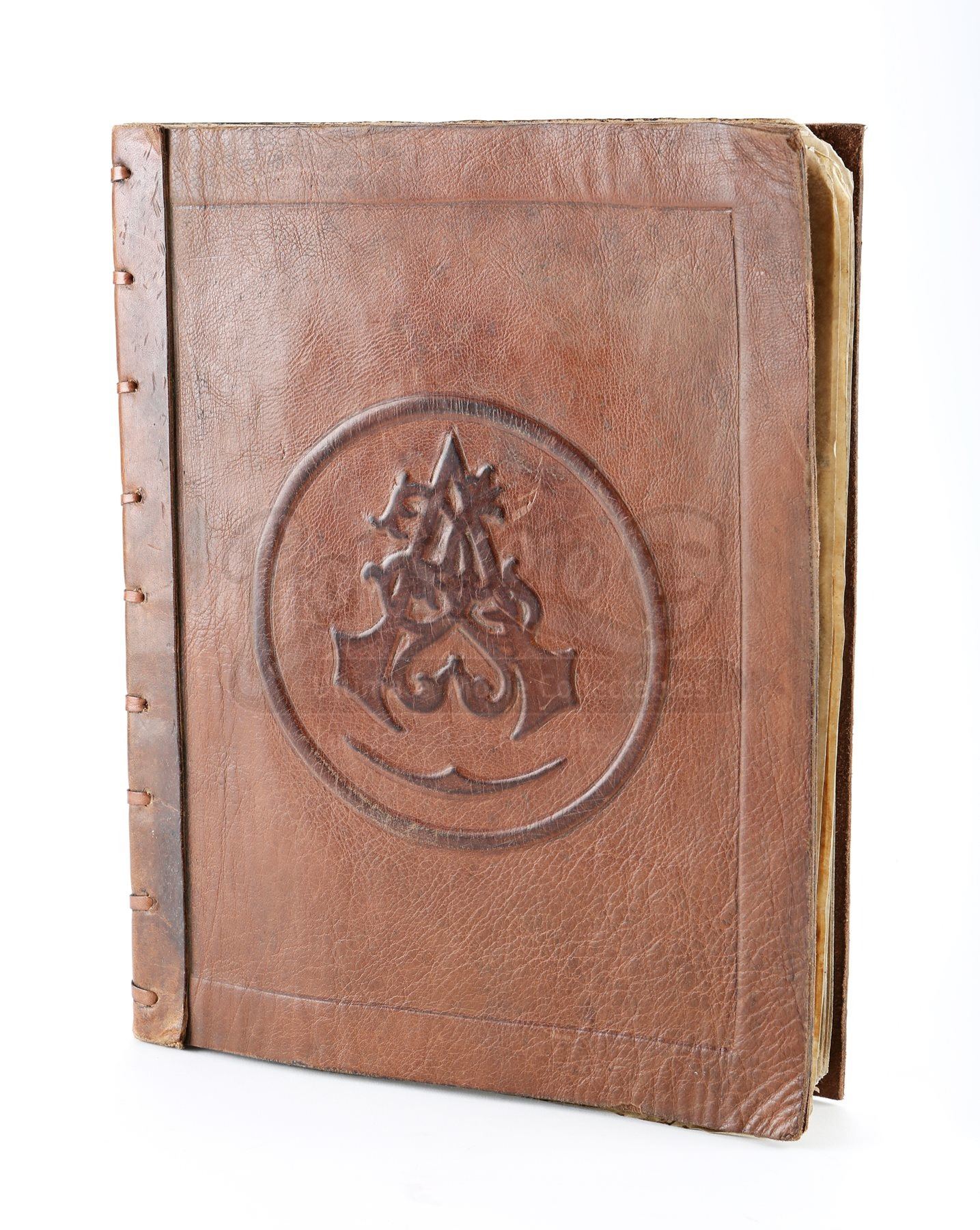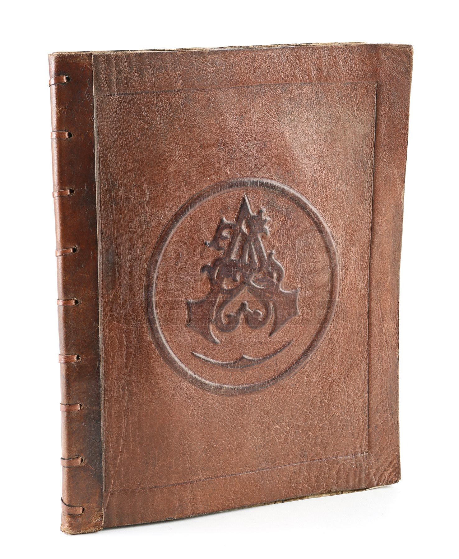 The book is made of leather and parchment paper, with the front cover stamped with the Assassin’s Brotherhood insignia. Thirty-one parchment pages are bound inside, featuring alternating printed pages that present hand-drawn illustrations of the assassins’ hidden-blade weapon. The book is distressed to appear old and worn, but remains in very fine condition. Dimensions: 27 cm x 2 cm x 34 cm (10 ¾” x ¾” x 13 ¼”).