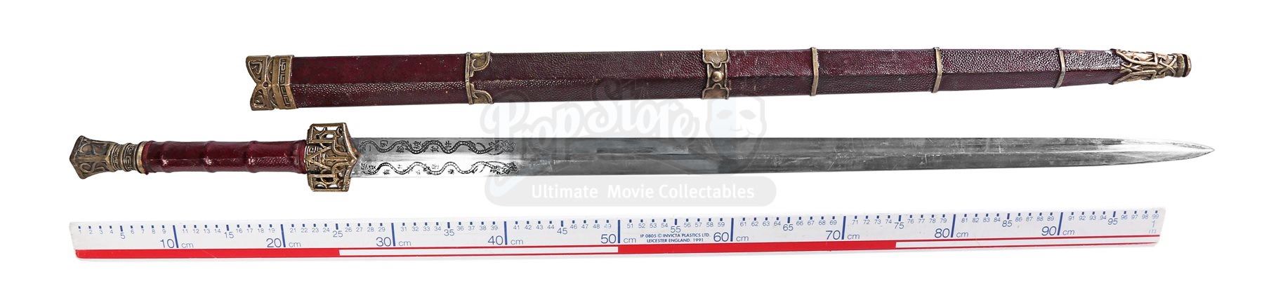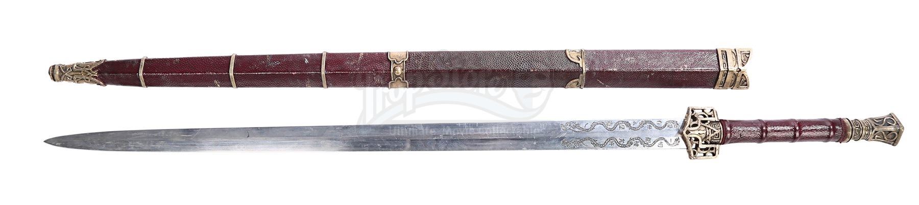 The sword comprises a steel blade with cast-in Chinese dragon emblems, a resin grip and ornate metal hardware for the guard and pommel. The dark red scabbard features matching faux-gold detailing, with the Brotherhood of Assassins emblem incorporated into the design. The blade of the sword shows minor markings and scratches, and the scabbard displays wear to the paint finish from production use. Dimensions: 120 cm x 7.5cm x 4 cm (47 ¼” x 3” x 1 ¾”)