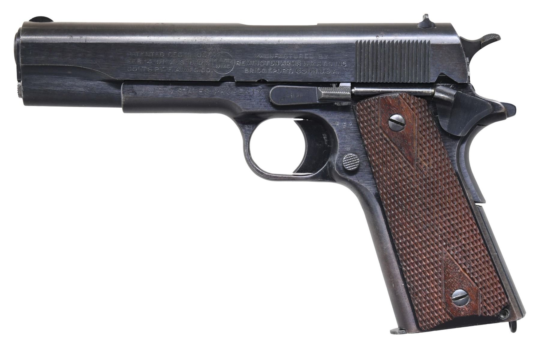 Please note as of 4/10/25 this item description has been updated. Please revisit this description and contact us with any questions. Cal. 45 ACP. S# 17705 (frame mfg. 1919). Type 16 Remington-UMC 5" barrel. Earlier production slide has Type A front sight & Type B rear sight along with "E" proof on back of slide. Brushed blued finish on slide & frame. Frame marked w/ "E.E.C." inspector proof, eagle "I38" proof on left side trigger guard bow, & eagle "S22" proof below inspector initials. Remington-UMC Type B hammer. Replacement Type 1 Mainspring housing & Type 2 pin; mainspring housing has polished blued finish. Type 3 Recoil spring plug. Type B recoil spring guide. Type A slide lock. Type C mag. release lock. Type C safety lock tab. Long trigger. Short tang grip safety. Type 1 double diamond checkered walnut grips. MAGS: 1 two tone 7 rd. in fair condition with fading blue mixed with peppery patina throughout. UNATTACHED ACCESSORIES: 1911 cord lanyard in good intact condition. CONDITION: this pistol has over 90% original brushed blue finish showing wear around slide lock & slide lock scratch. Front strap shows a mix of hand worn blue & brown patina. Mainspring housing shows deep mark & marks within pin recess. Slide blue shows spots of fading finish towards rear section of left side with sporadic spots of peppery oxidation scattered throughout slide. Very good grips with light flattening to diamonds & scattered marks. Barrel shows good strong blue with wear consistent with cycling. Bore is quite shiny with strong rifling showing minimal wear. (24-6851/MD). CURIO. $1,500-2,500.