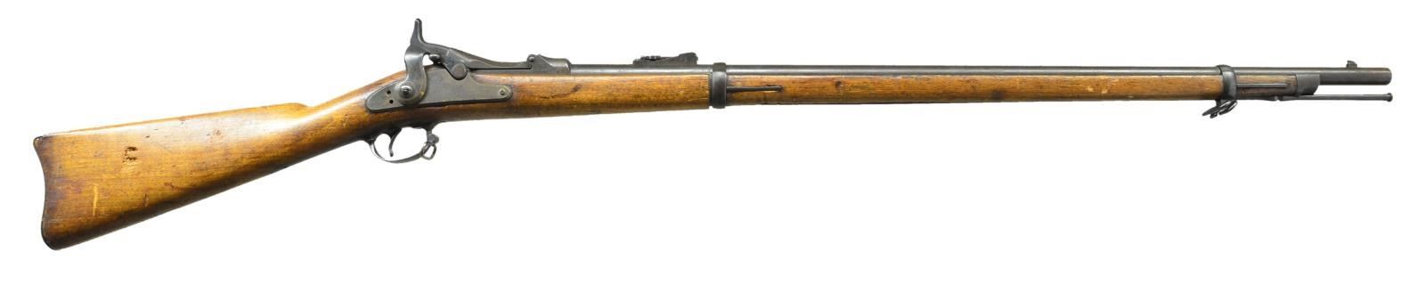 Cal 45-70. S #319161. Bbl. 32 5/8". This rifle appears to be assembled from a mix of various Trapdoor & musket parts. Lockplate is from an 1863 Springfield musket. Breechblock is from an 1879 style trapdoor. Upper tang screw is a replacement. Rear band has slot on top and is likely from a carbine model. Rear of bbl. is marked w/ Springfield proofs. 1879 rear sight graduated to 1200 yards. Blade front sight. Slotted ramrod is present. Bottom mounted sling swivels and stacking hook. Walnut stock set. Top of stock is marked "440" & left side of butt has a "14" rack number. CONDITION: sanded walnut stock has some chipping in ramrod channel, a couple deep gouges on right side of butt, couple small cracks near lock, scattered dings & handling marks. Metal is turning to a brown patina w/ scattered oxidation & a few spots of light pitting. Worn bore w/ scattered pitting. (01-21113/MJC). ANTIQUE. $400-600.