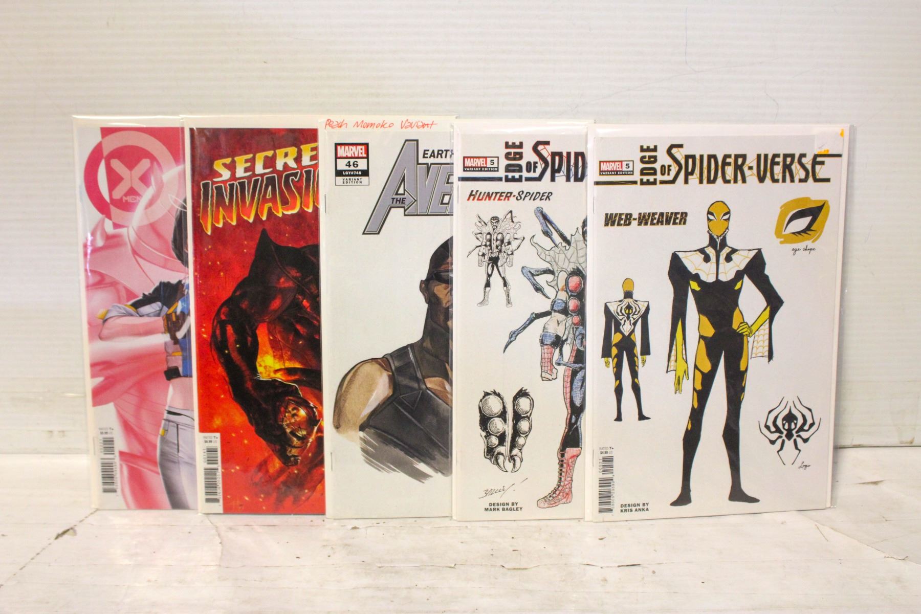 ALL VARIANT COVERS, XMEN, AVENGERS, SECRET INVASION AND EDGE OF THE SPIDERVERSE AMONG THE TITLES. COME BAGGED AND BOARDED
