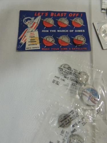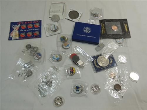 ASSORT BOX LOT: PAINTED STATE QUATERS, 2 HEAD KENNEDY HALF DOLLAR, IKE DOLLAR, SOME TOKENS & MEDALLIONS. AS SHOWN. VIEW PICTURE FOR DETAIL.