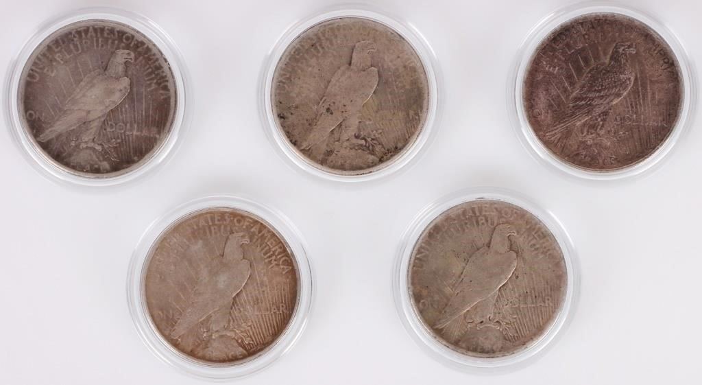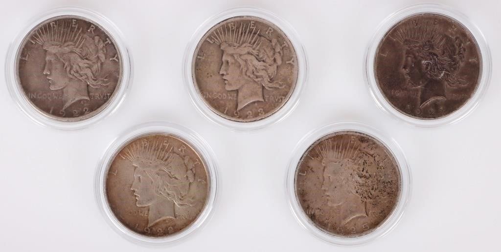 Assorted 0.9 silver Liberty Peace dollars to include one 1922 S Peace dollar, two 1922 P Normal Relief Peace dollars, one 1923 P Peace dollar, and one 1925 P Peace dollar. All coins have protective casing.