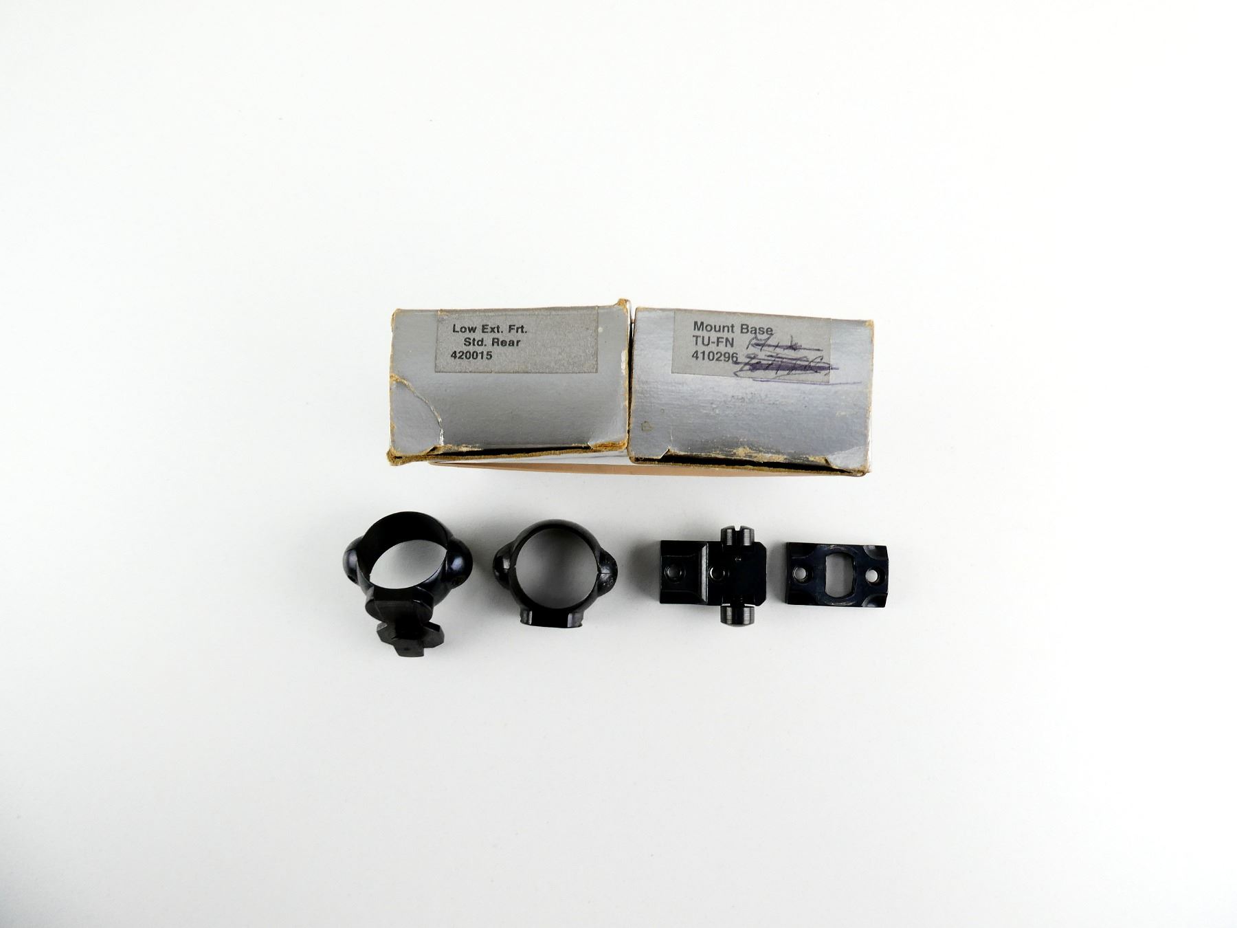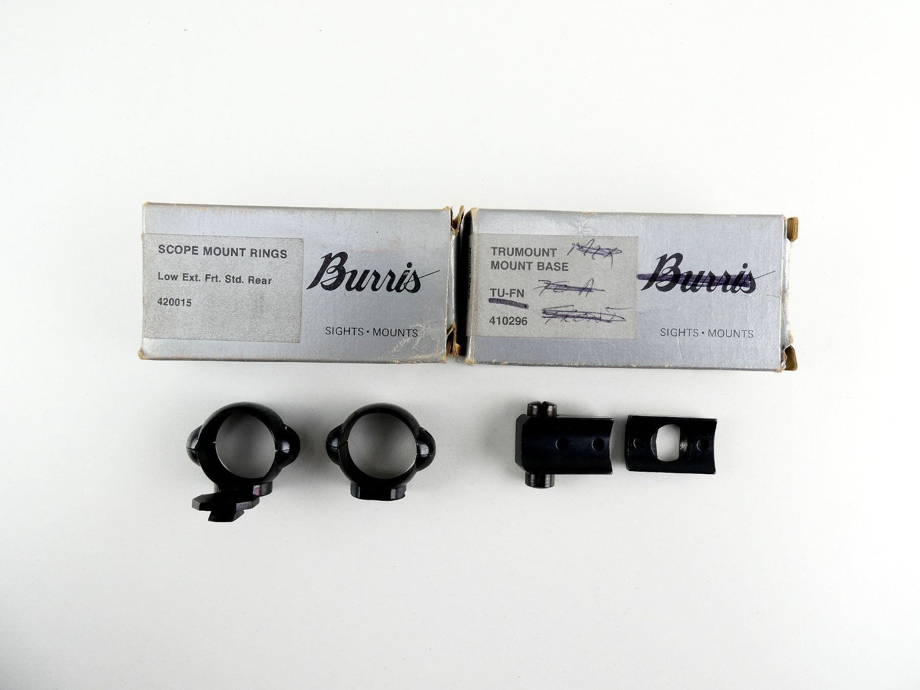 LOT INCLUDES; (1) SET OF BURRIS 1" LOW SCOPE RINGS, BLACK STEEL, PART #: 420015, APPEARS NOS IN ORIGINAL PACKAGING, MAY NOT BE COMPLETE & (1) SET OF SCOPE MOUNT BASES, BLACK STEEL, POSSIBLY PART #:BURRIS TU-FN, 410296 ?. MAY REQUIRE FITTING. SEE PHOTOS.