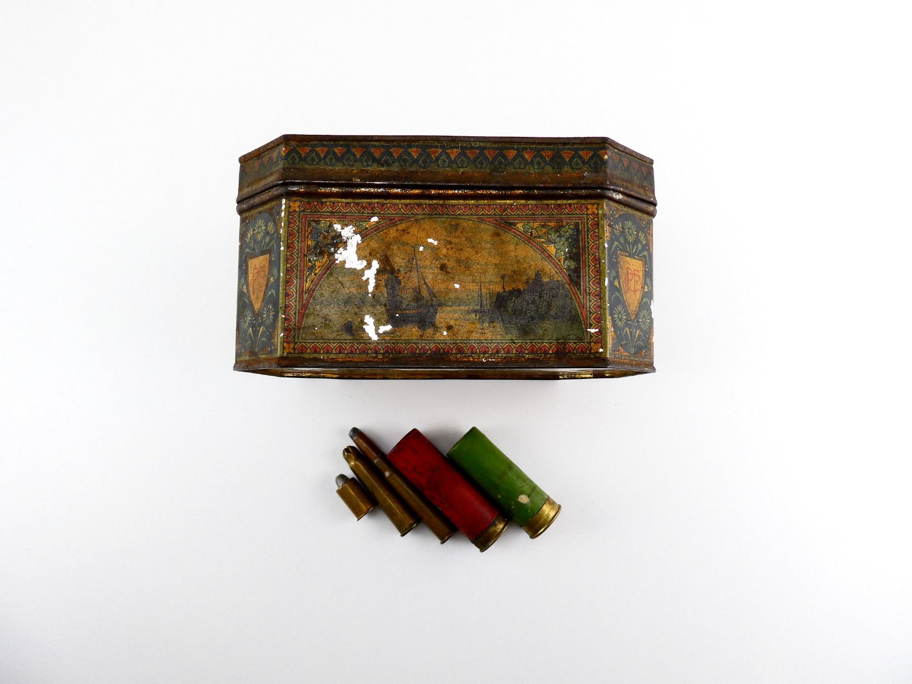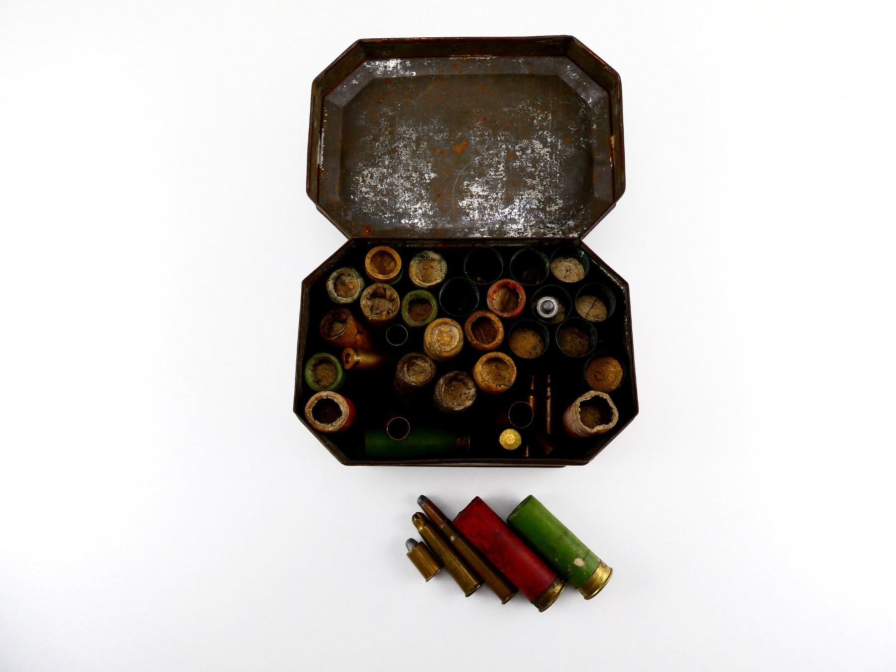 LOT INCLUDES; APPROX. (34) RNDS, VARIOUS MANUFACTURERS INCLUDING; DOMINION, DMC, ETC., SOME DAMAGE, (3) NON-PRIMED BRASS CASES, ETC., (1) METAL TIN.