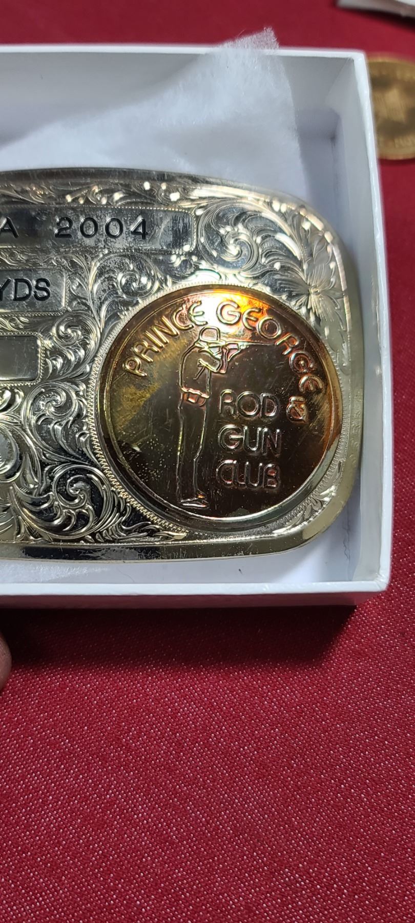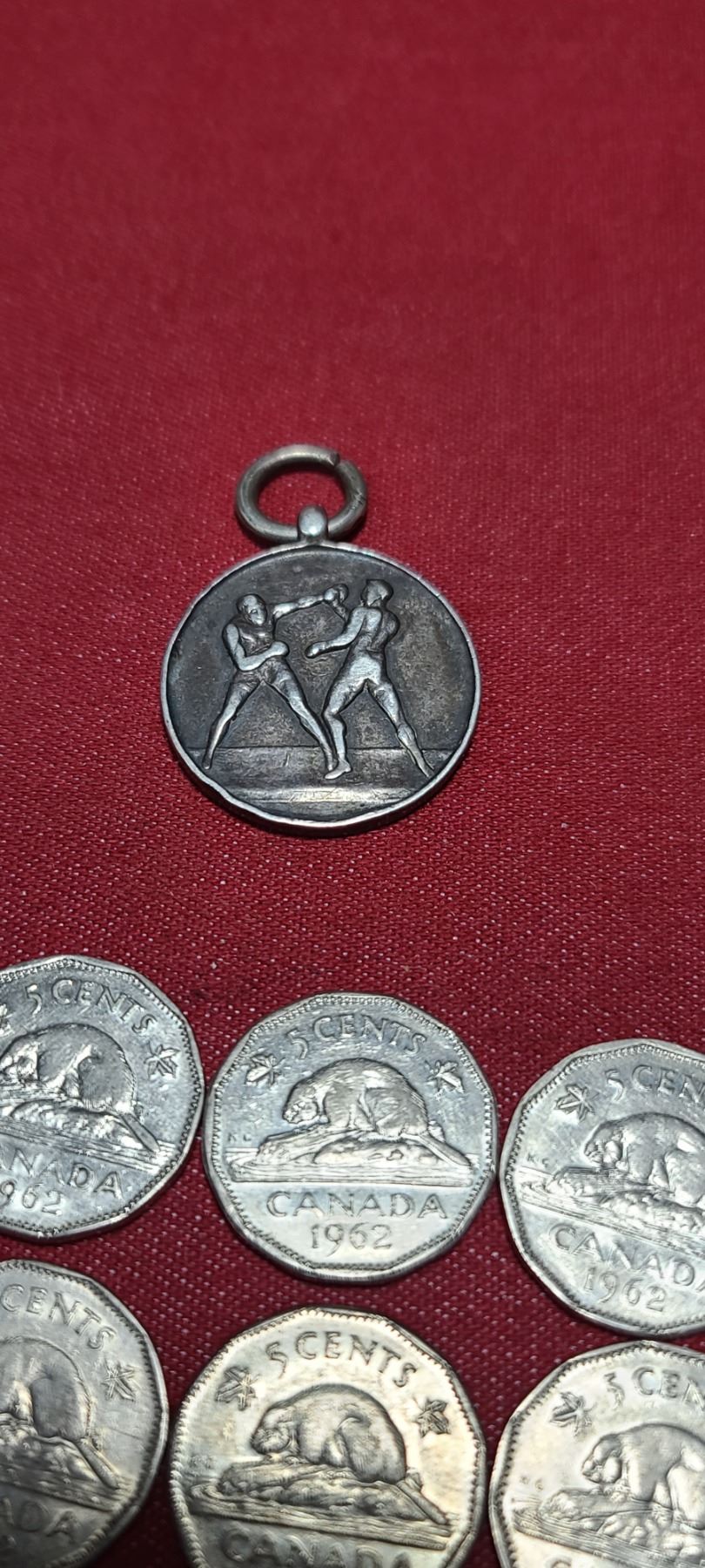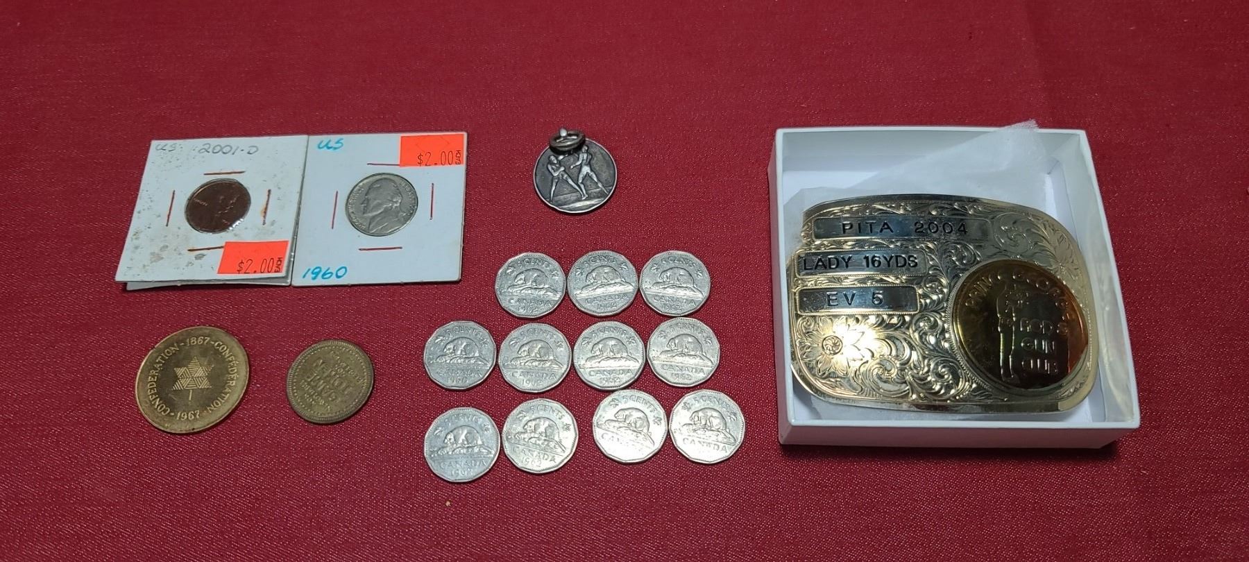 ASSORTED: 11 N962 NICKELS, BOXING MEDAL, TOKENS AND PRINCE GEORGE GUN CLUB PITA 2004 BELT BUCKLE