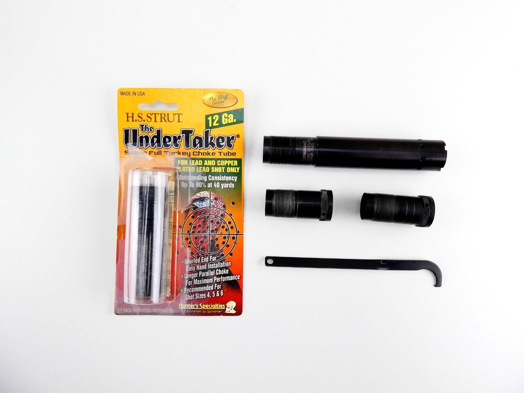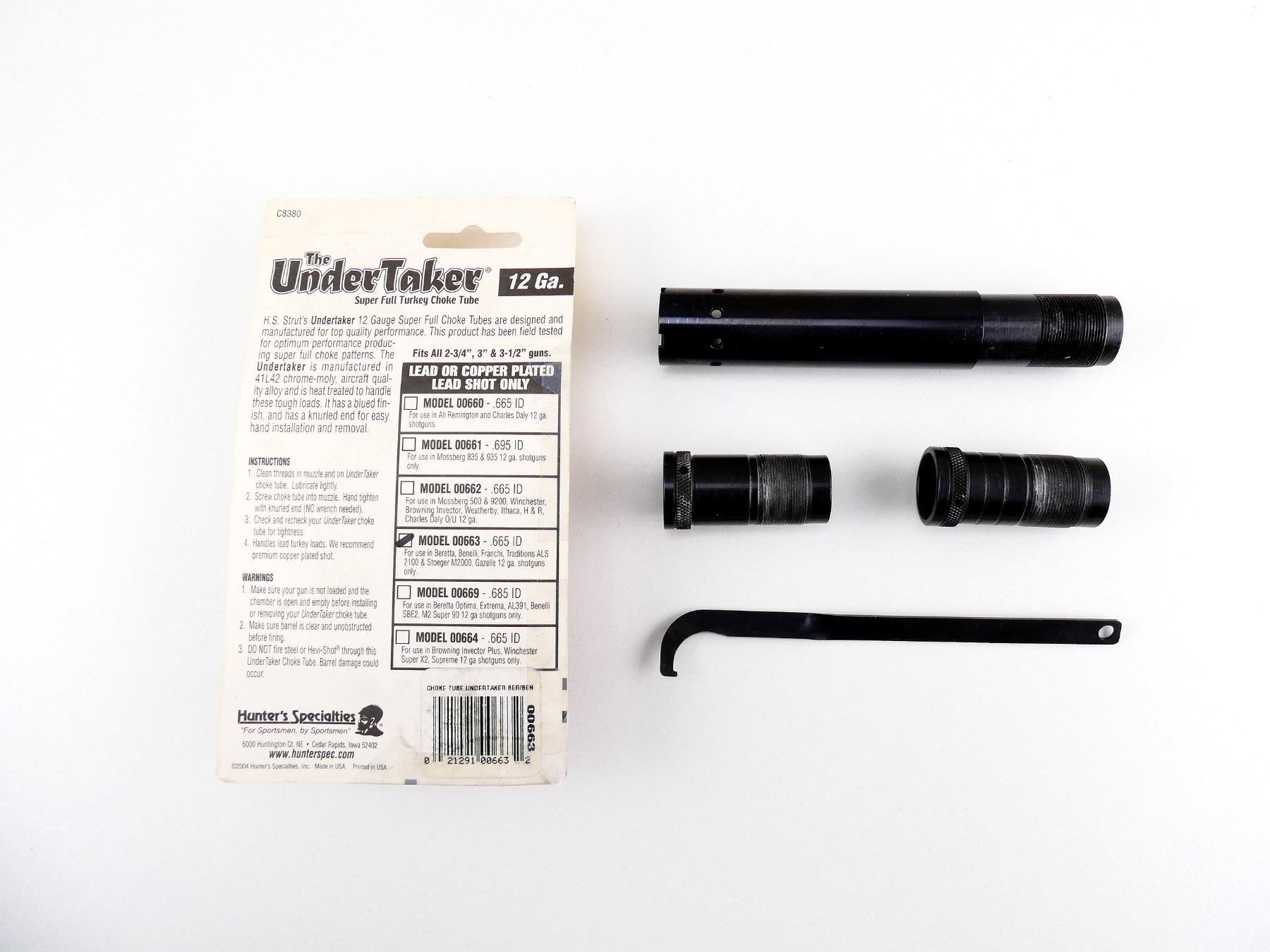 LOT INCLUDES; (1) WINCHESTER 12 G. INVECTOR FULL CHOKE, (1) WINCHESTER 12 G. INVECTOR MOD. CHOKE, (1) BROWNING 12 G. FULLY RIFLED EXTENDED CHOKE, (1) H.S. STRUT THE UNDERTAKER 12 GAUGE SUPER FULL TURKEY CHOKE, CONSIGNOR STATES: "NOS" & (1) 12 G. CHOKE WRENCH. MAY REQUIRE FITTING. SEE PHOTOS.