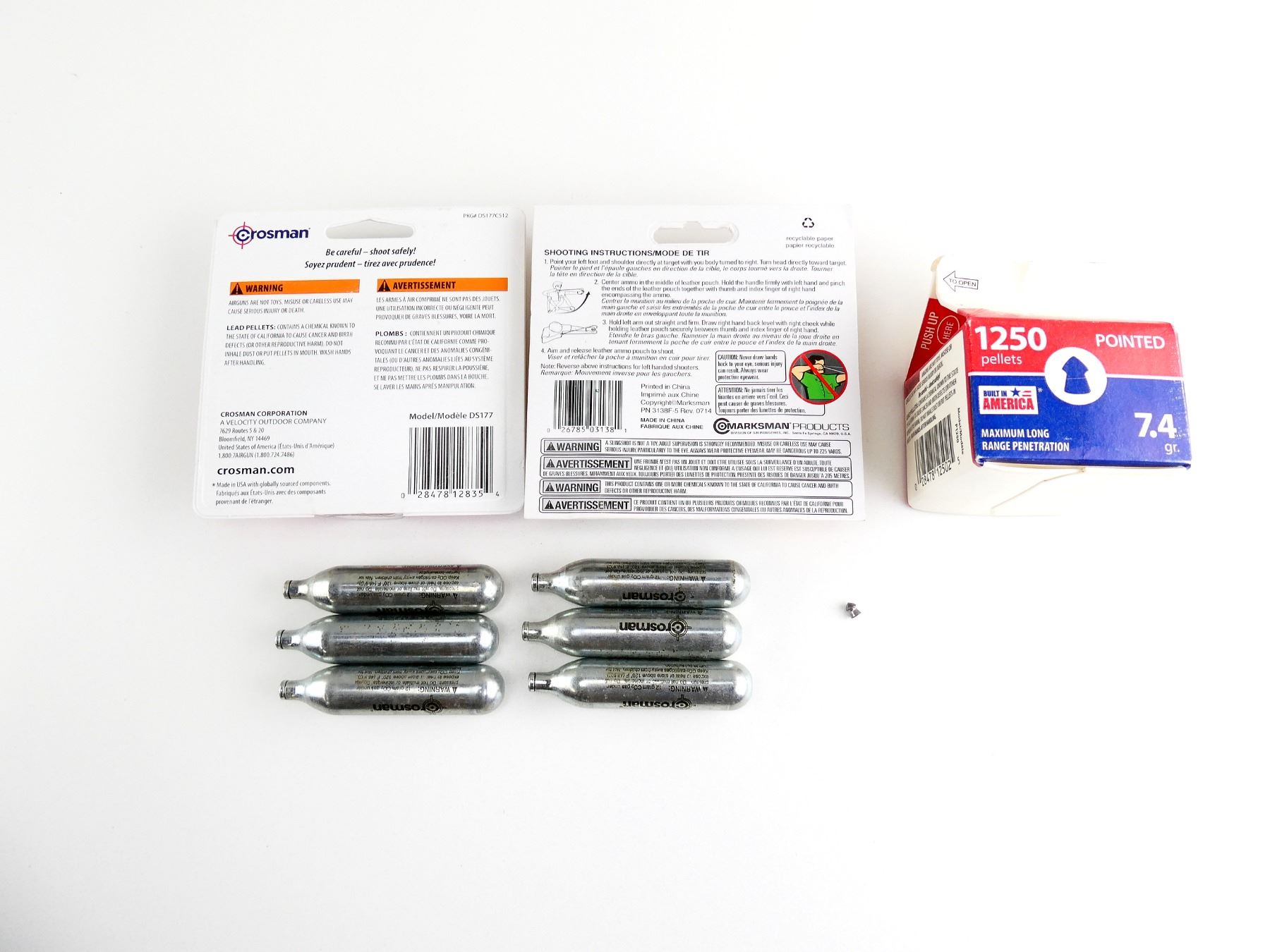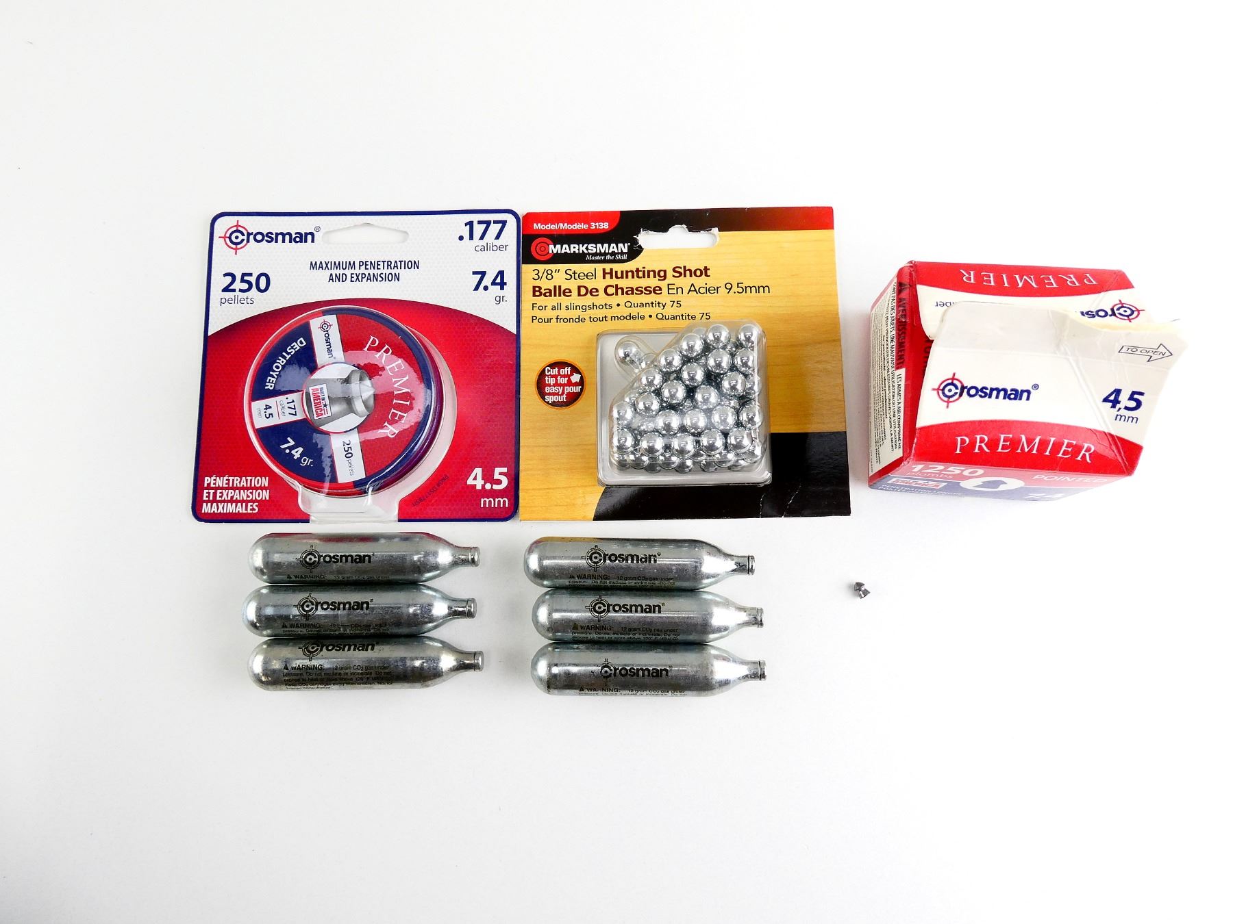 LOT INCLUDES; APPROX. (850) PELLETS, (75) 3/8" STEEL BALLS, (6) CO2 CANISTERS, (2) UNOPENED.