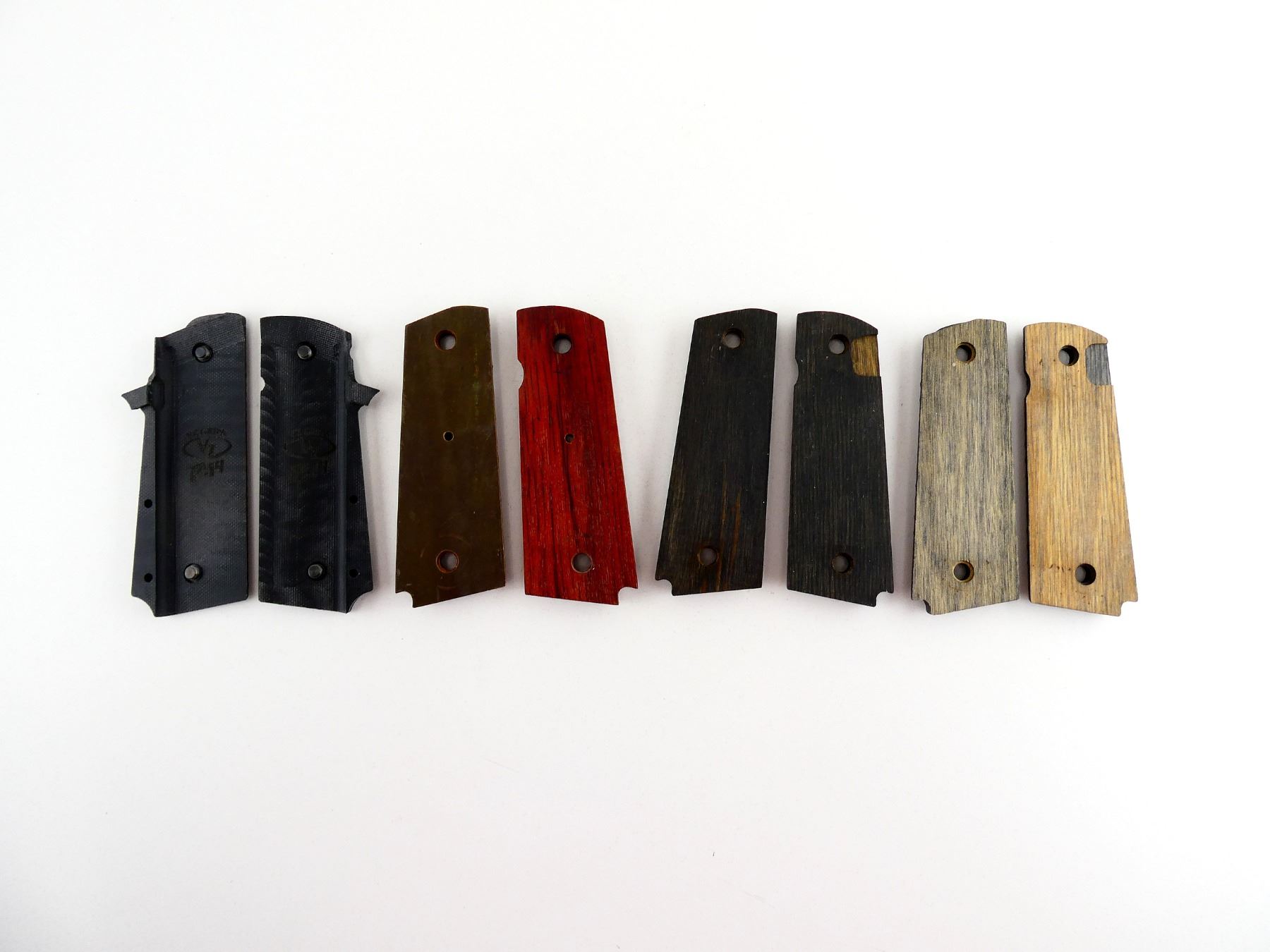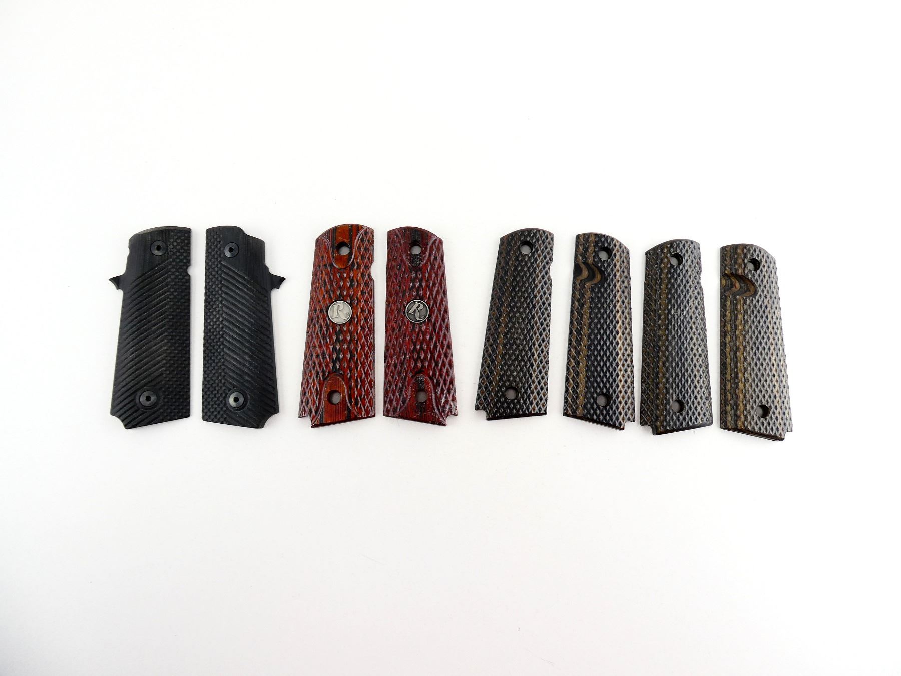 LOT INCLUDES; (3) SETS OF CHECKERED WOOD GRIPS, ONE MARKED: "R (REMINGTON)", NO SCREWS, APPEARS NEW OLD STOCK & (1) SET OF CHECKERED BLACK POLYMER GRIPS, WITH SCREWS, APPEARS NEW OLD STOCK. MAY REQUIRE FITTING. SEE PHOTOS.