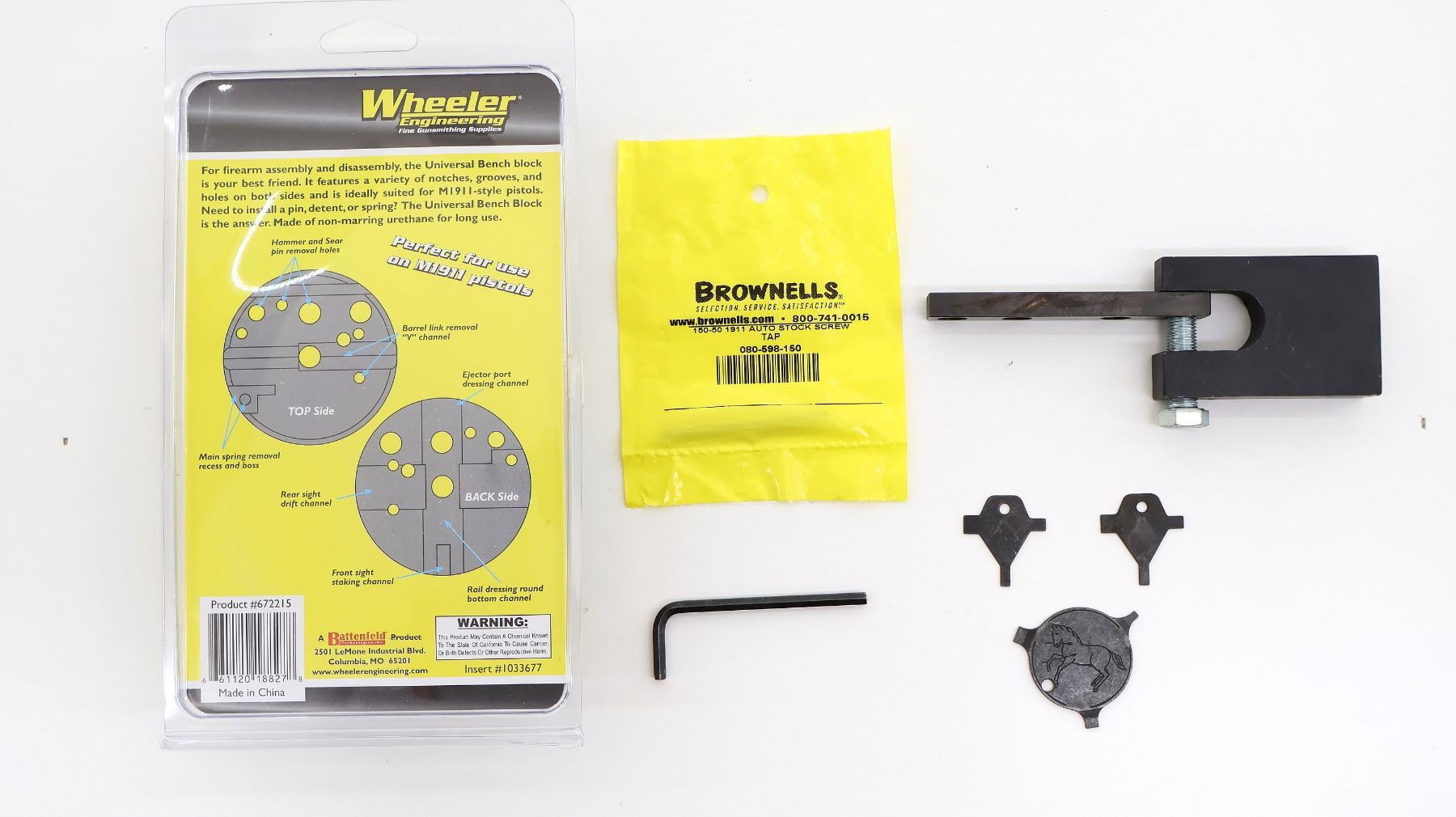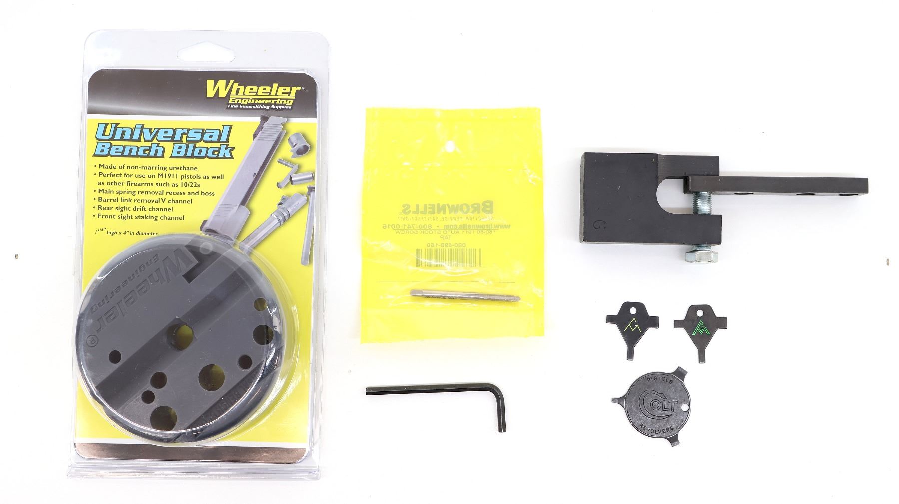 LOT INCLUDES; (1) WHEELER UNIVERSAL BENCH BLOCK, APPEARS NEW OLD STOCK IN ORIGINAL PACKAGING, (1) BROWNELL'S 1911 AUTO STOCK SCREW, PART #: 080-598-150, APPEARS NEW OLD STOCK IN ORIGINAL PACKAGING, (1) PLUNGER TUBE INSTALLATION TOOL, WITH INSTRUCTIONS, ETC. SEE PHOTOS.