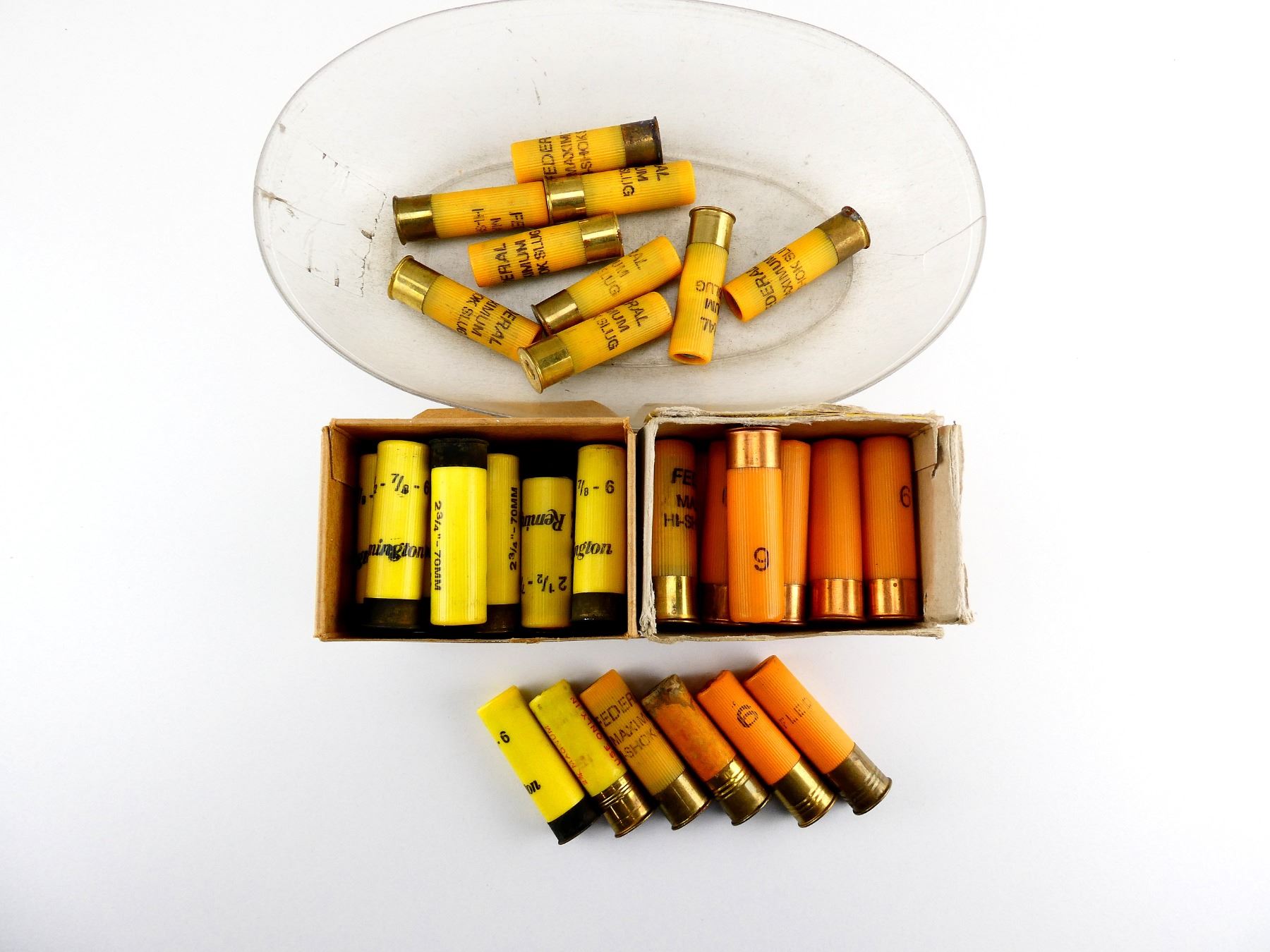 LOT INCLUDES; APPROX. (53) RNDS, VARIOUS MANUFACTURERS INCLUDING; CANUCK, REMINGTON, FEDERAL, ETC., ASSORTED SHOT SIZES; #4, #6, #RIFLED SLUG, ETC.