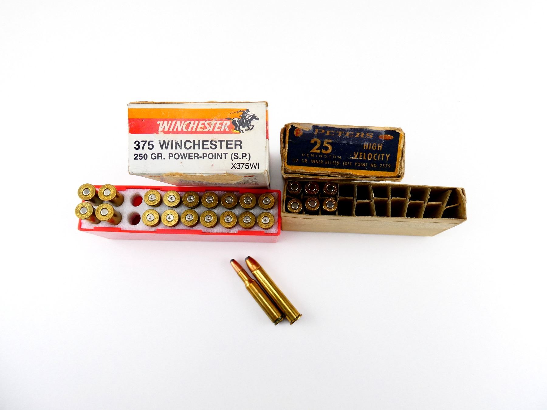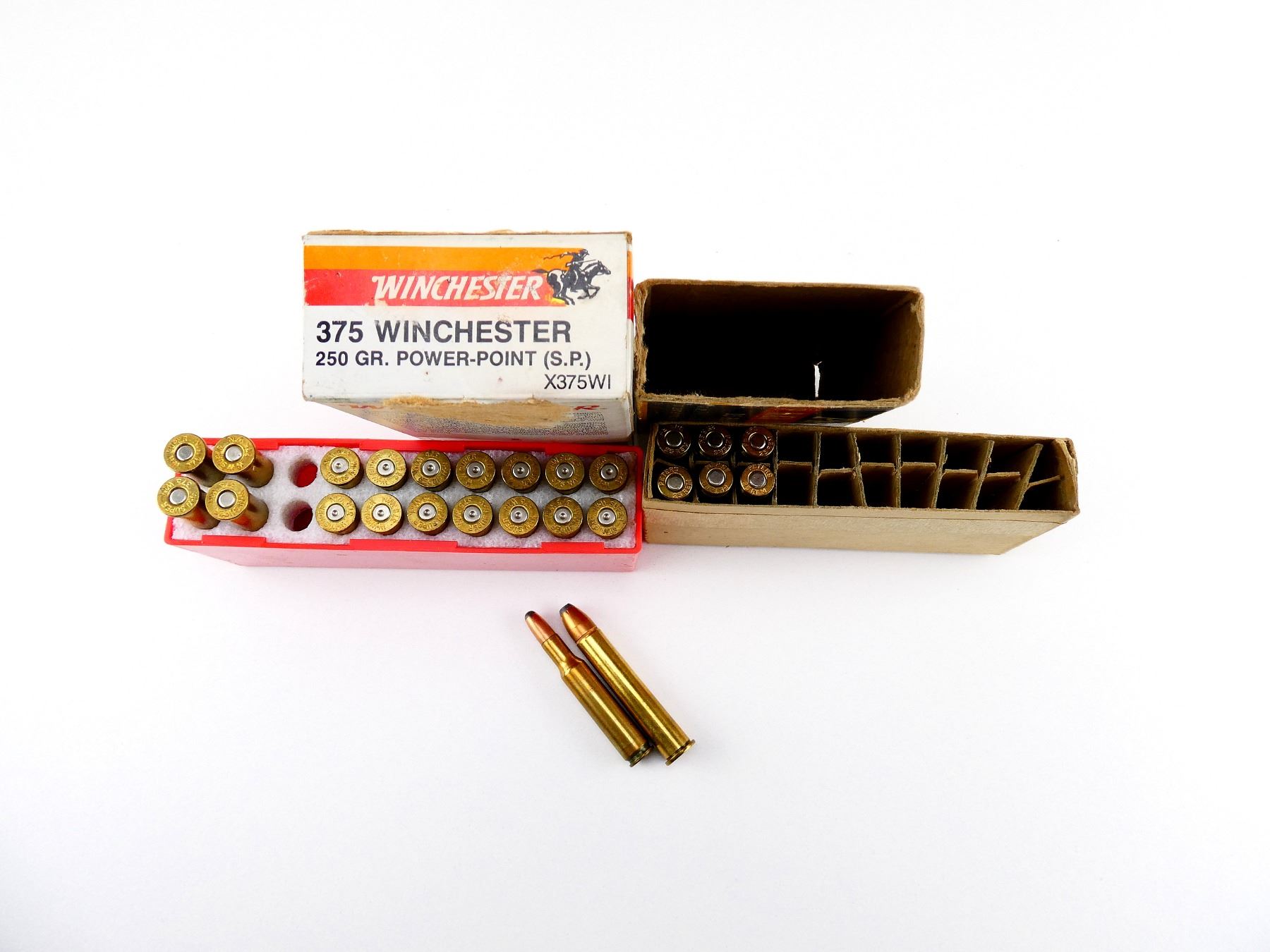 LOT INCLUDES; APPROX. (12) RNDS, VARIOUS MANUFACTURERS INCLUDING; WINCHESTER & PETERS, 117 GRS (STATED ON BOX NOT CONFIRMED), INNER-BELTED SP & 250 GRNS (STATED ON BOX NOT CONFIRMED), POWER-PONT SP, (14) NON-PRIMED .375 WIN BRASS CASES.
