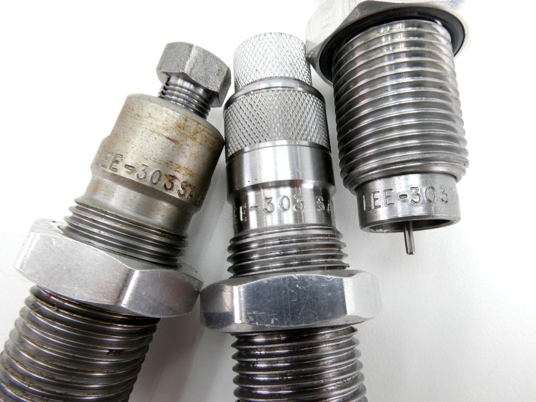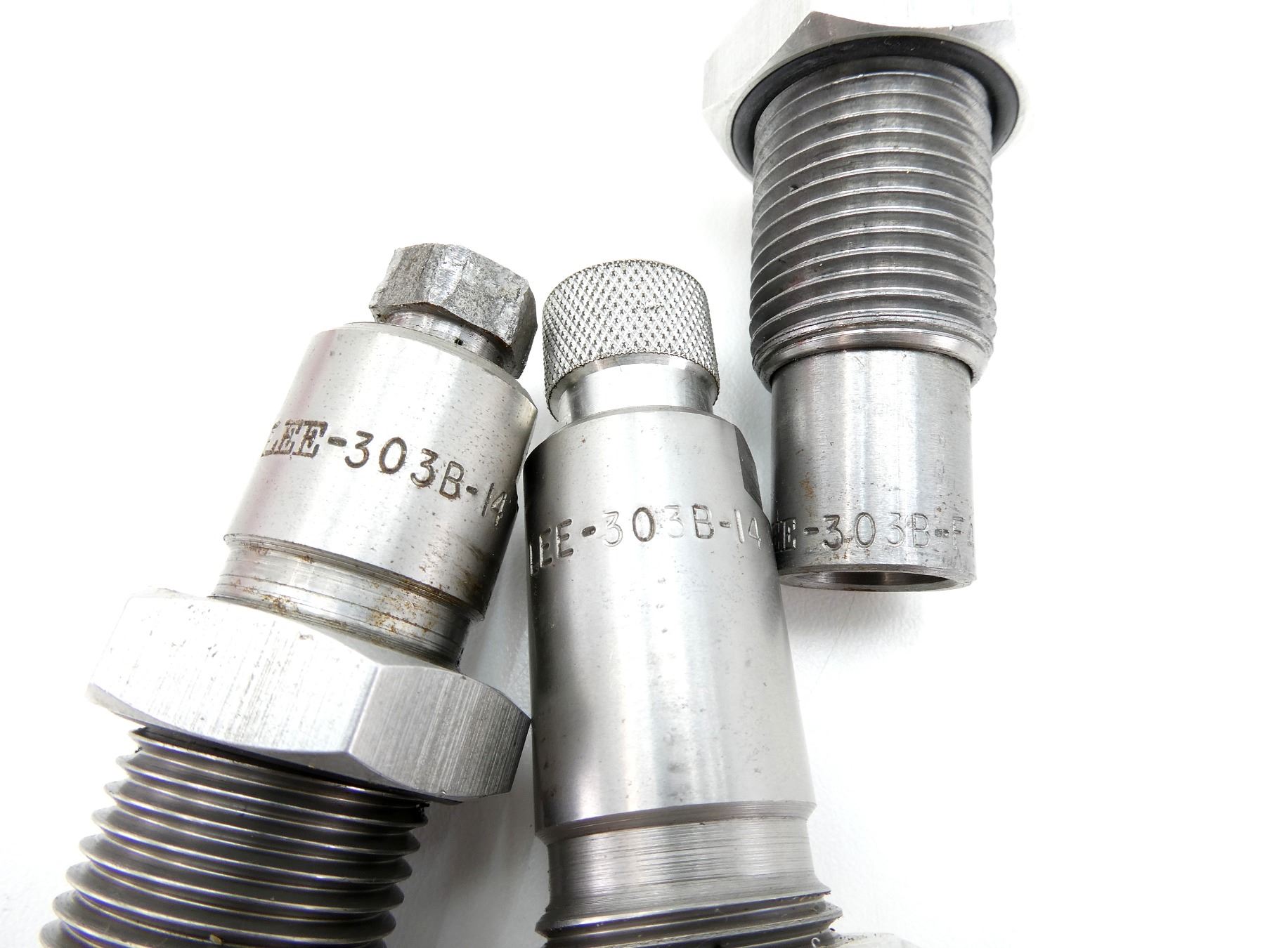 LOT INCLUDES; (1) LEE .303 SAV 2-PIECE RELOADING DIES, (1) LEE .303B 3-PIECE RELOADING DIES WITH #5 SHELL HOLDER & (1) LEE .303B COLLET RELOADING DIE. SEE PHOTOS.