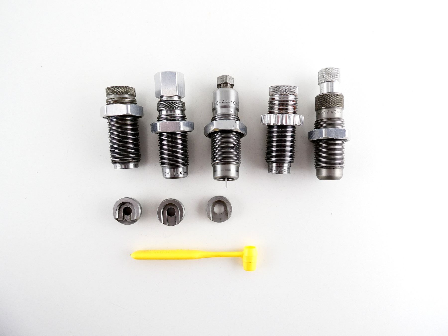 LOT INCLUDES; (5) ASSORTED .44-40 RELOADING DIES, (1) #5 SHELL HOLDER, (1) #14 SHELL HOLDER, (1) RCBS #35 SHELL HOLDER & (1) .7CC SCOOP. SEE PHOTOS.