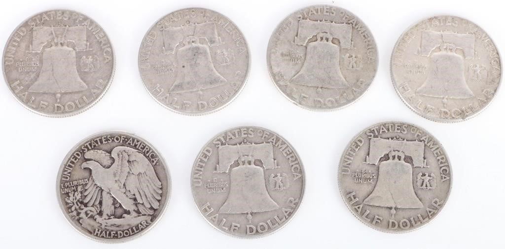 Assorted 90% silver Liberty/ Franklin Dollars to include one 1945 P Walking Liberty Dollar, and six Ben Franklin Half Dollars.