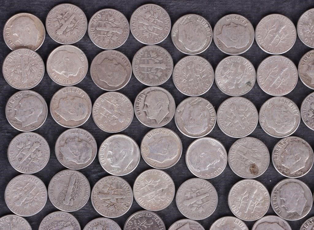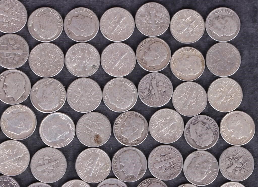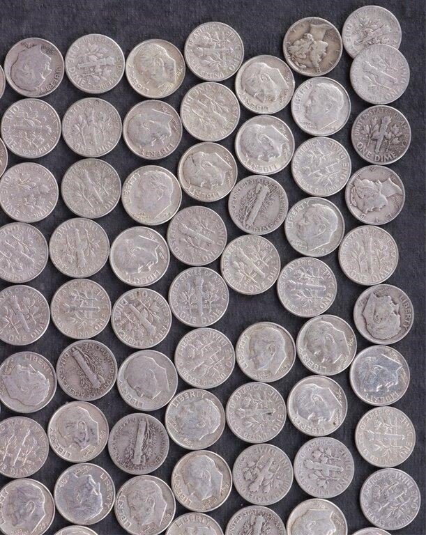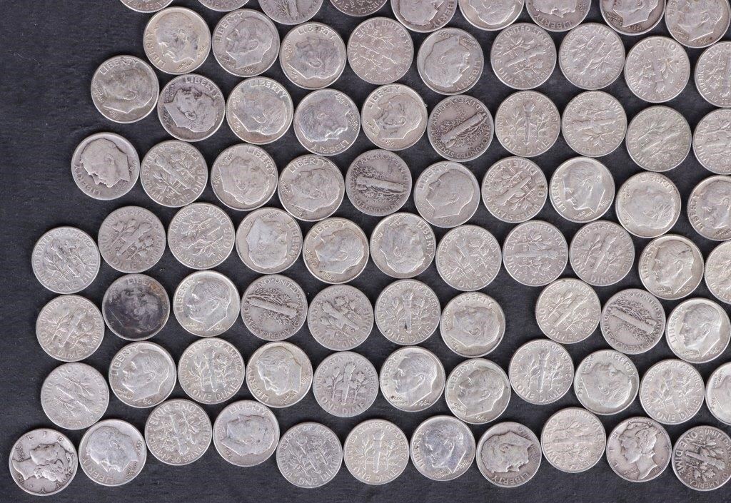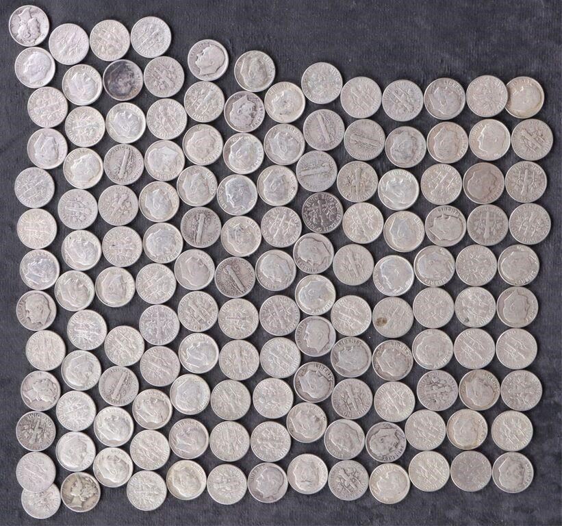 Assorted 90% silver Mercury/ Roosevelt dimes ranging from Good to Extremely Fine condition.