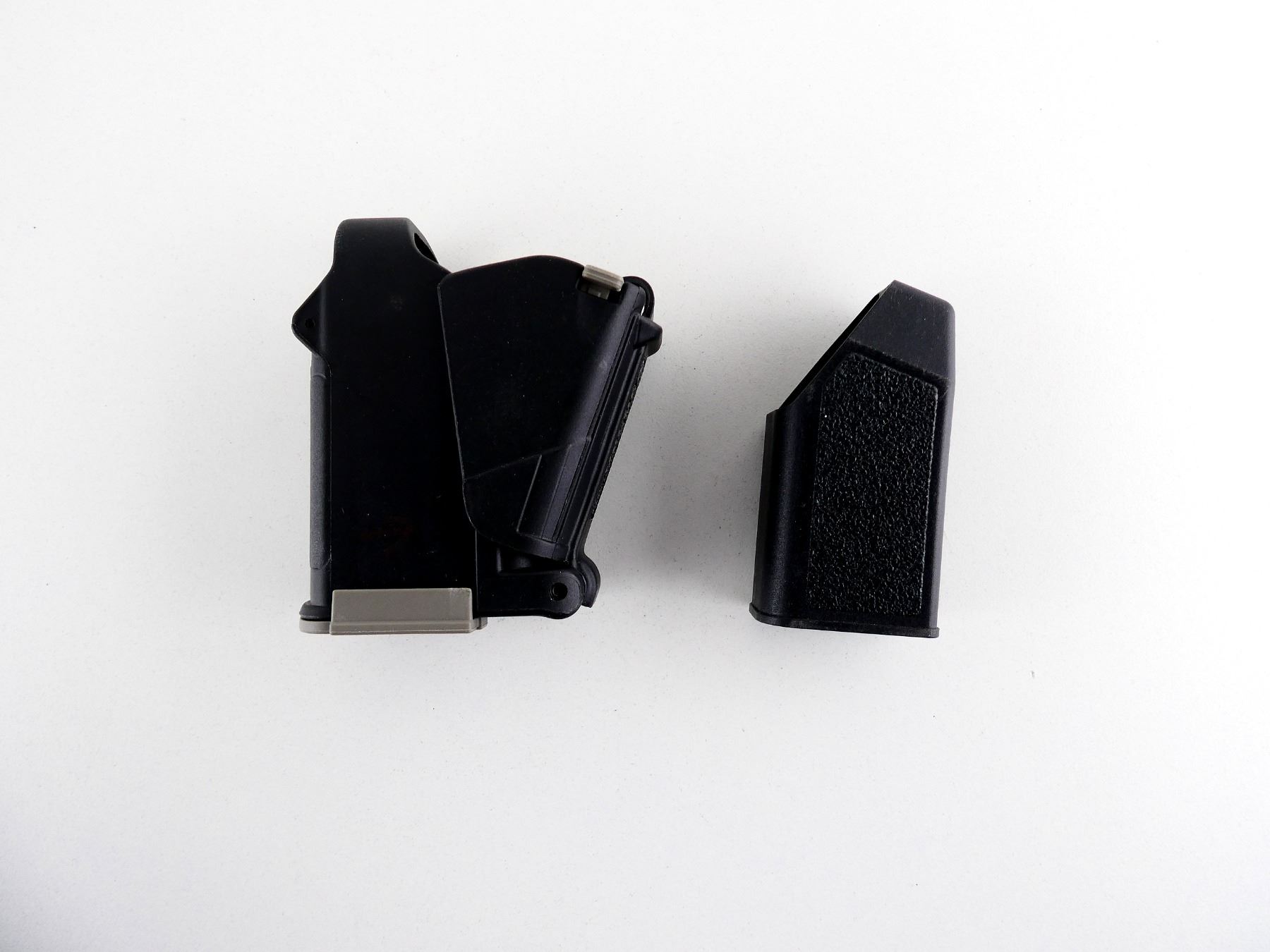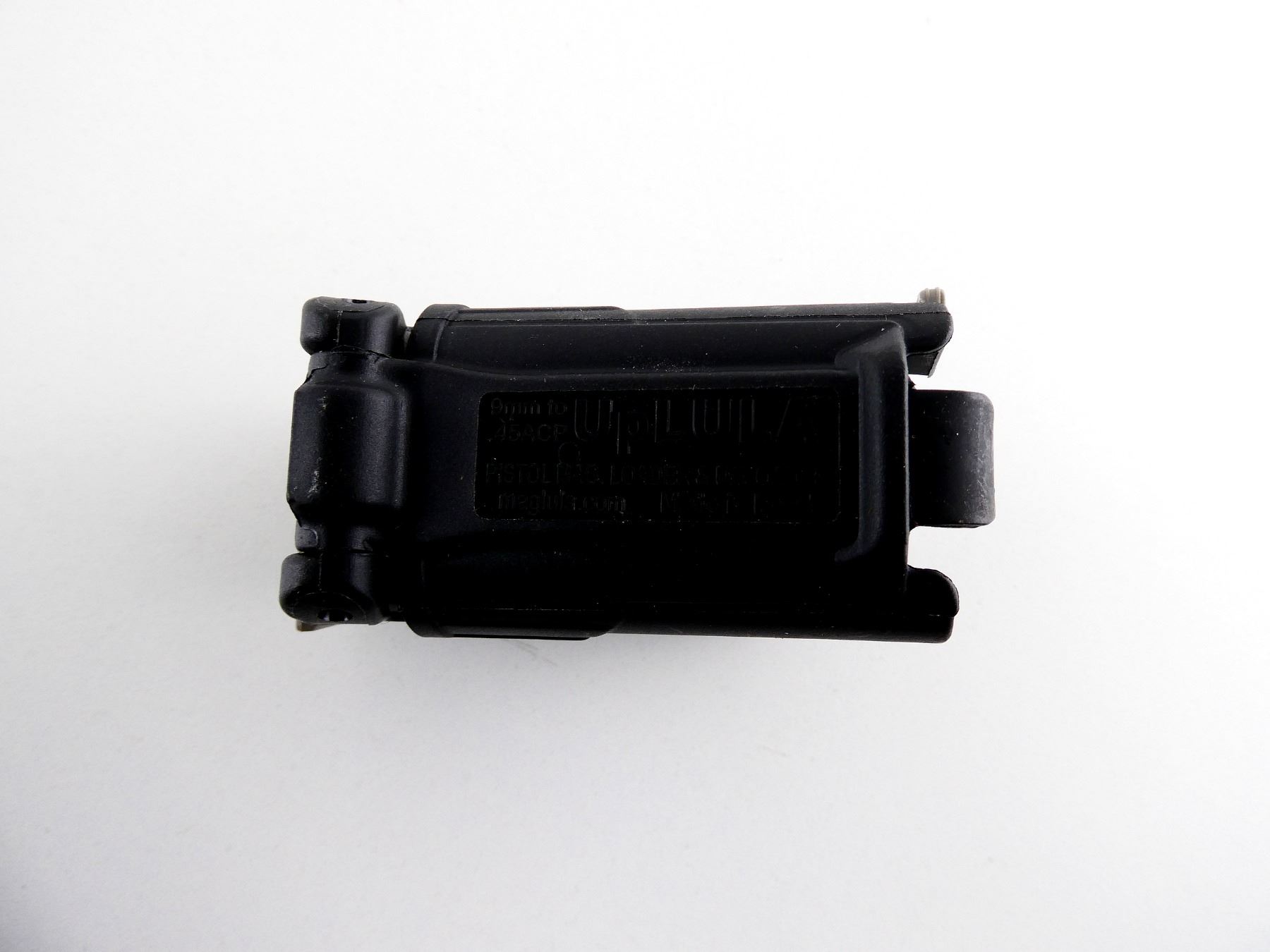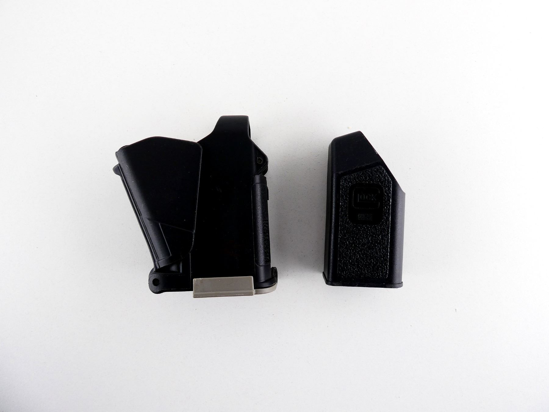 LOT INCLUDES; (1) UPLULA BLACK POLYMER MAG LOADER, FITS 9MM TO .45 CALIBERS, SINGLE OR DOUBLE STACK, WITH 1911A1 ALIGNMENT INSERT INSTALLED, VARIOUS MARKINGS & (1) GLOCK BLACK POLYMER MAG LOADER, FITS 9MM CALIBERS, MARKED: "GLOCK". SEE PHOTOS.
