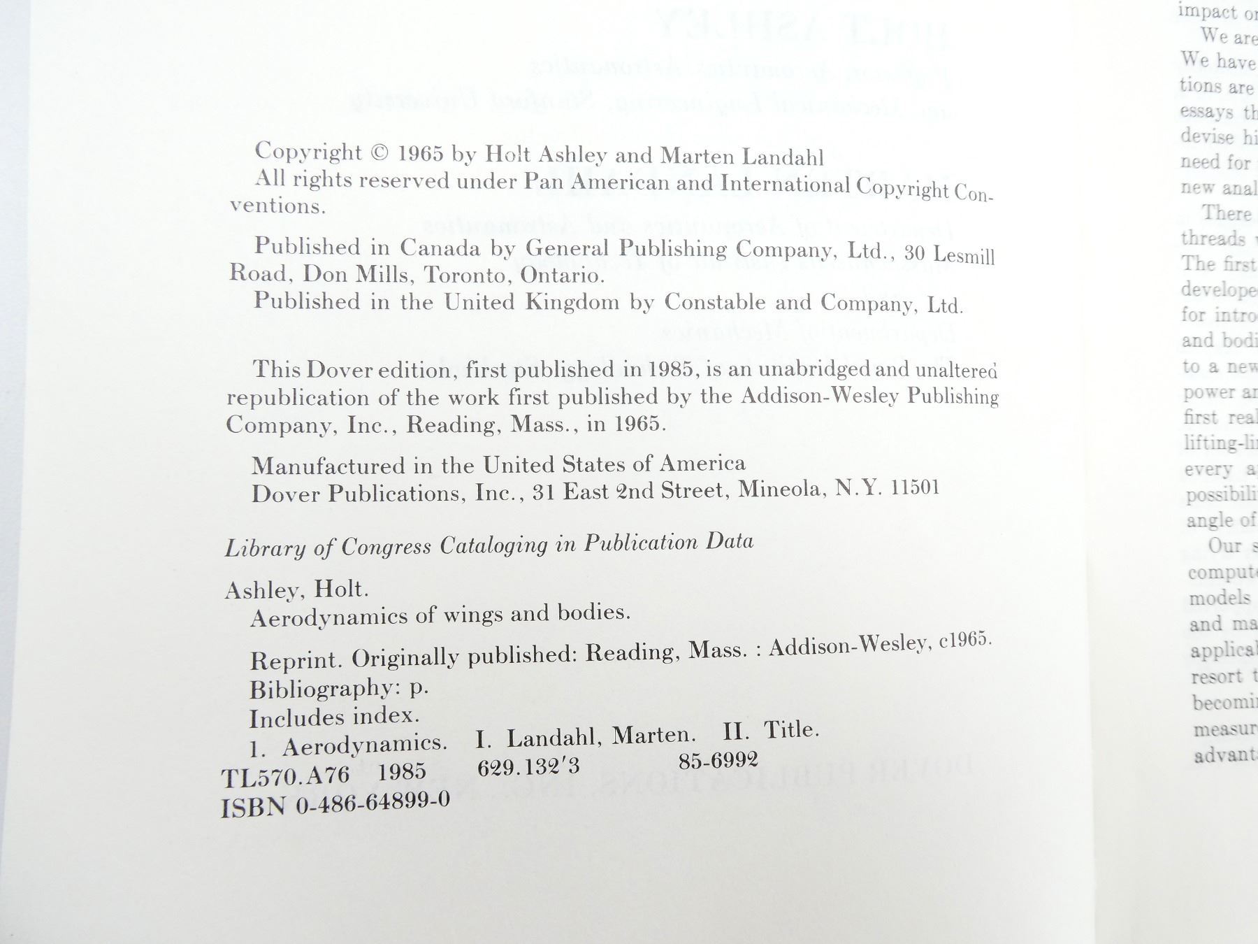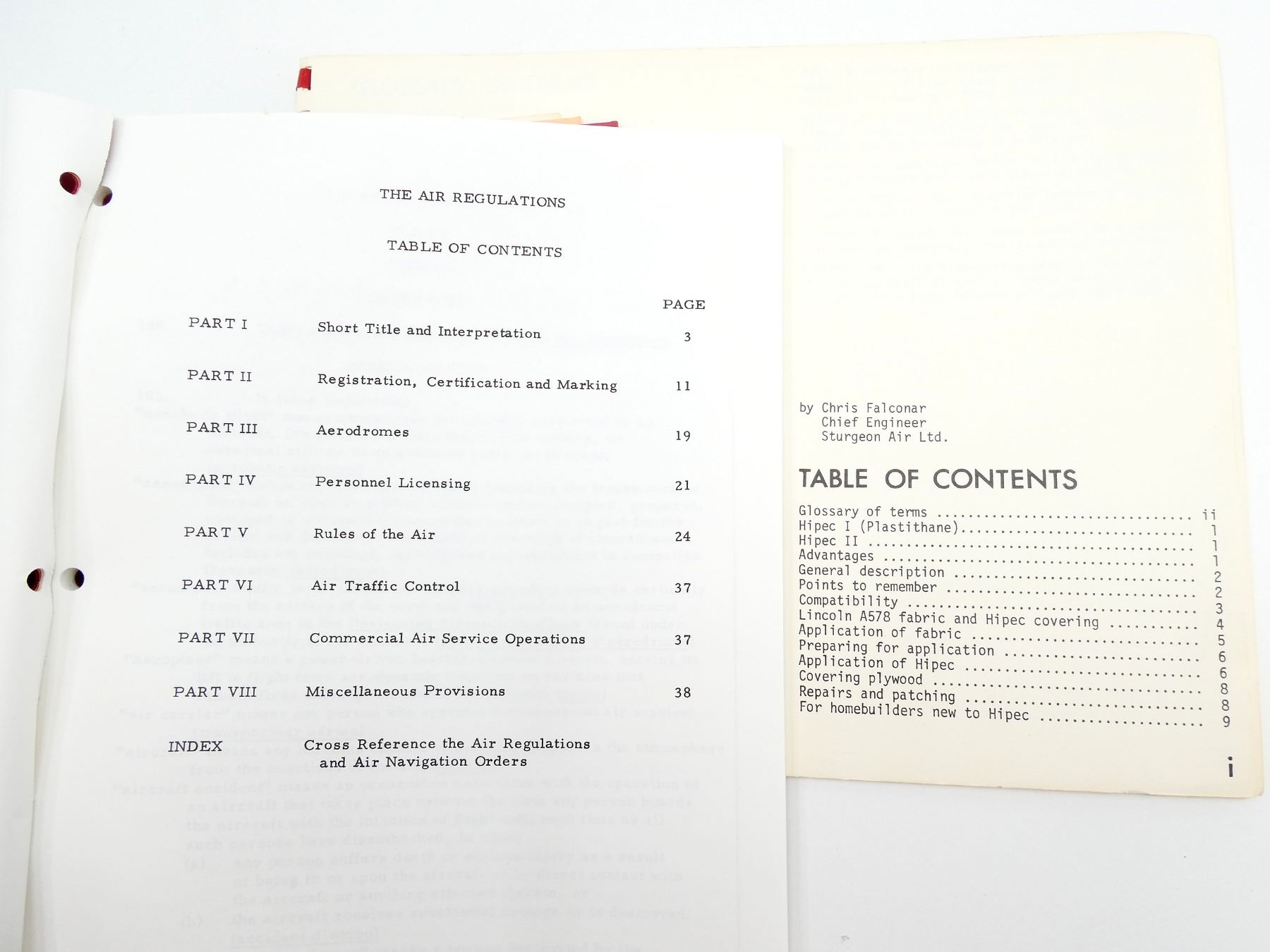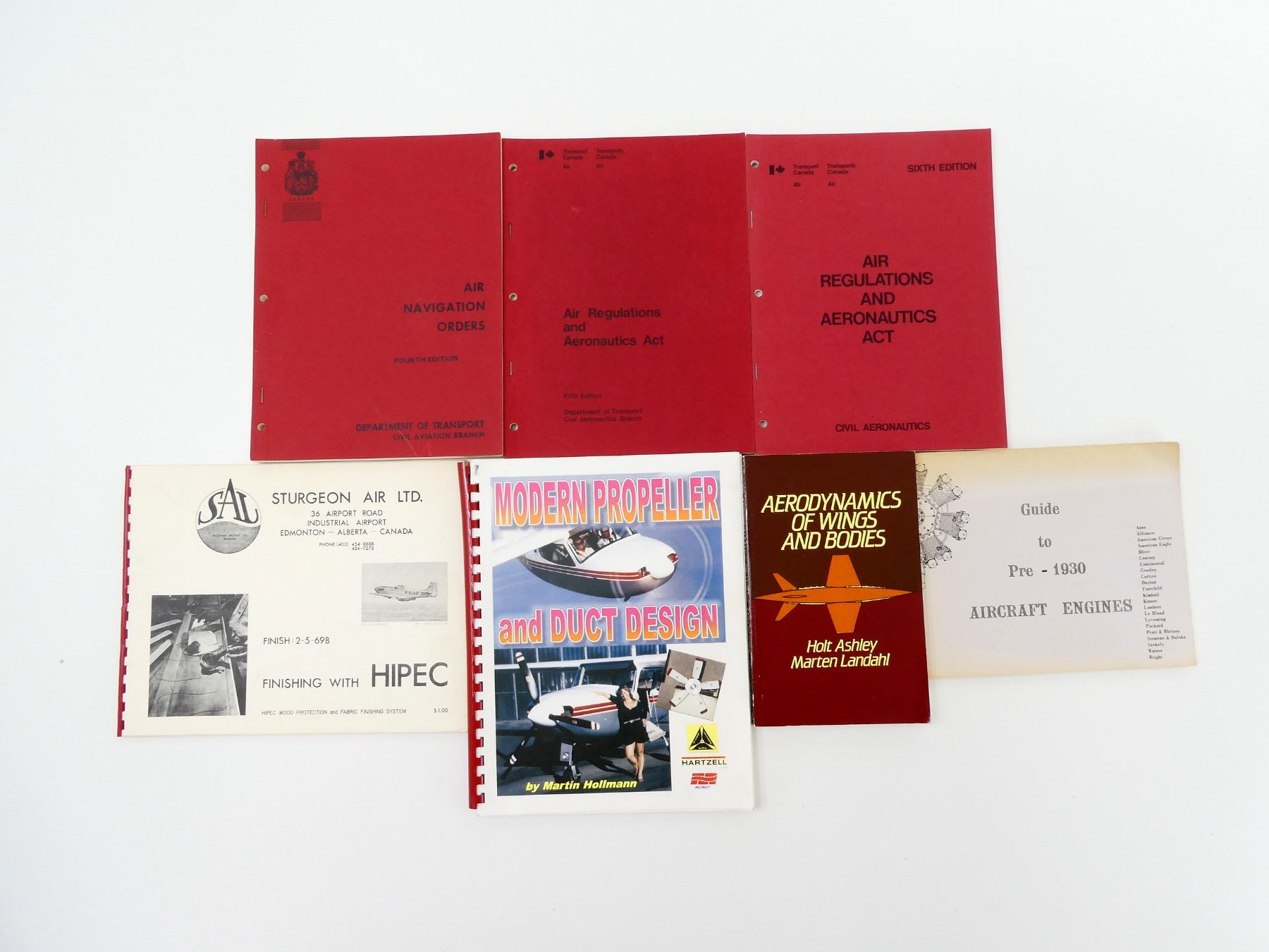 SOFT COVERS, LOT INCLUDES; (1) "AERODYNAMICS OF WINGS AND BODIES" BOOK BY HOLT ASHLEY & MARTEN LANDAHL, ISBN: 0-486-64899-0, (1) "GUIDE TO PRE-1930 AIRCRAFT ENGINES" BOOK COMPILED BY M. S. RICE, ISBN: 0-87994-016-6, (1) "FINISHING WITH HIPEC" BOOK BY CHRIS FALCONAR, SPIRAL BOUND, (1) "MODERN PROPELLER AND DUCT DESIGN" BOOK BY MARTIN HOLLMANN, SPIRAL BOUND, COPYRIGHT 1993, (1) "AIR REGULATIONS AND AERONAUTICS ACT, FIFTH EDITION" PUBLISHED BY MINISTRY OF TRANSPORT, (1) "AIR REGULATIONS AND AERONAUTICS ACT, SIXTH EDITION" PUBLISHED BY MINISTRY OF TRANSPORT & (1) "AIR NAVIGATION ORDERS, FOURTH EDITION", PUBLISHED BY MINISTRY OF TRANSPORT. SEE PHOTOS.