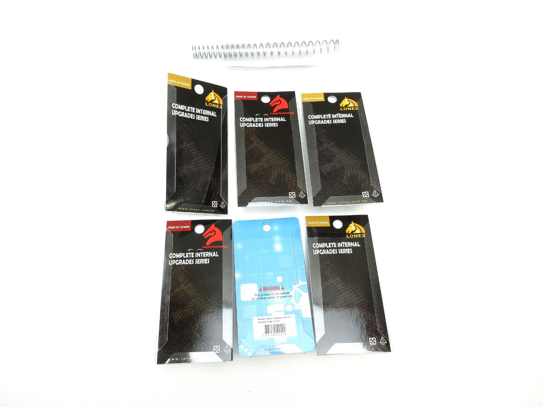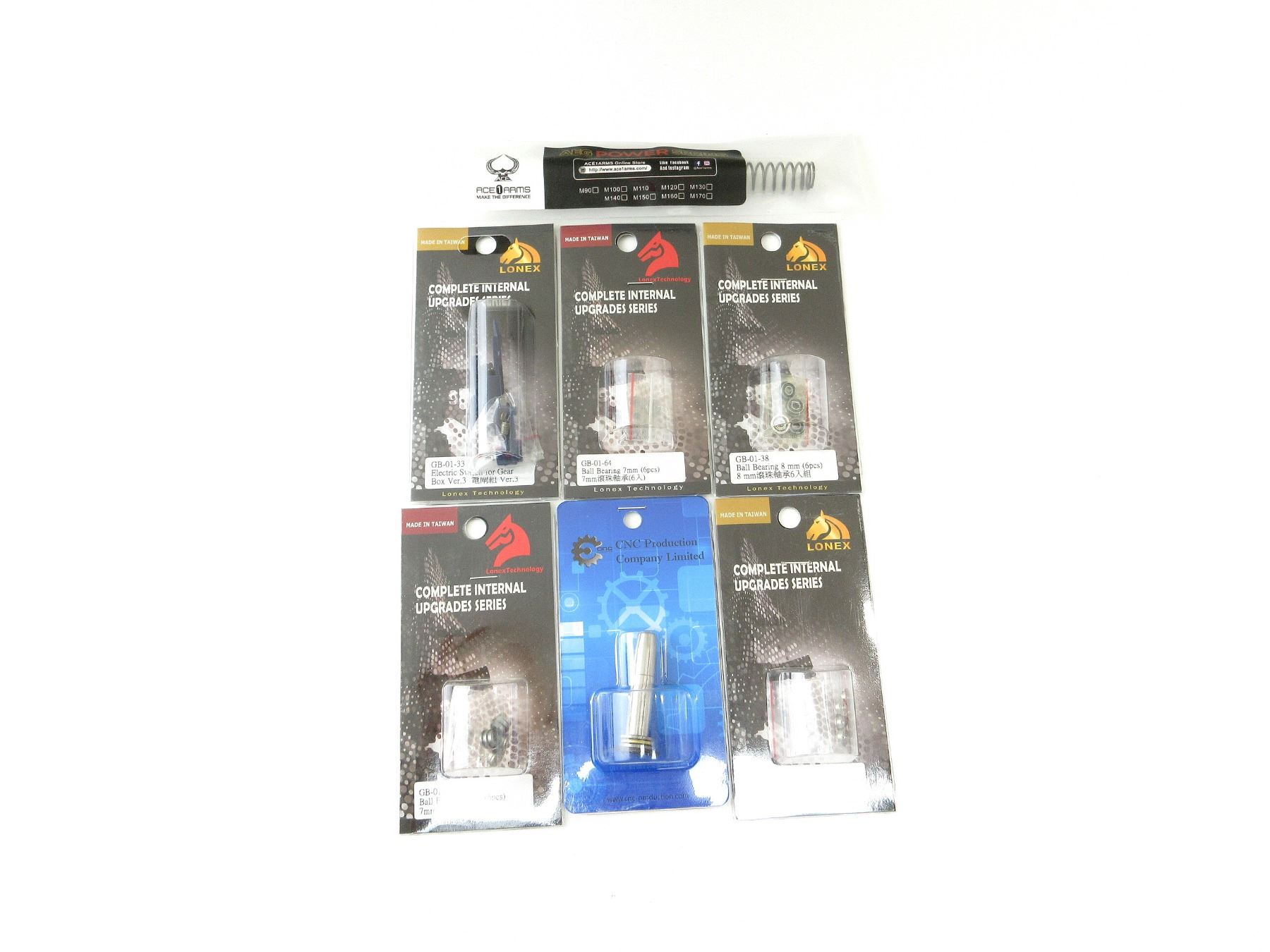 LOT INCLUDES; (1) ACE POWER SPRING, MODEL M110, NOS, IN ORIGINAL PACKAGING, (1) CNC PRODUCTION SPRING GUIDE, V2, NOS, UNOPENED, (1) LONEX GB-01-33 ELECTRIC SWITCH FOR GEAR BOX, VER.3, NOS, UNOPENED, (1) LONEX GB-01-38 BALL BEARINGS, 8 MM, SIX PIECES, NOS, UNOPENED, (2) LONEX GB-01-64 BALL BEARINGS, 7 MM, SIX PIECES, NOS, UNOPENED, (1) LONEX GB-01-55 6 MM DOUBLE GROOVE STAINLESS BUSHINGS, SIX PIECES, NOS, UNOPENED. SEE PHOTOS.