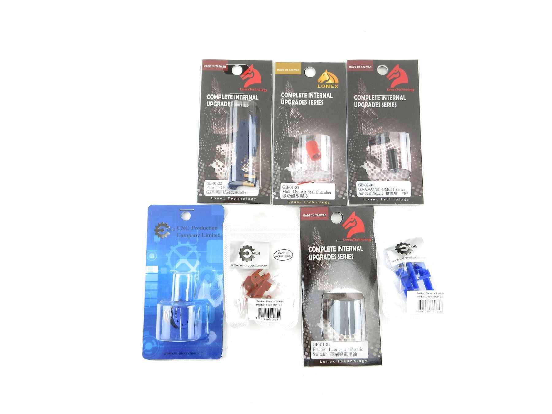 LOT INCLUDES; (1) ELECTRIC LUBRICANT ELECTRIC SWITCH, PART NO. GB-01-81, NOS, (1) MULTI-USE AIR SEAL CHAMBER, PART NO. GB-01-82, NOS, (1) DOUBLE O-RING PISTON HEAD, NOS, (1) AIR SEAL NOZZLE, FITS G36C SERIES AIR RIFLES, PART NO. GB-02-07, NOS, (1) V2 SWITCH, NOS, (1) VER.3 TAPPET, NOS, (1) ANTI-HEAT SELECTOR PLATE FOR G3 SERIES AIRSOFT RIFLES, NOS, ETC. SEE PHOTOS.