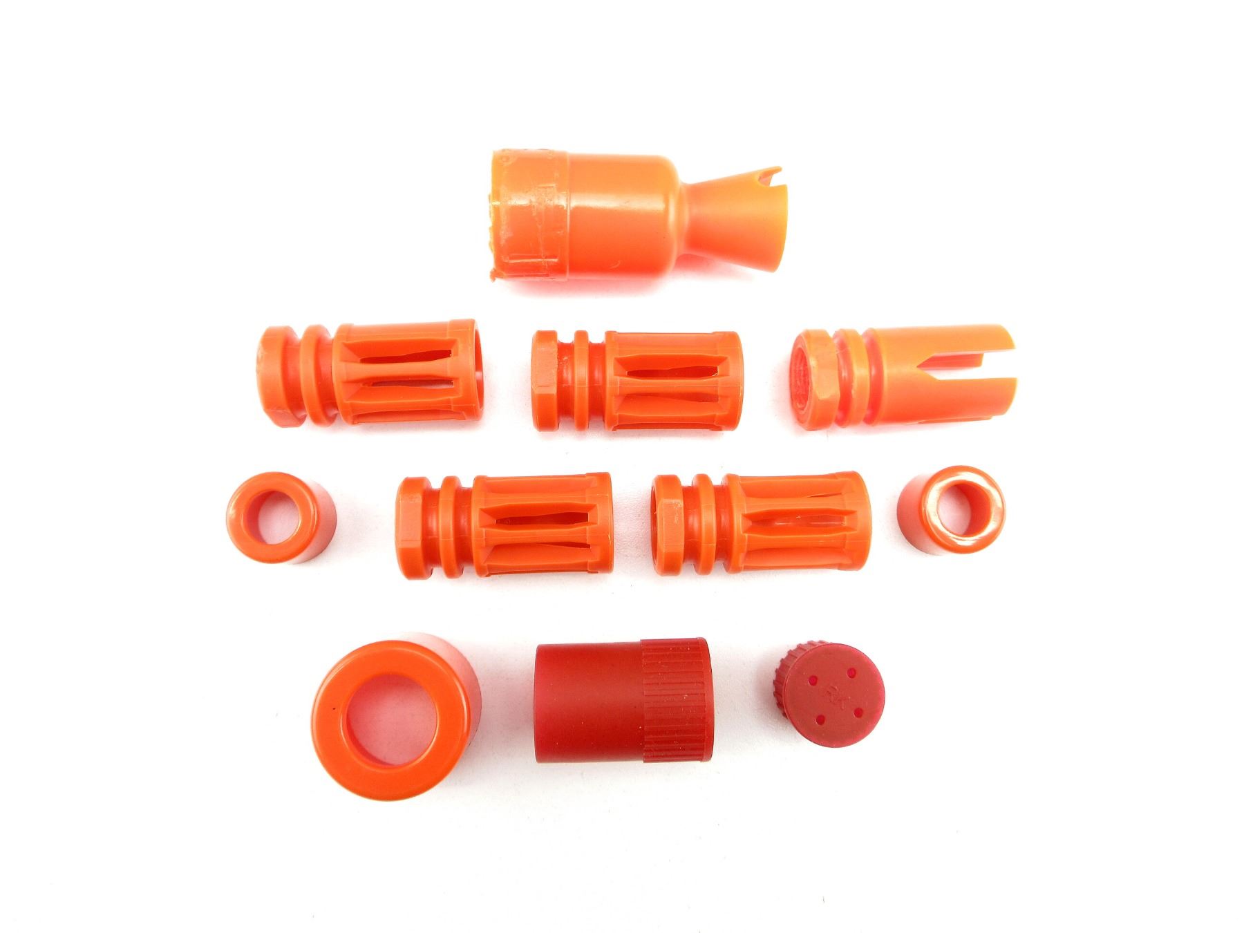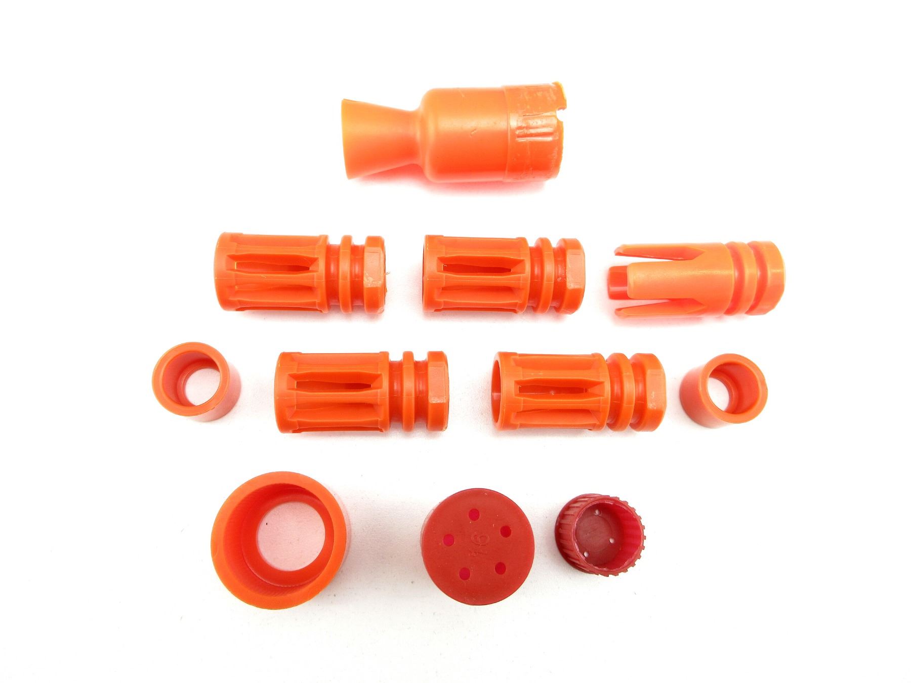 LOT INCLUDES; (4) FLASH HIDERS, ORANGE POLYMER CONSTRUCTION, FITS M16 STYLE AIRSOFT RIFLES, (1) FLASH HIDER, ORANGE POLYMER CONSTRUCTION, FITS AK STYLE AIRSOFT RIFLES, WITH VARIOUS OTHER ORANGE POLYMER FLASH HIDERS. SEE PHOTOS.