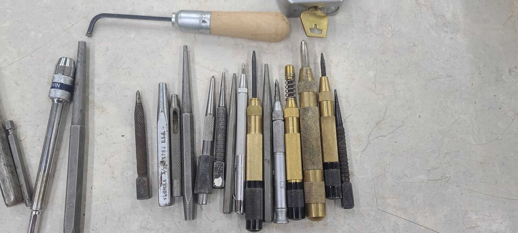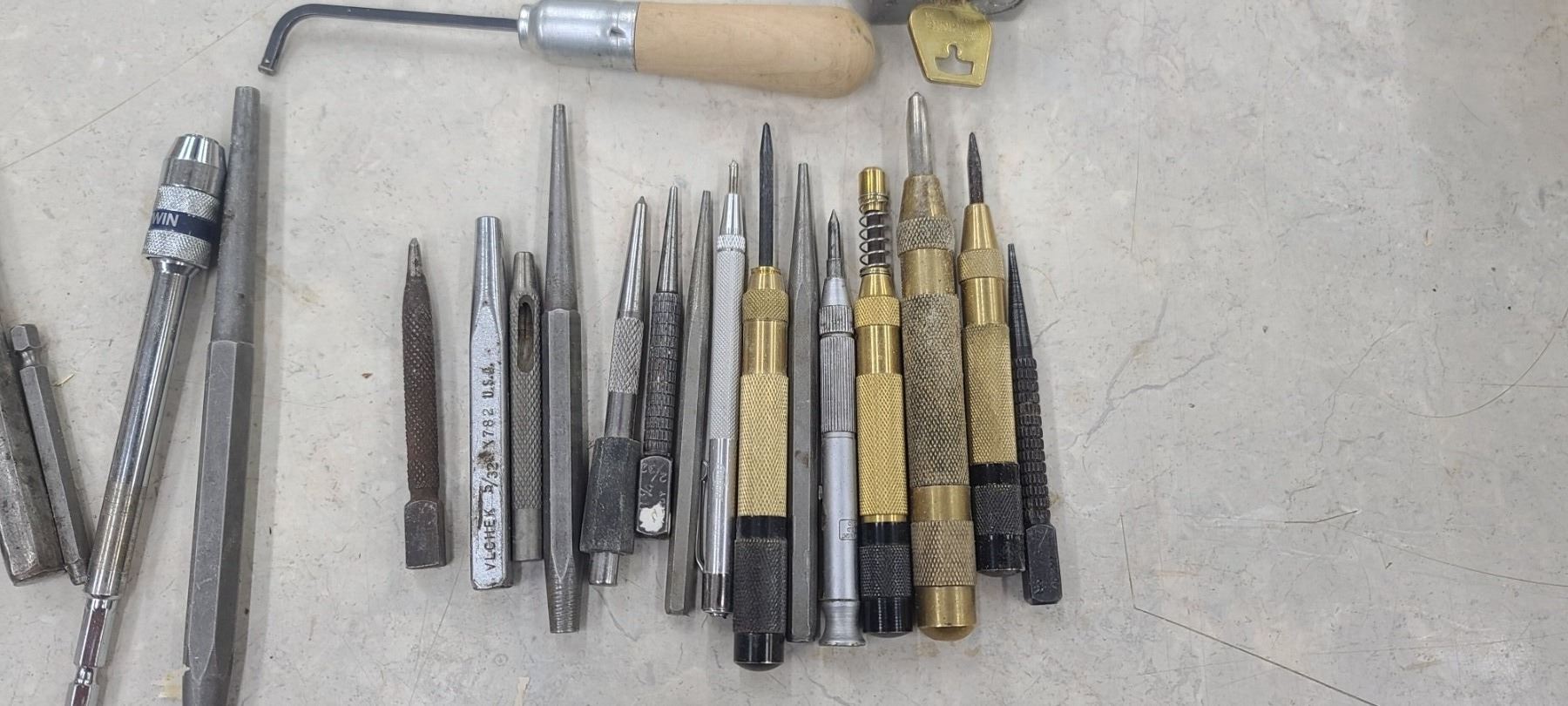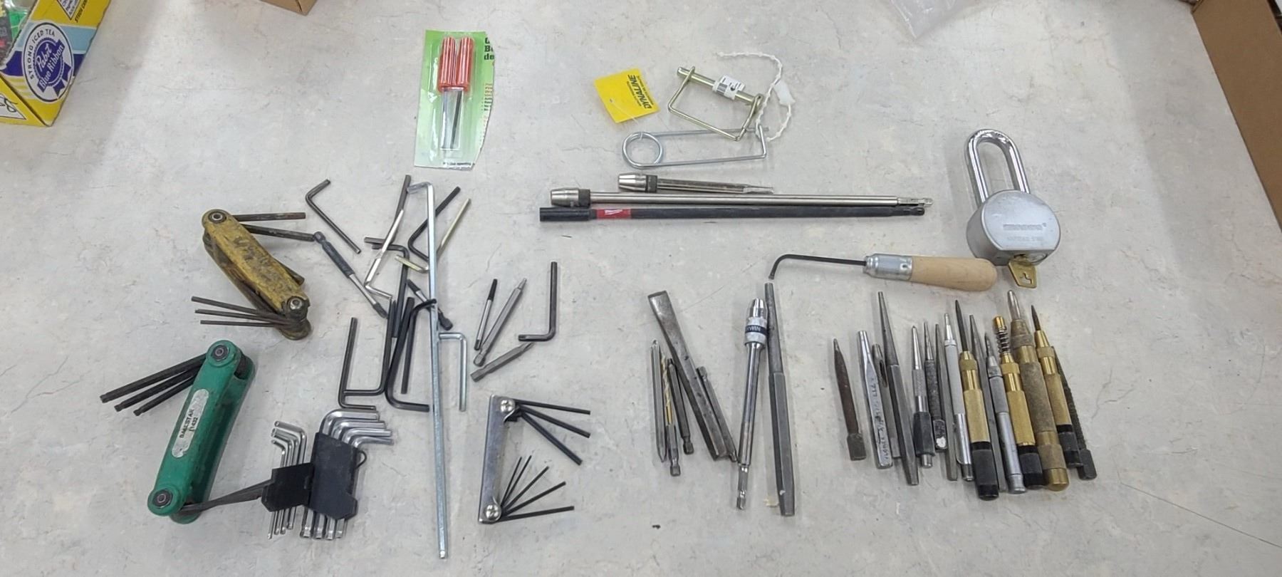 ASSORTED ALLEN KEYS. PUNCHES AND STOCK CHECKERING TOOL