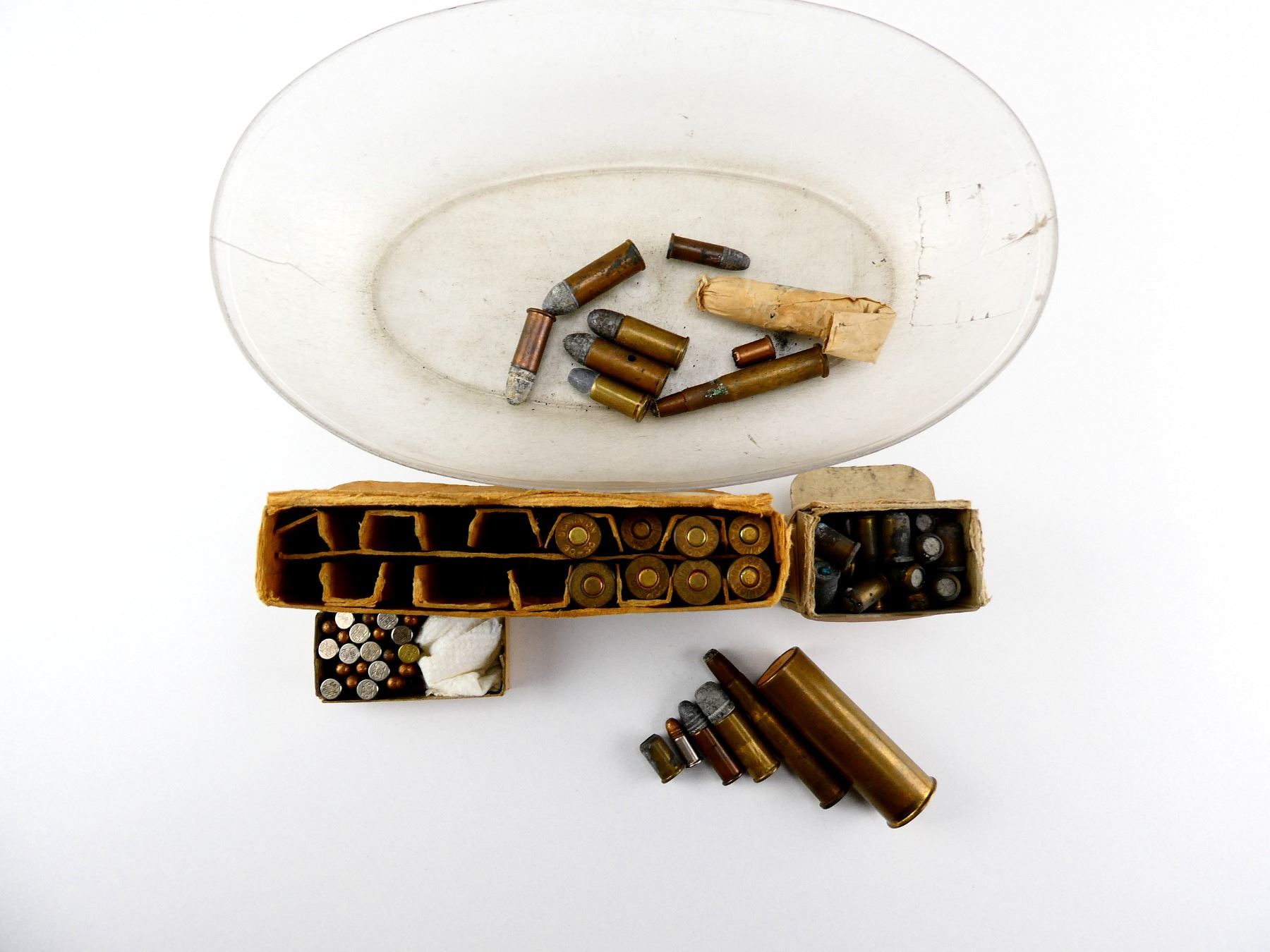 LOT INCLUDES; APPROX. (92) RNDS, VARIOUS MANUFACTURERS, ASSORTED CALIBERS INCLUDING; .22 SHORT, .303 BR, .32 LONG RF, .38 LONG RF, .38 COLT NP, 12 GAUGE BRASS CASE #00 BUCK, .32 SMITH & WESSON BLANKS, ETC., SOME CORROSION.