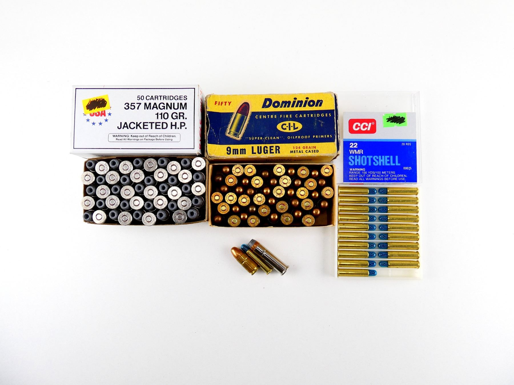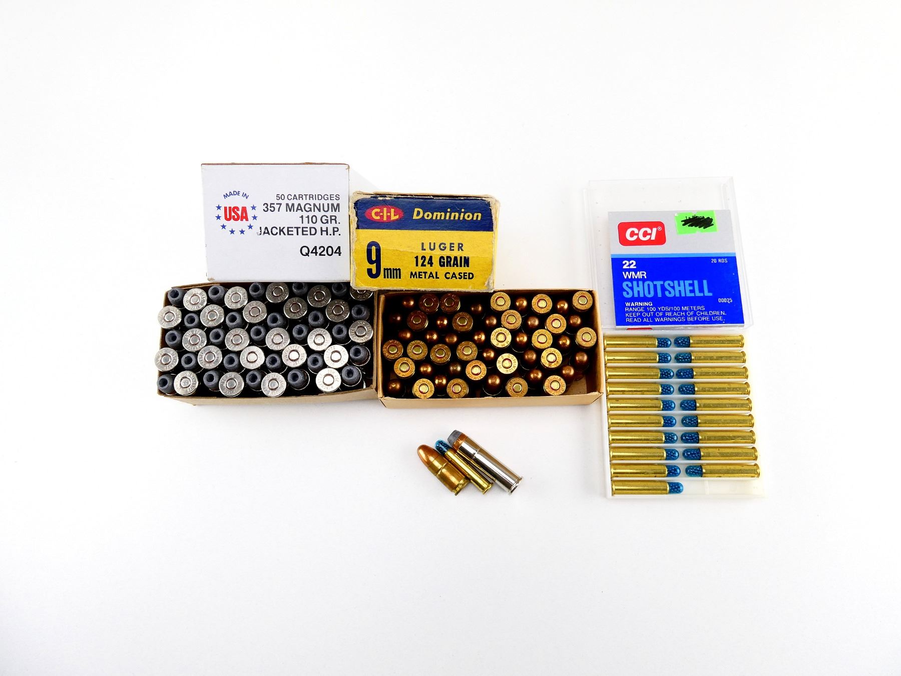 LOT INCLUDES; APPROX. (121) RNDS, VARIOUS MANUFACTURERS; ASSORTED CALIBERS INCLUDING; .22 WMR SHOT SHELL, 9MM LUGER, .357 MAGNUM, ETC.
