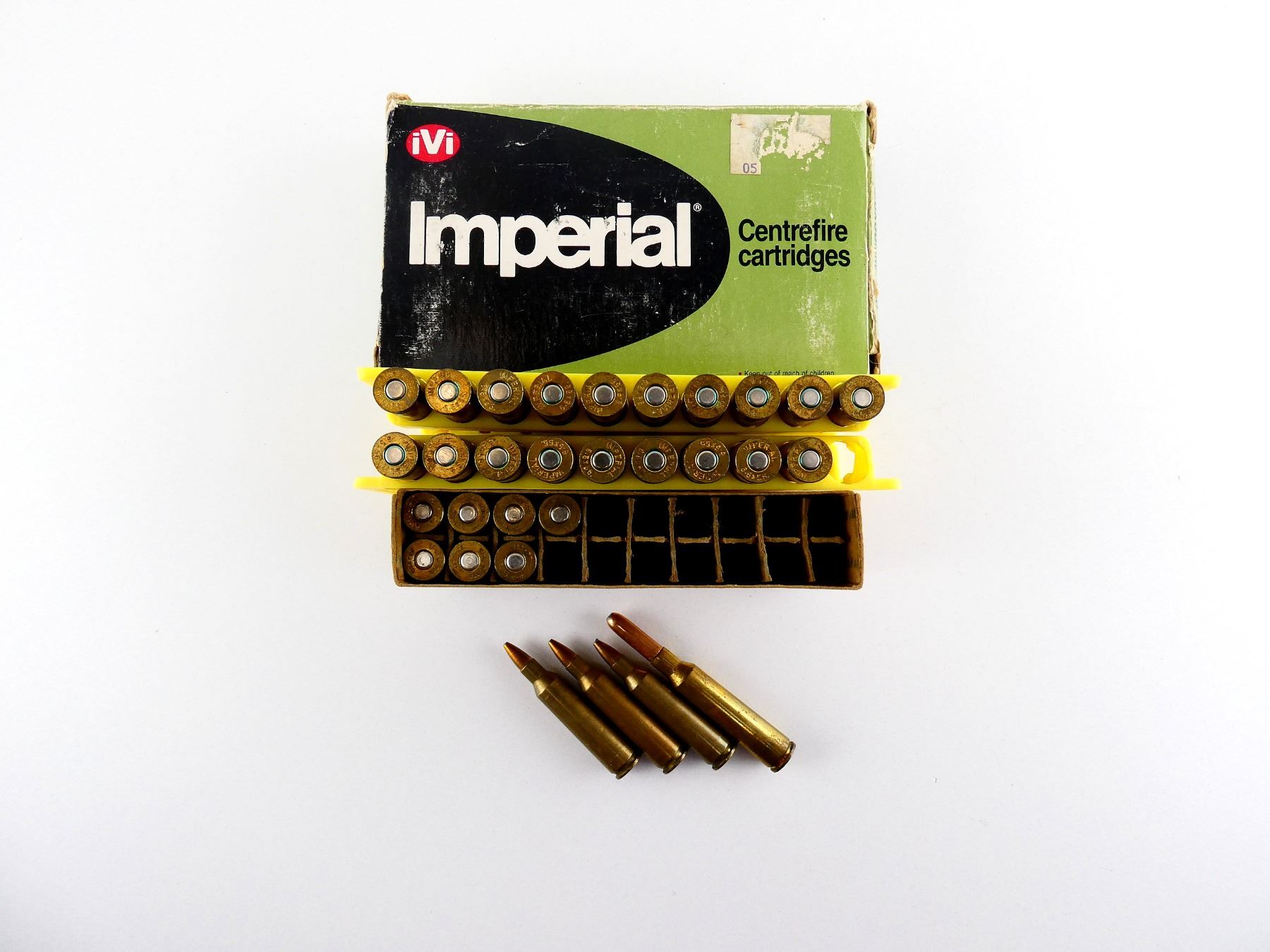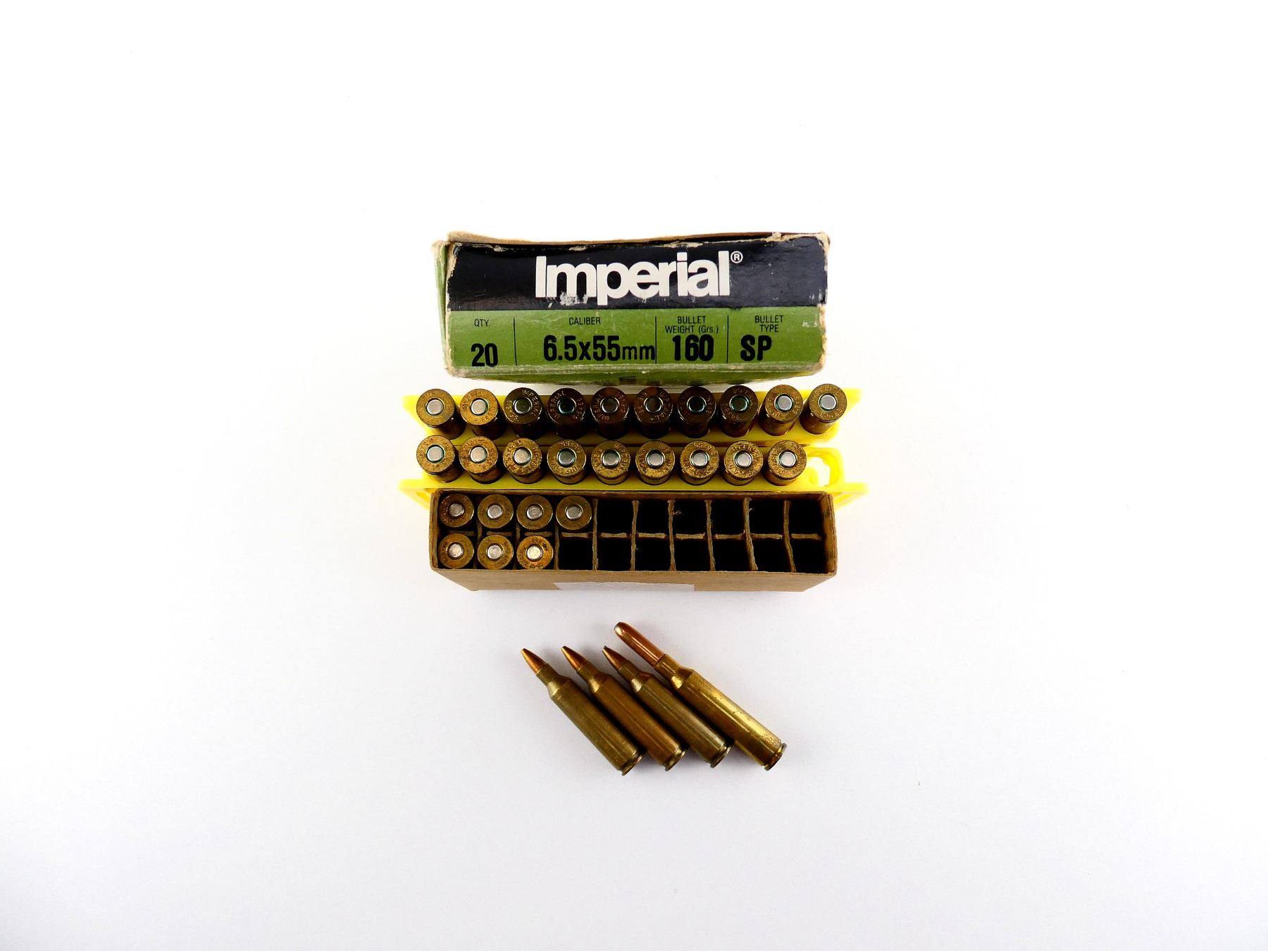 LOT INCLUDES; APPROX. (30) RNDS, VARIOUS CALIBERS INCLUDING; IMPERIAL 6.5X55MM 160 GRNS (STATED ON BOX NOT CONFIRMED), SP, (8) ASSORTED .22-250 REM.