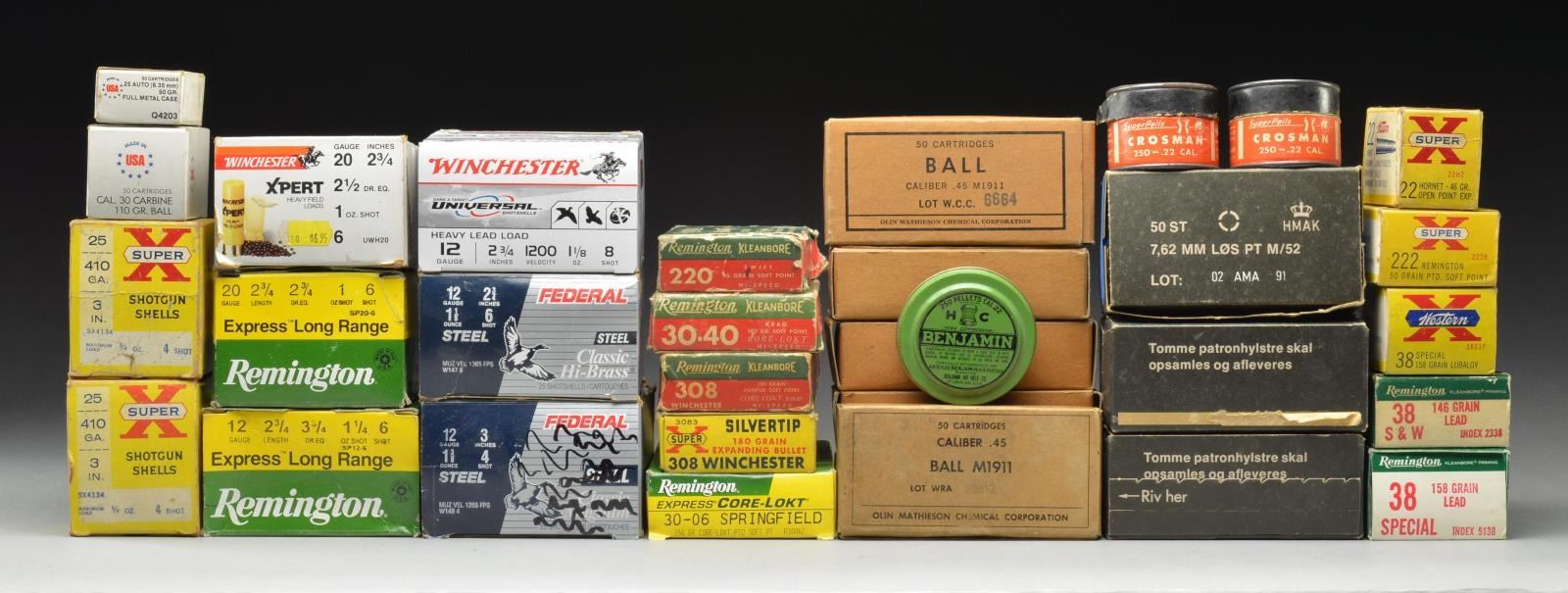 RIFLE: 20 rds. (1 Box) Rem. 220 Swift 48 gr. soft point. / 20 Rds. (1 Box) mixed 30-40 Krag soft point. / 25 Rds. (1 Box) Western 22 Hornet open point. / 20 Rds. (1 Box) Western Super X 222 Rem. 50 gr. soft point. / 10+ Rds. (1 Box) Rem. 30-06 150 gr. Core-lokt pointed soft point. / 20 Rds. (1 Box) Rem. 308 Win. 180 gr. pointed soft point. / 15+ Rds. (1 Box) Western Super X 308 Win. 180 gr. silver tip. / 100+ Rds. (4 BOXES) Danish 30-06 blanks. / 25+ Rds. (1 Box) Win. 30 Carbine 11 gr. ball.