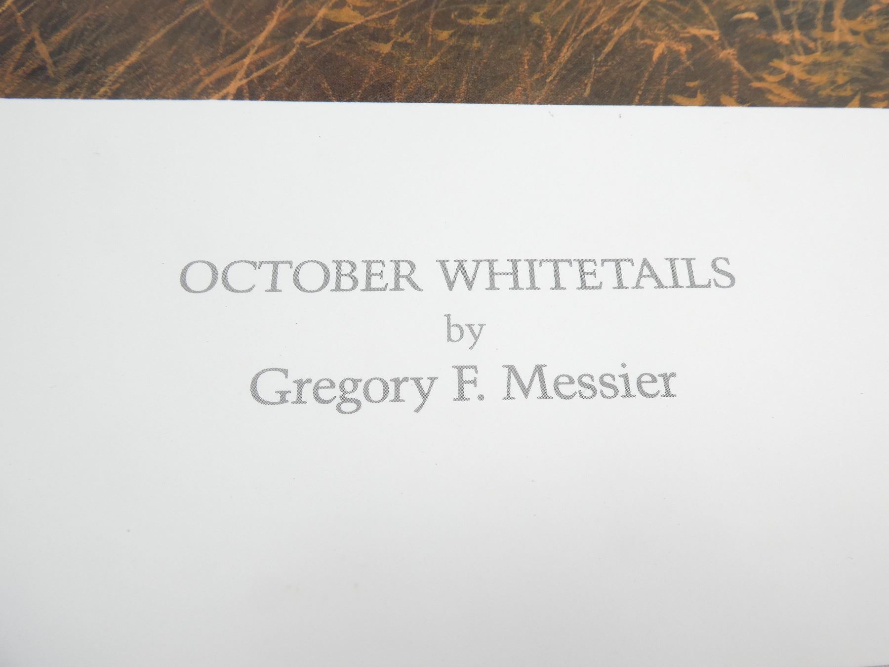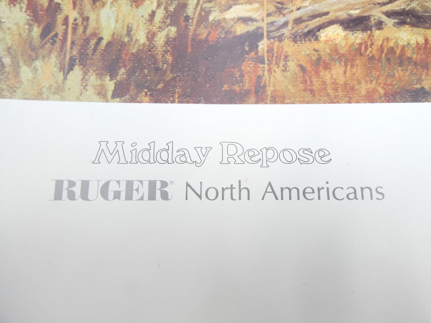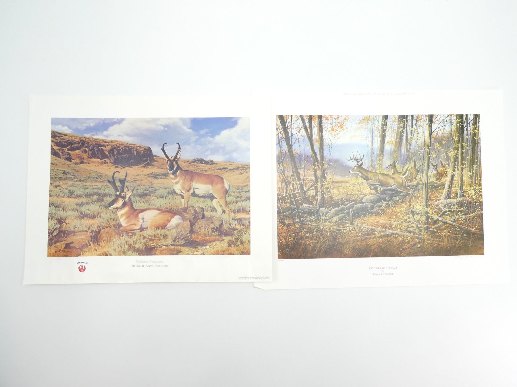 LOT INCLUDES; (1) ANTELOPE PRINT BY LEON PARSON, PRINT NO. 790 / 950, SIGNED BY ARTIST, MARKED: "MIDDAY REPOSE, RUGER NORTH AMERICANS" WITH RUGER SYMBOL, VARIOUS OTHER MARKINGS, COPYRIGHT 1987, SHOWS SOME WEAR & TEAR, APPROX. 24" X 18.5" & (1) "OCTOBER WHITETAILS" PRINT BY GREGORY F. MESSIER, PRINT NO. 634 / 950, SIGNED BY ARTIST, PUBLISHED BY PETERSON PRINTS, COPYRIGHT 1984, SHOWS SOME WEAR & TEAR, APPROX. 26" X 20". SEE PHOTOS.