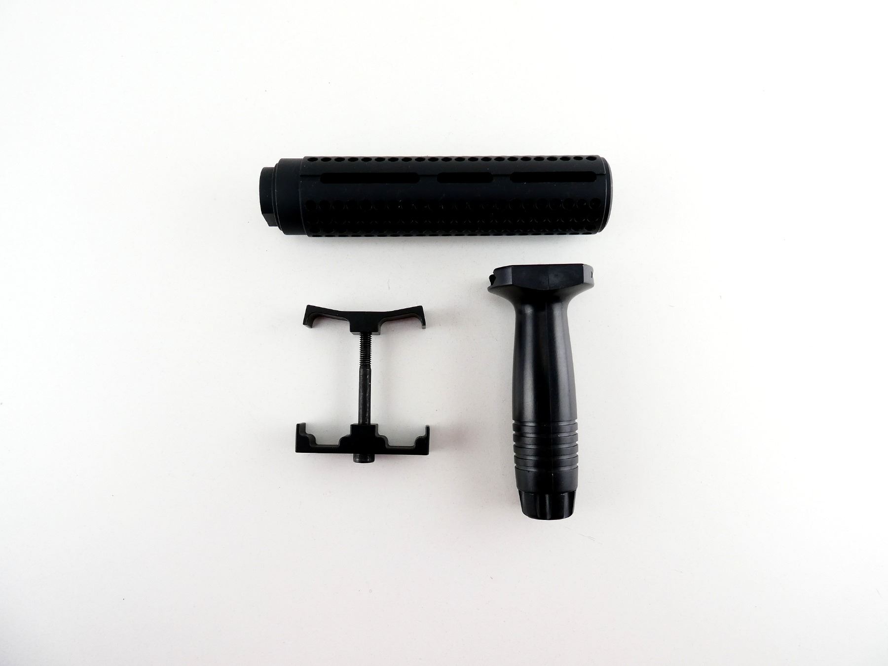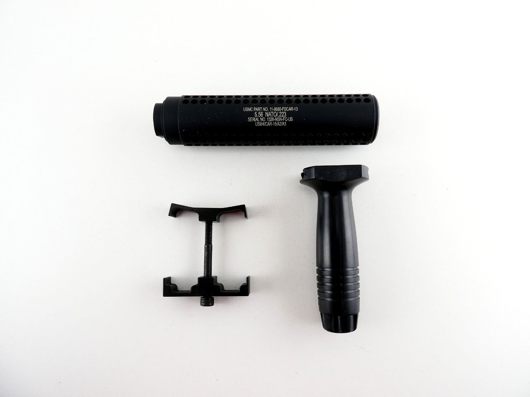LOT INCLUDES; (1) BLACK POLYMER VERTICAL GRIP, (1) PMAG DOUBLE-MAG GRIP & (1) THREAD-ON BLACK ALLOY BARREL EXTENSION, VARIOUS MARKINGS, OVERALL LENGTH APPROX. 6.25". MAY REQUIRE FITTING. SEE PHOTOS.