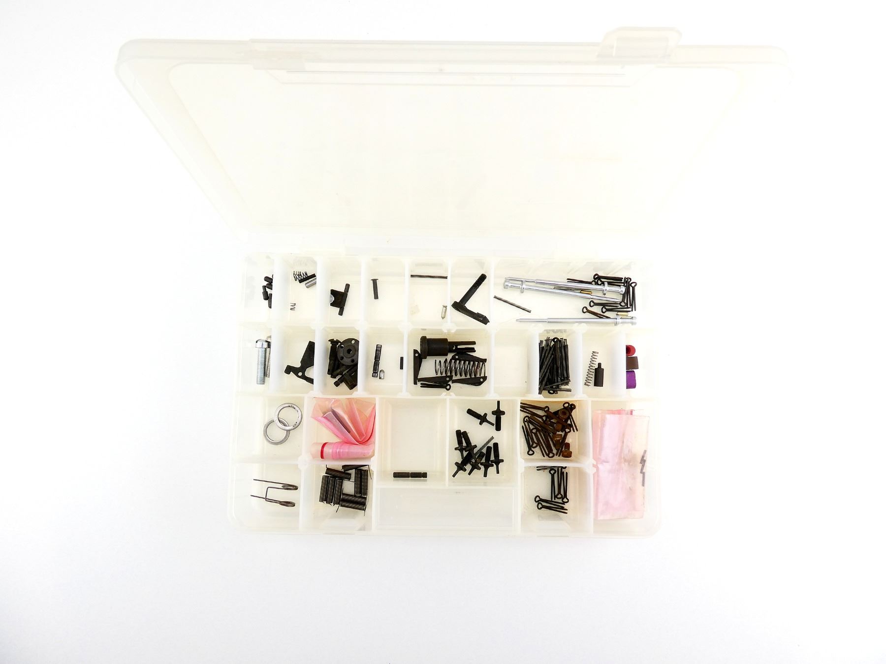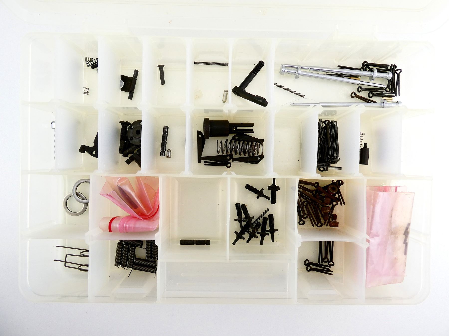 LOT INCLUDES; FIRING PINS WITH RETAINERS, FORWARD ASSIST, BOLT CATCH, GRIP SCREWS, FRONT SIGHTS, GAS KEYS, VARIOUS SCREWS / SPRINGS / PLUNGERS, ETC. MAY REQUIRE FITTING. SEE PHOTOS.