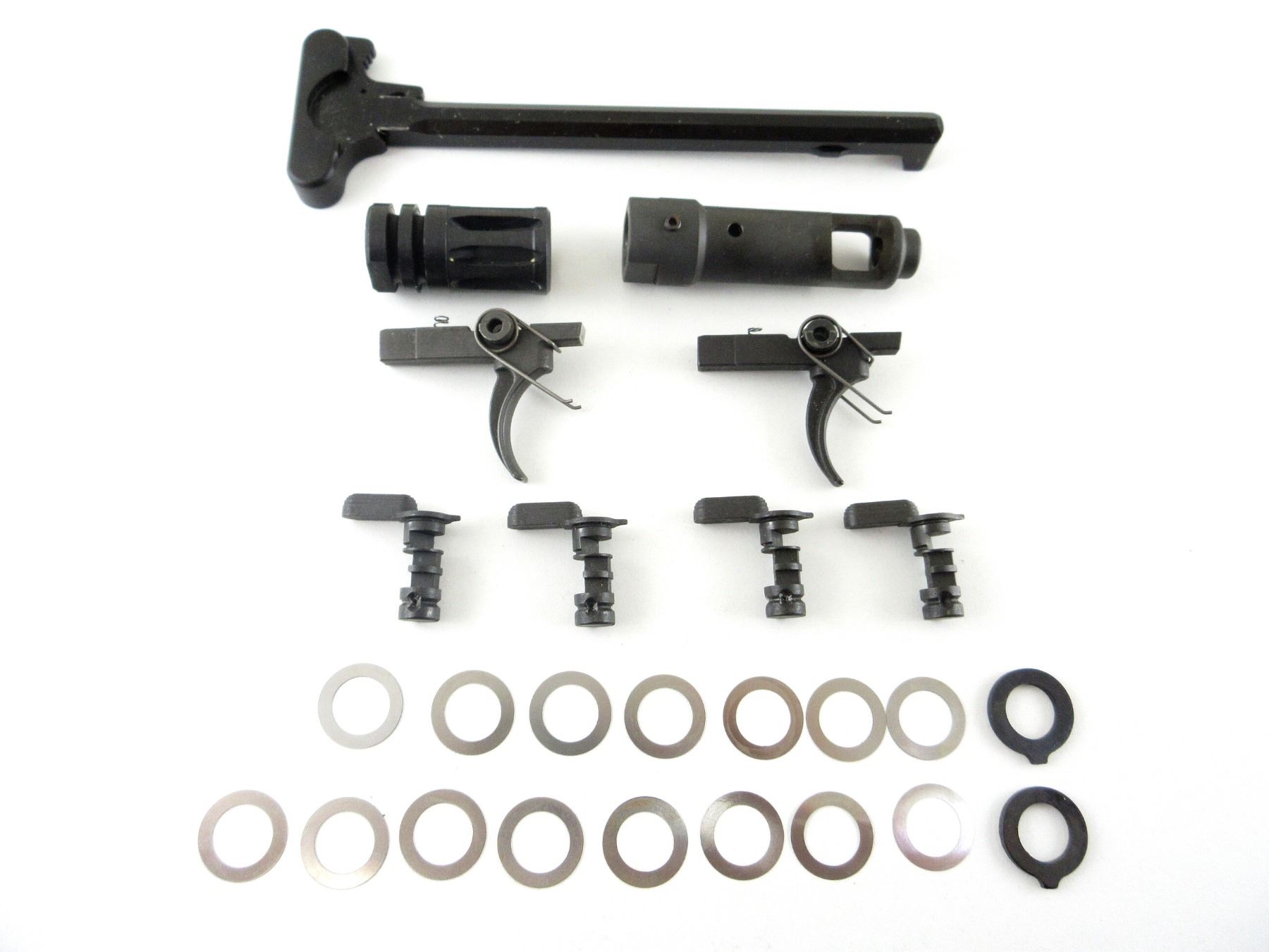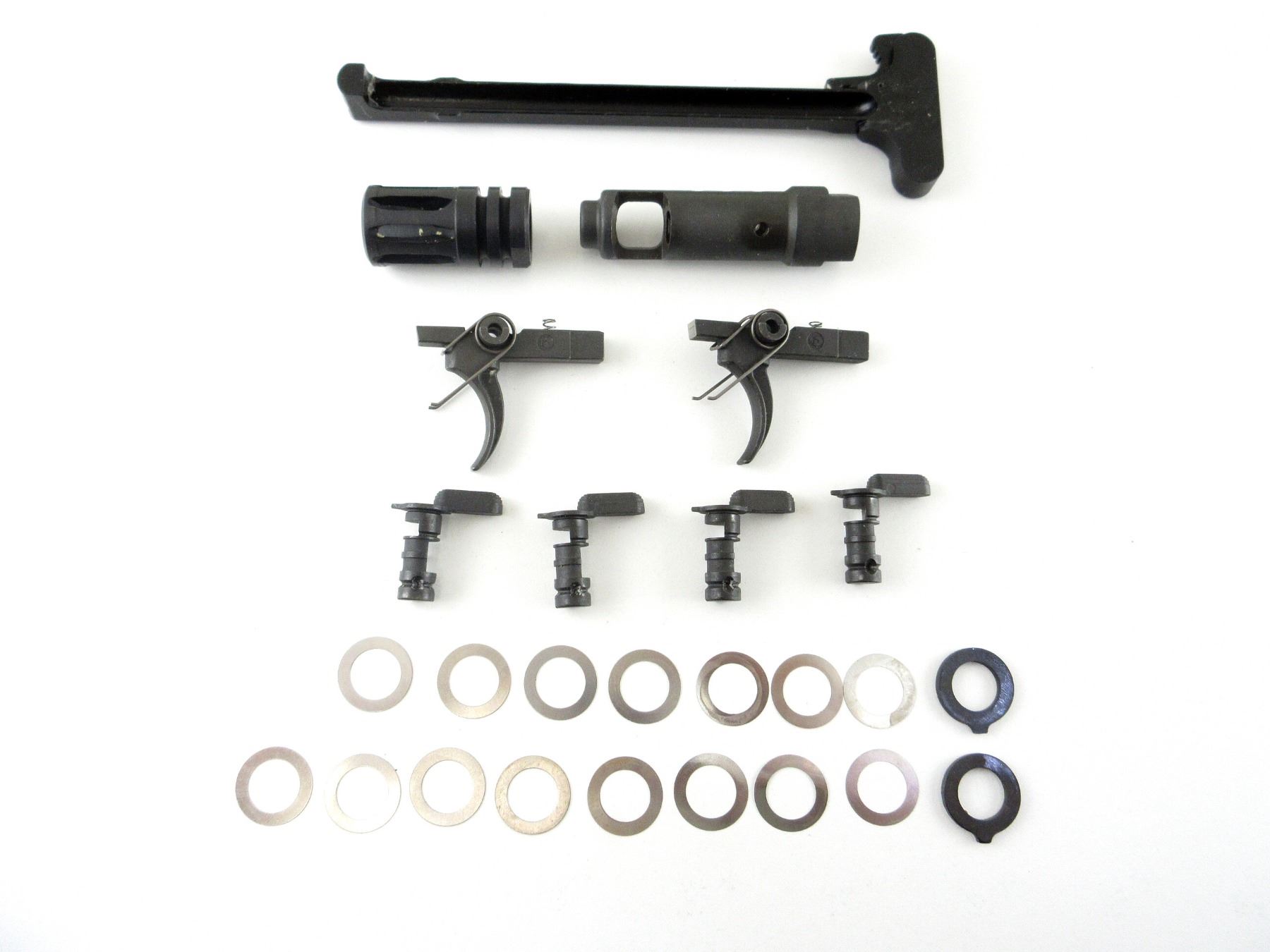 LOT INCLUDES; TRIGGERS WITH SPRINGS, SAFETIES, FLASH HIDER, WASHERS, COCKING HANDLE, AK74 STYLE MUZZLE BRAKE, ETC. MAY REQUIRE FITTING. SEE PHOTOS.