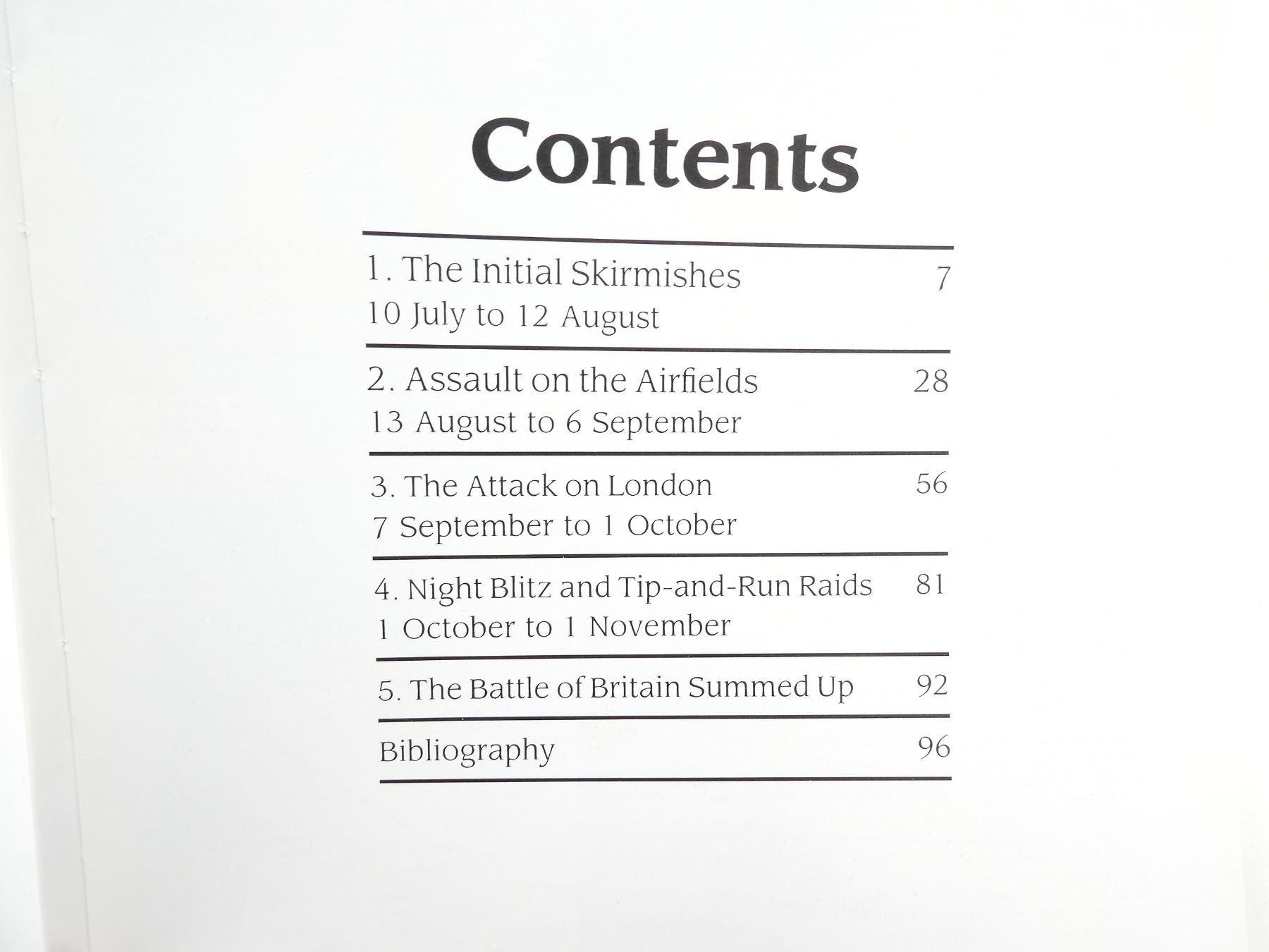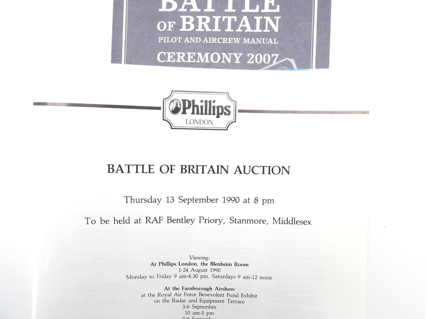 SOFT COVERS, LOT INCLUDES; (1) "BATTLE OF BRITAIN PILOT AND AIRCREW MANUAL, CEREMONY 2007" BOOKLET, (1) "BATTLE OF BRITAIN AUCTION" BOOKLET, (1) "BATTLE OF BRITAIN 50TH ANNIVERSARY" BOOKLET, (1) "BATTLE OF BRITAIN" BOOK BY ALFRED PRICE, ISBN: 0-85079-198-7 & "BATTLE OF BRITAIN" FOLDER. SEE PHOTOS.
