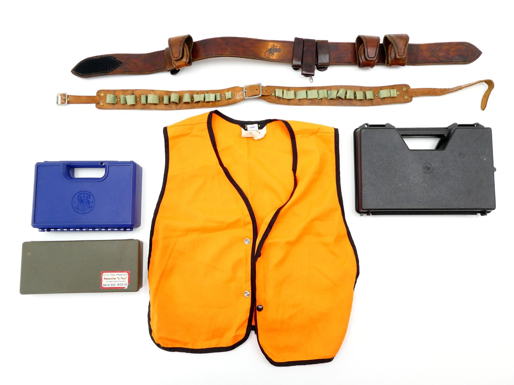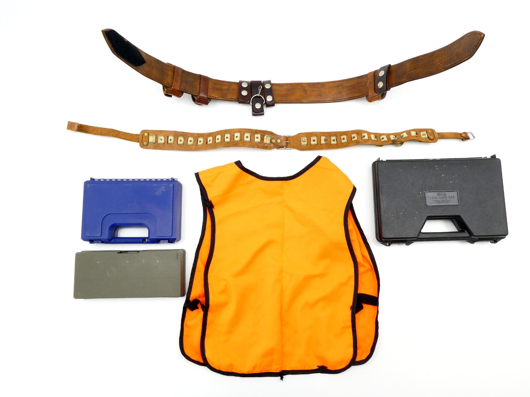 LOT INCLUDES; (1) BROWN LEATHER BELT WITH ATTACHMENTS, (1) AMMUNITION BELT, (1) HUNTING SAFETY VEST, SHOULDER LENGTH APPROX. 18", (2) HANDGUN FOAM CASES, ONE BLACK APPROX. 12" X 7.5" X 2" & ONE BLUE APPROX. 8.5" X 5.5" X 1.75" & (1) SPEED LOADER HOLDER, APPROX. 10" X 4" X 1.5". SEE PHOTOS.