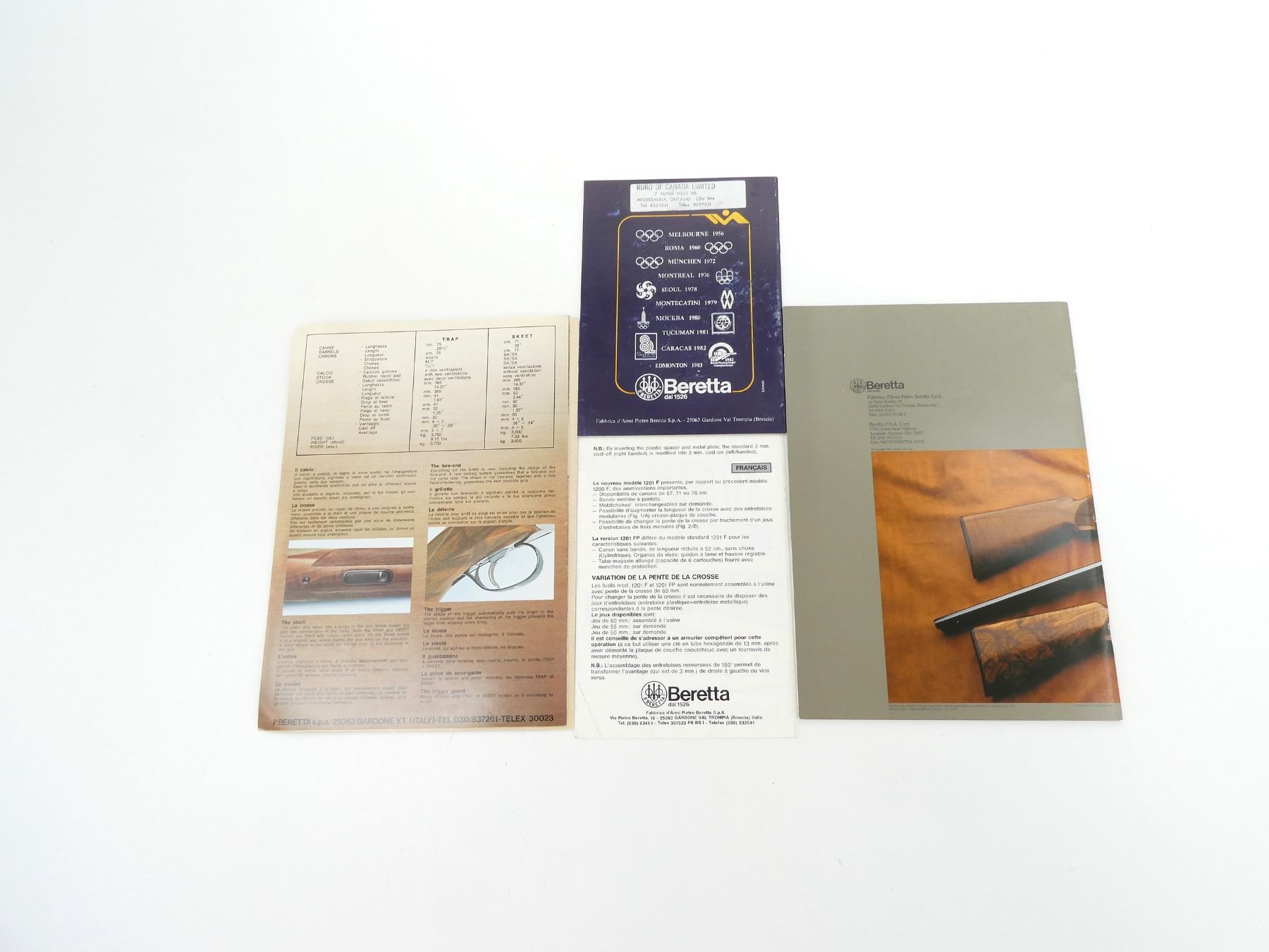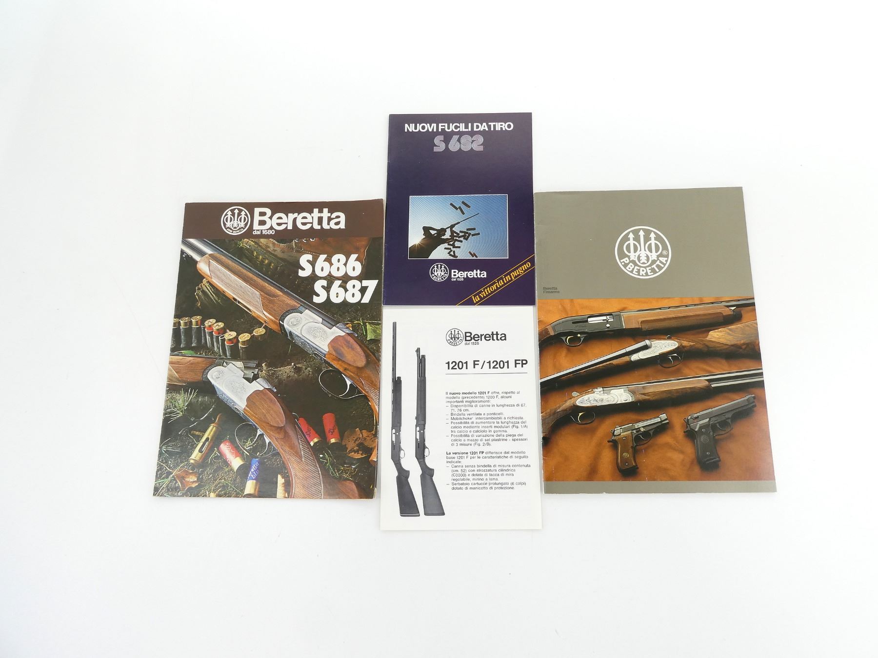 SOFT COVERS, LOT INCLUDES; (1) "BERETTA S680 TRAP & SKEET" BROCHURE, (1) "BERETTA S686, S687" BROCHURE, (1) "BERETTA 1201 F / 1201 FP" BROCHURE, (1) "BERETTA NUOVI FUCILI DA TRIO S 6S2" BOOKLET & (1) "BERETTA FIREARMS" CATALOGUE, COPYRIGHT 1985. SEE PHOTOS.