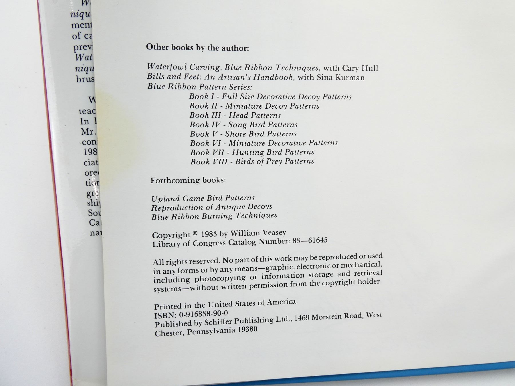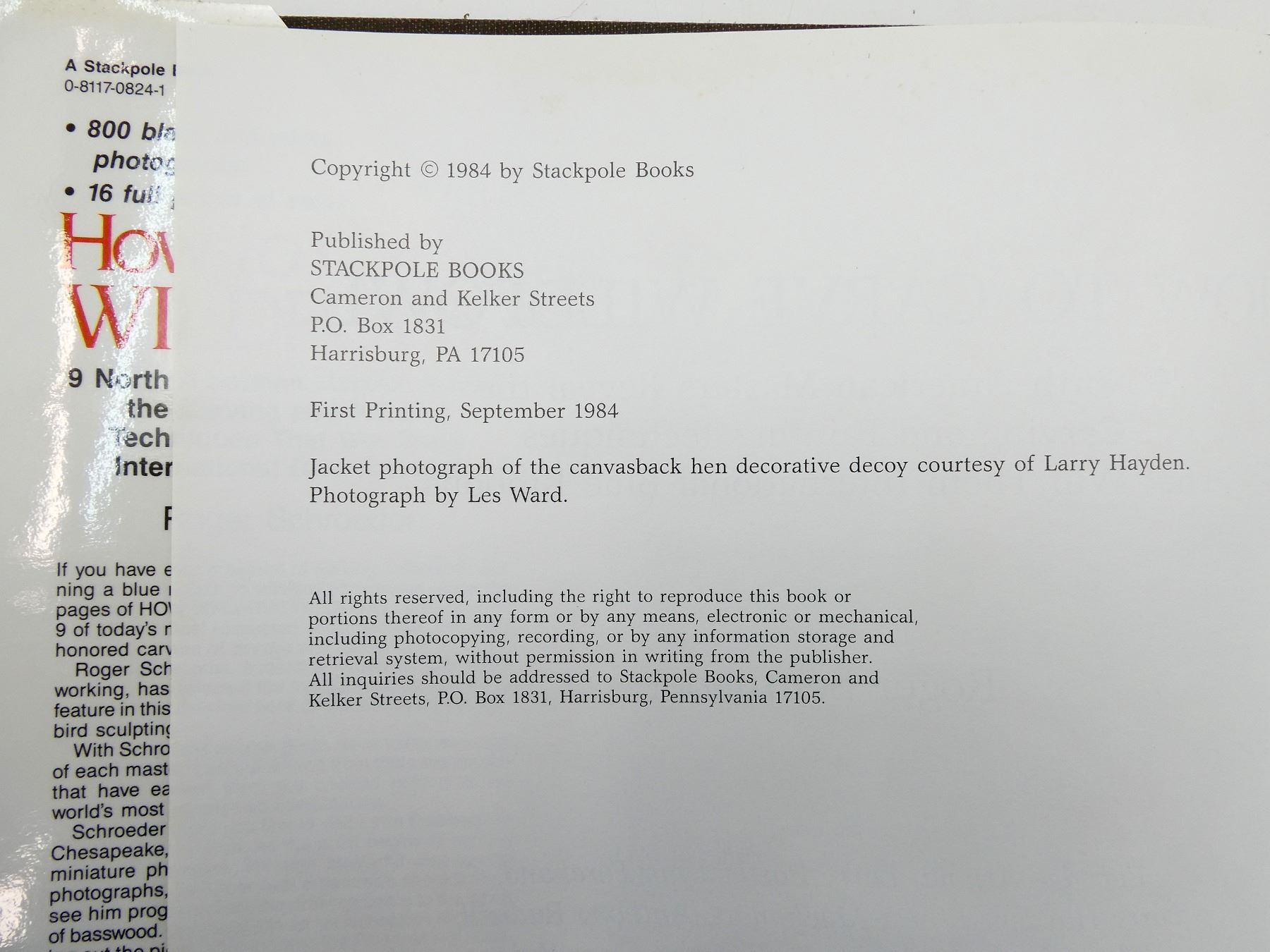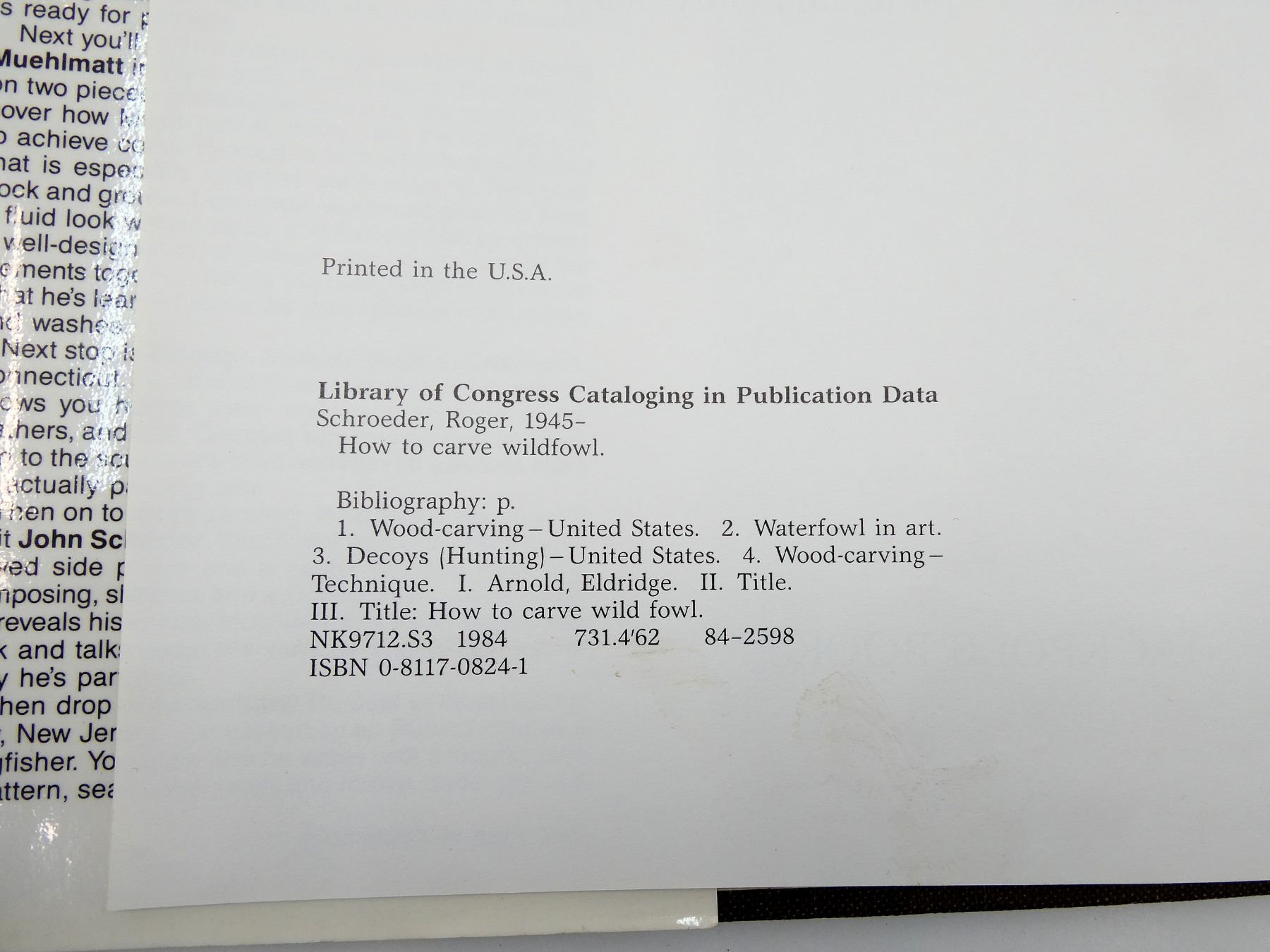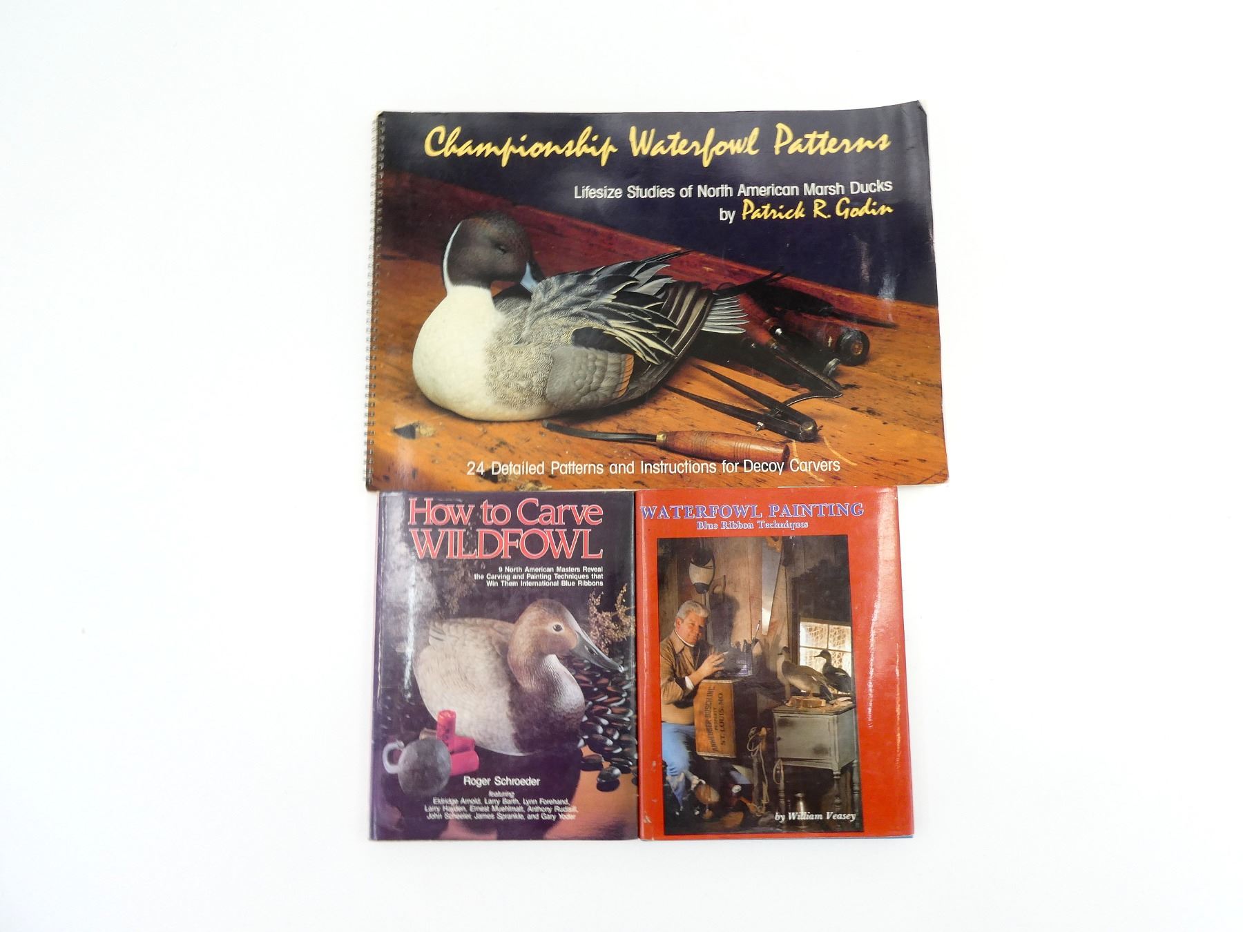 LOT INCLUDES; (1) "HOW TO CARVE WILDFOWL" BOOK BY ROGER SCHROEDER, HARD COVER WITH DUST COVER, ISBN: 0-8117-0824-1, (1) "WATERFOWL PAINTING" BOOK BY WILLIAM VEASEY, HARD COVER WITH DUST COVER, ISBN: 0-916838-90-0 & (1) "CHAMPIONSHIP WATERFOWL PATTERNS" BOOK BY PATRICK R. GODIN, SPIRAL BOUND SOFT COVER, ISBN: 0-9692841-0-1. SEE PHOTOS.