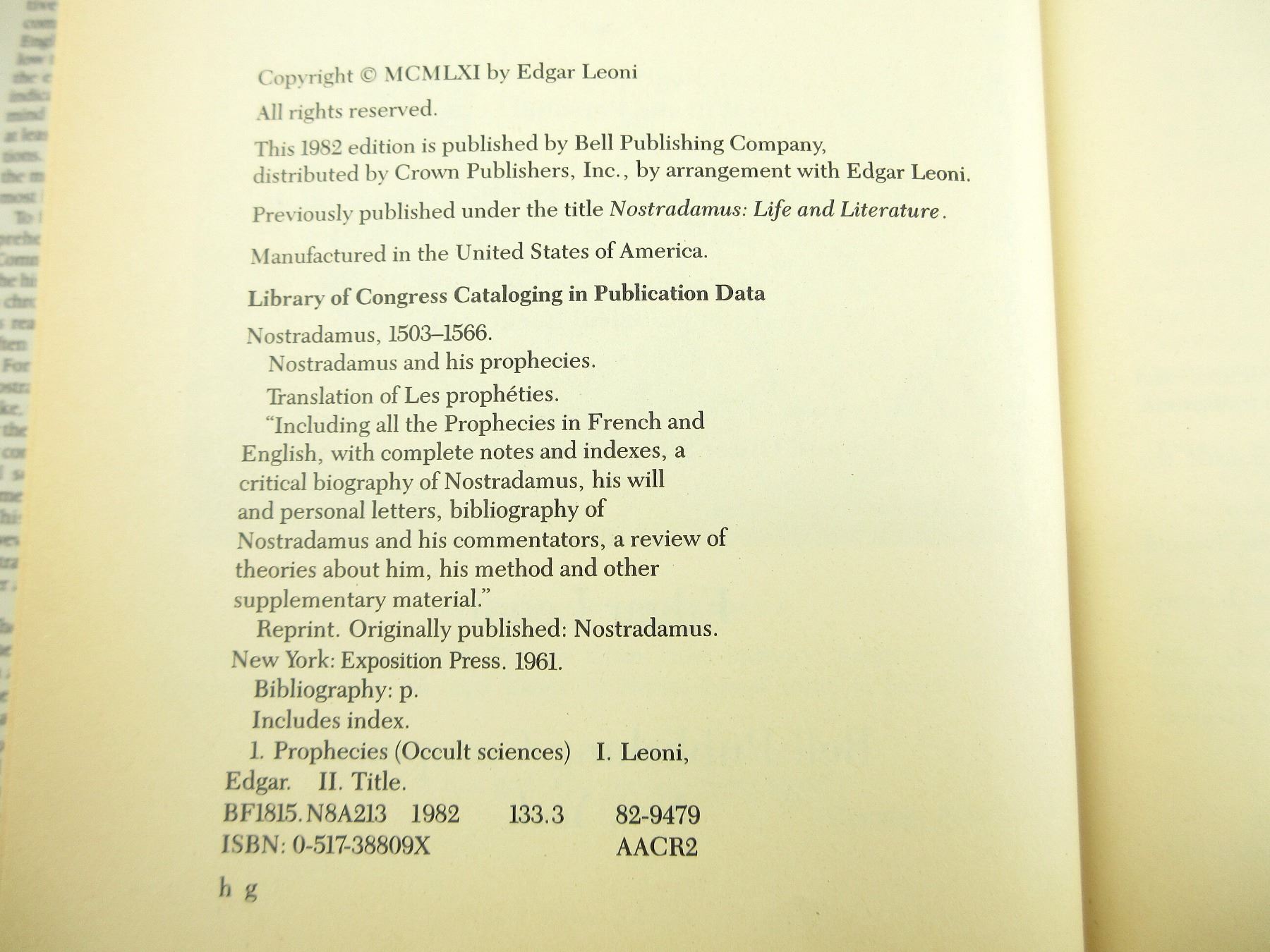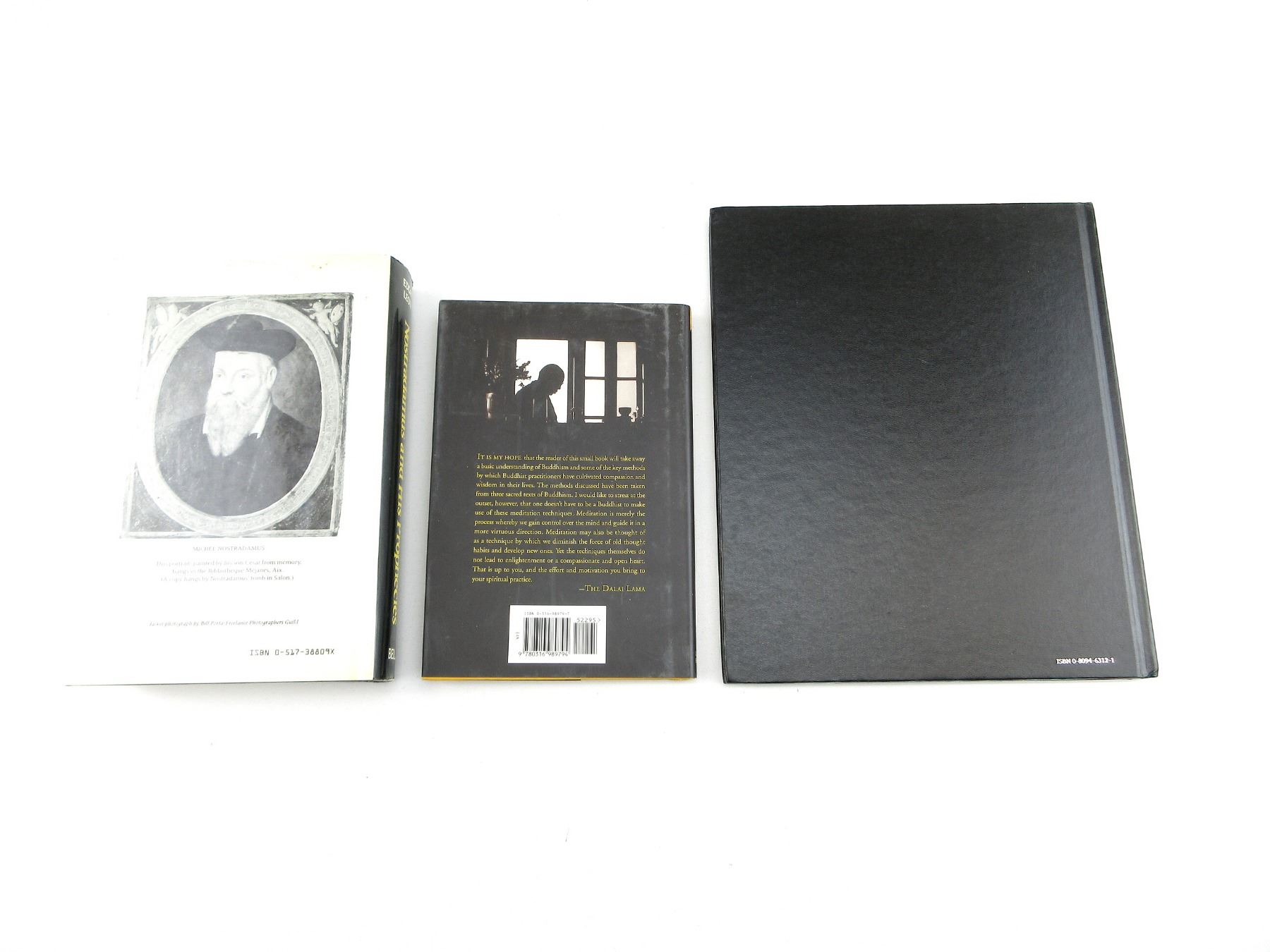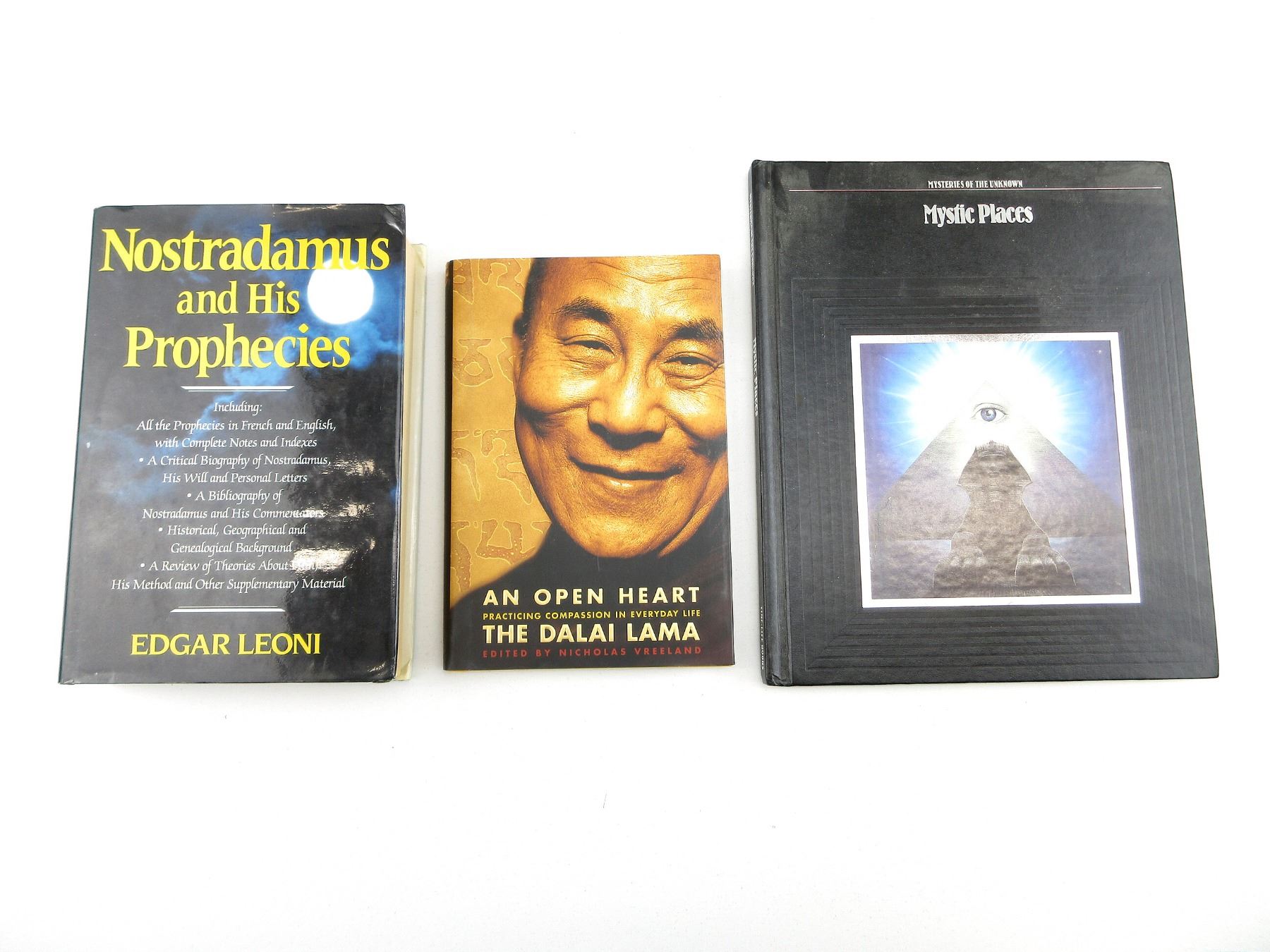 LOT INCLUDES; (1) "NOSTRADAMUS AND HIS PROPHECIES" BOOK BY EDGAR LEONI, HARD COVER WITH DUST COVER, ISBN: 0-517-38809X, (1) "AN OPEN HEART, THE DALAI LAMA, PRACTICING COMPASSION IN EVERYDAY LIFE" BOOK EDITED BY NICHOLAS VREELAND, HARD COVER WITH DUST COVER, ISBN: 0-316-98979-7 & (1) "MYSTIC PLACES, MYSTERIES OF THE UNKNOWN" BOOK BY THE EDITORS OF TIME-LIFE BOOKS, ISBN: 0-8094-6312-1. SEE PHOTOS.