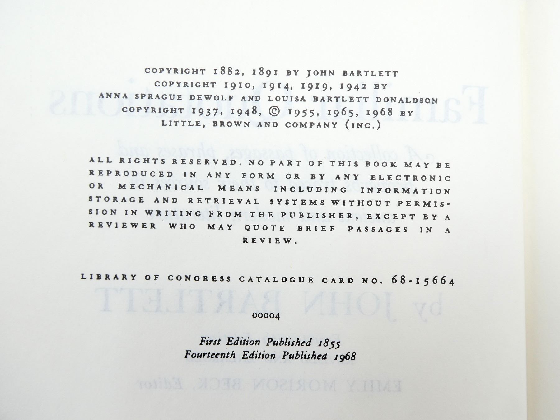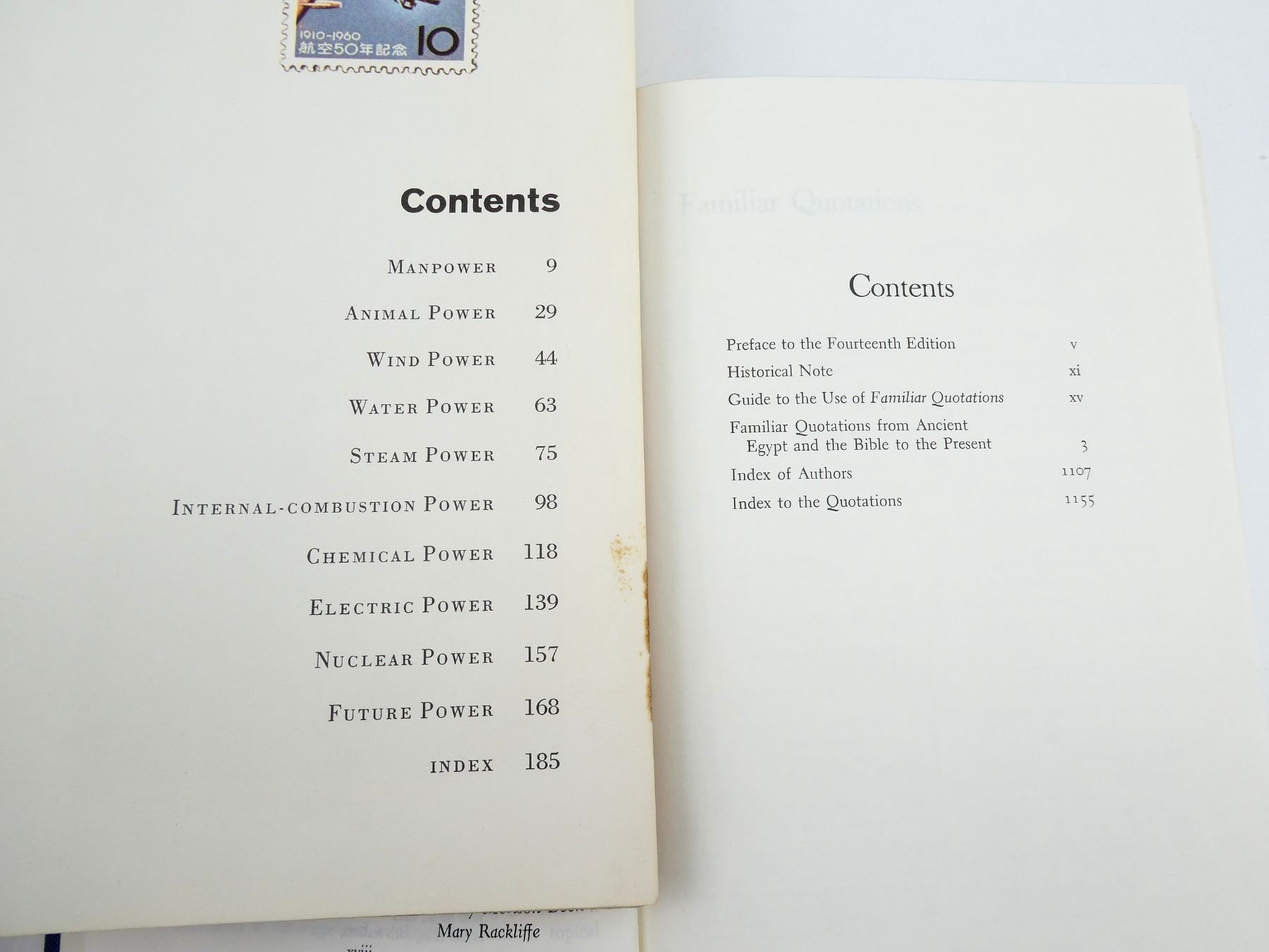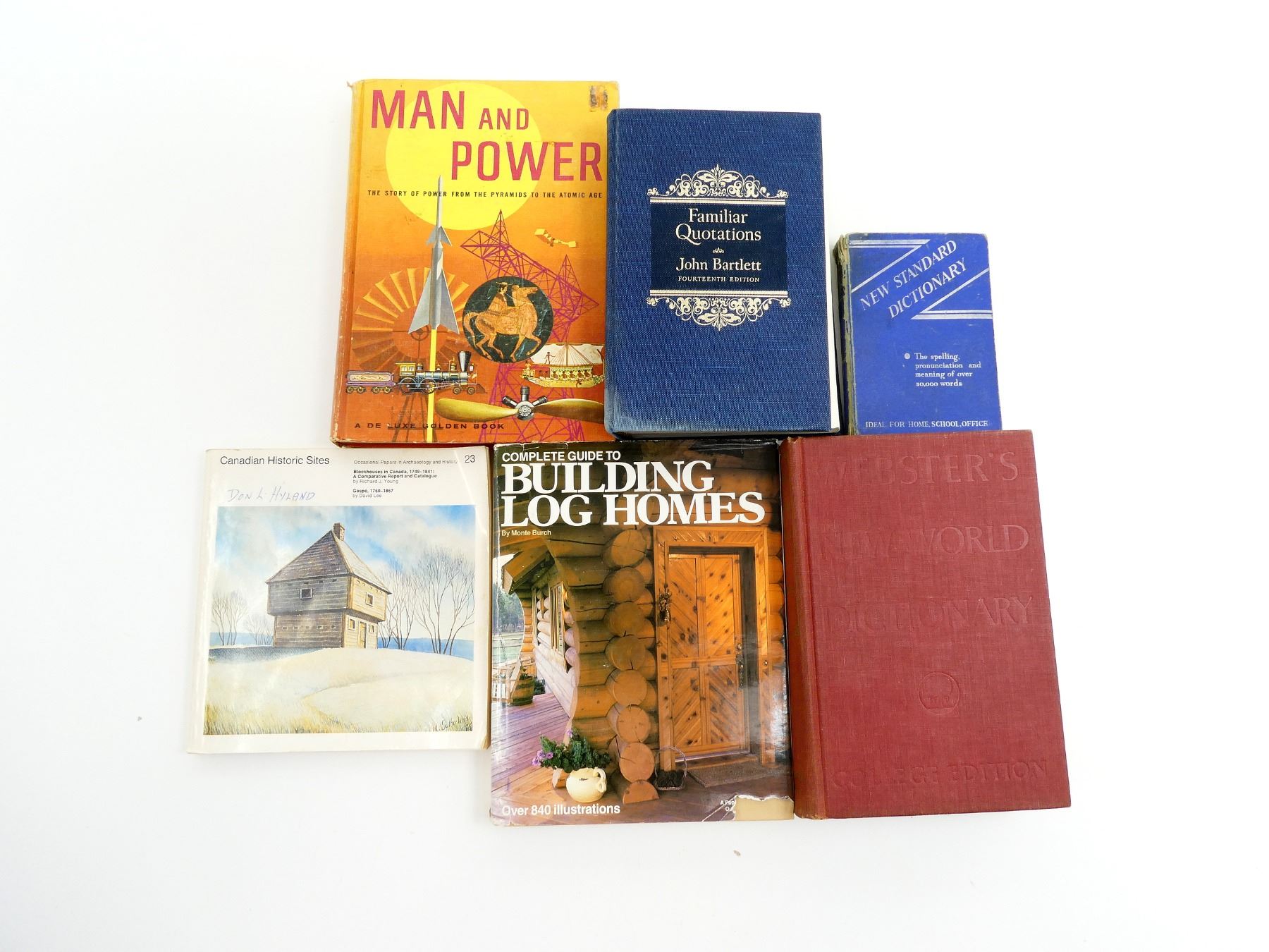 LOT INCLUDES; "THE STANDARD DICTIONARY" BOOK BY THE LITERARY PRESS GLASGOW, HARD COVER, (1) "WEBSTER'S NEW WORLD DICTIONARY COLLEGE EDITION" BOOK BY NELSON, FOSTER & SCOTT LTD, HARD COVER, COPYRIGHT 1959, (1) "FAMILIAR QUOTATIONS FOURTH EDITION" BOOK BY JOHN BARTLETT, HARD COVER, COPYRIGHT 1968, (1) "CANADIAN HISTORIC SITES" BOOK BY NATIONAL HISTORIC PARKS AND SITES, SOFT COVER, ISBN: 0-660-10298-6, (1) "MAN AND POWER" BOOK BY L. SPRAQUE DE CAMP, HARD COVER & (1) "COMPLETE GUIDE TO BUILDING LOG HOMES" BOOK BY MONTE BURCH, HARD COVER WITH DUST COVER, ISBN: 0-943822-27-0. SEE PHOTOS.